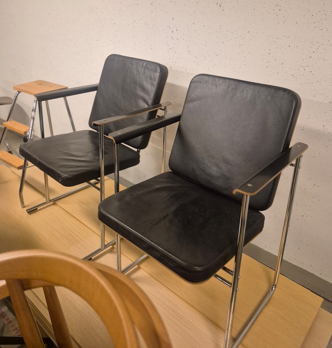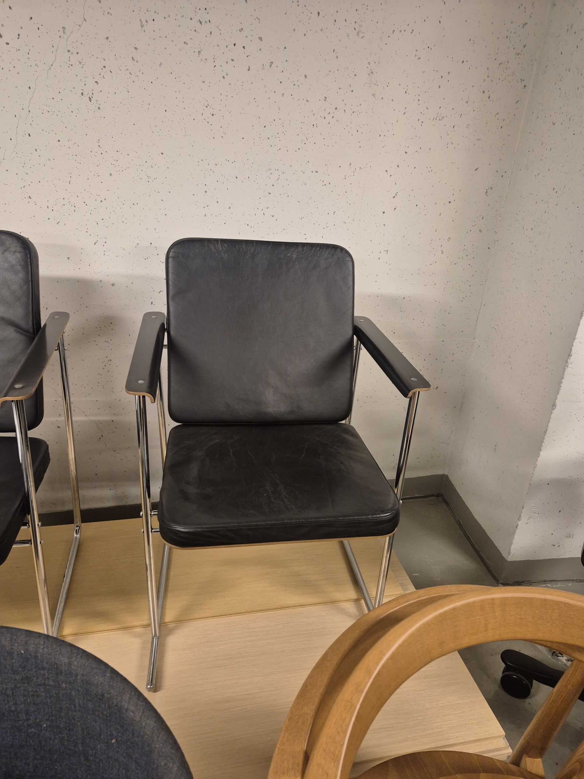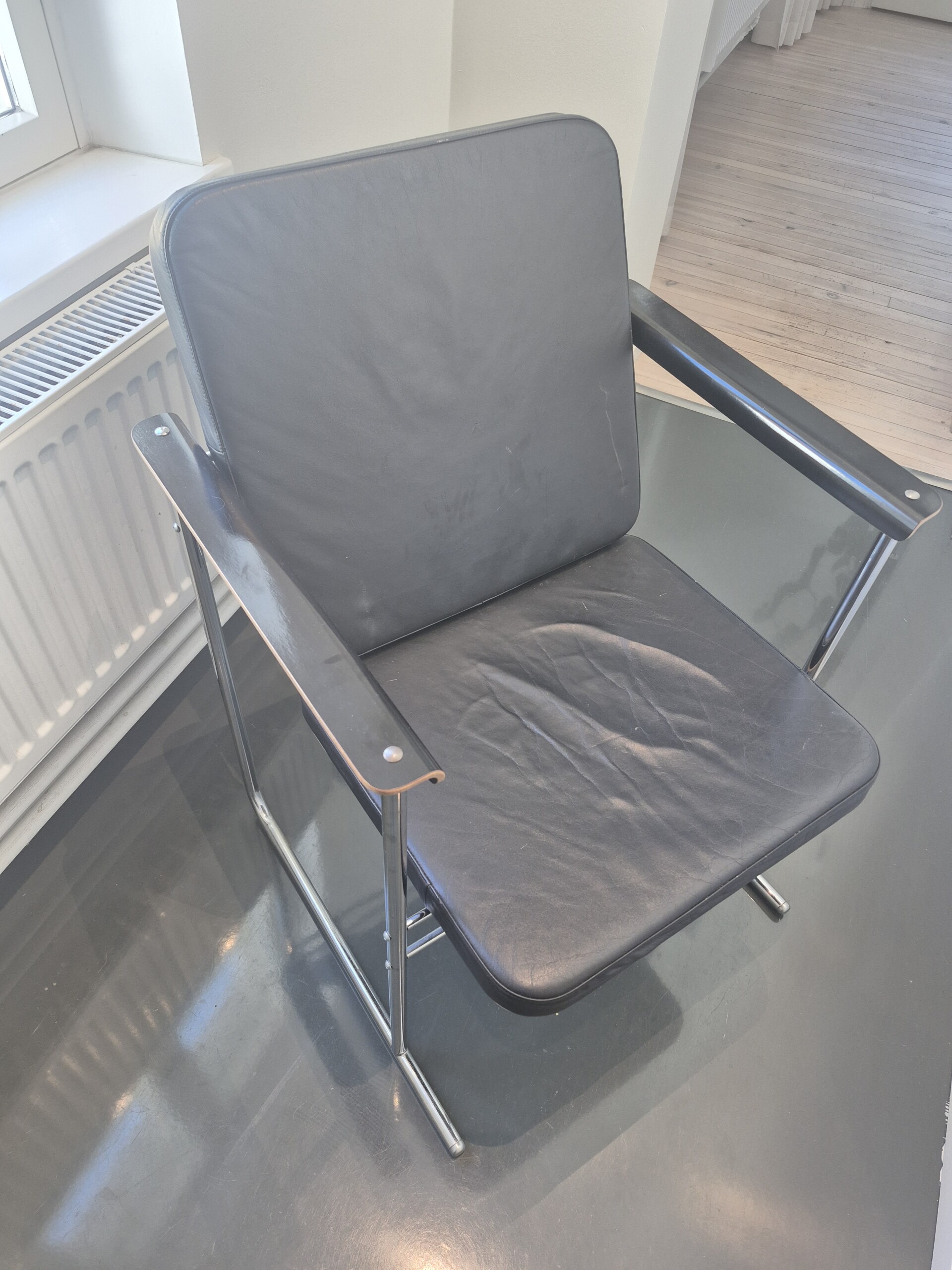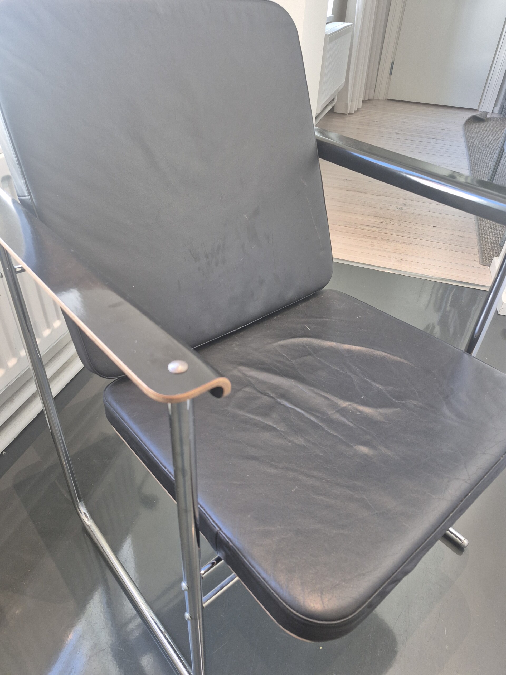 Sæde i læder (sort). Ryg i træ (sort). 4-bensstel i metal (krom).