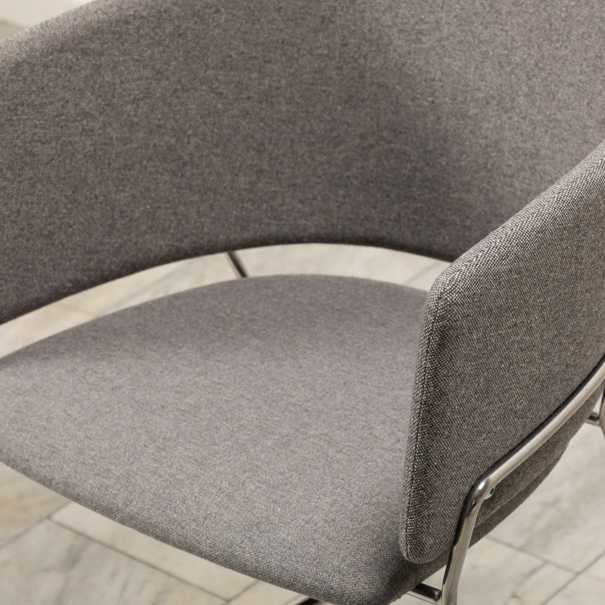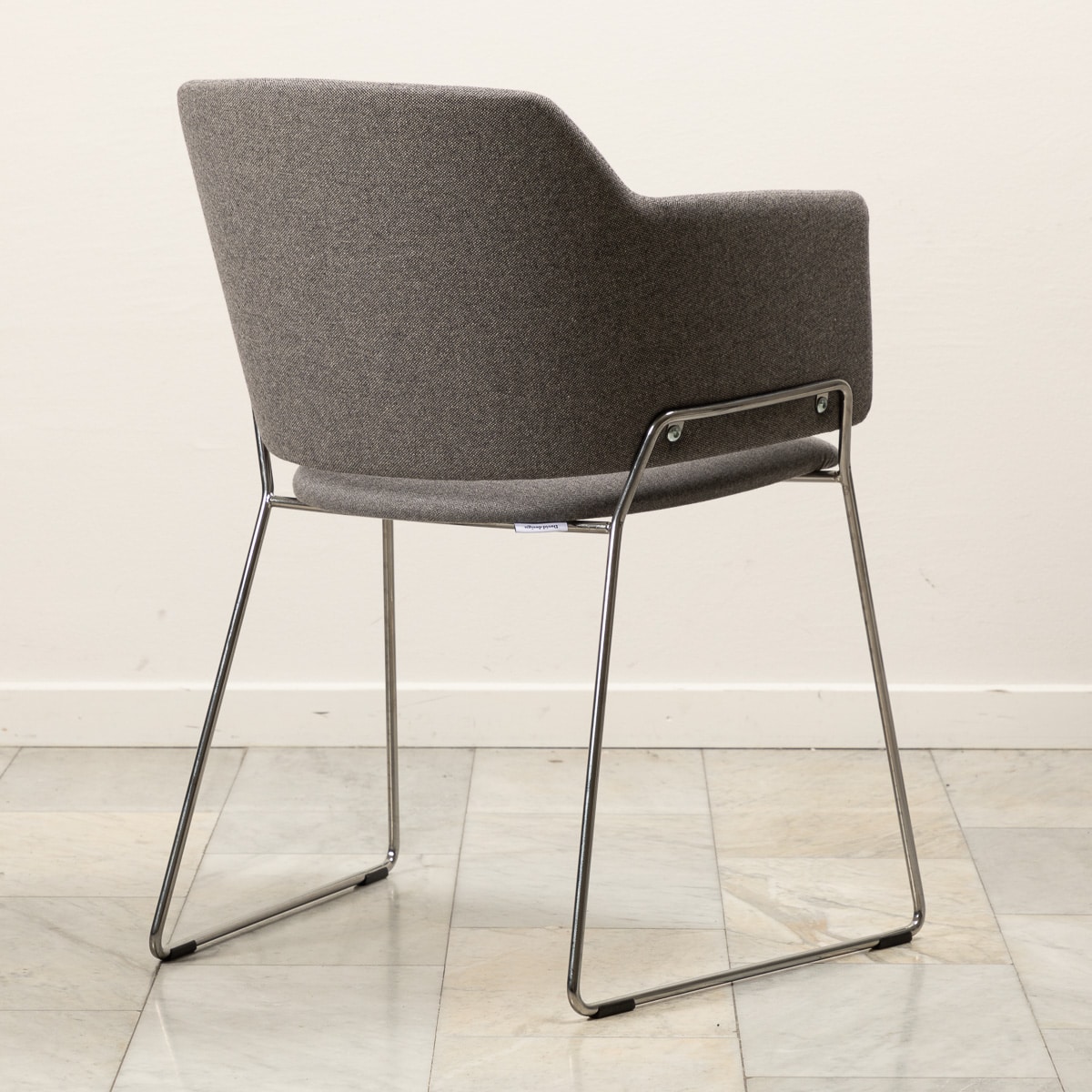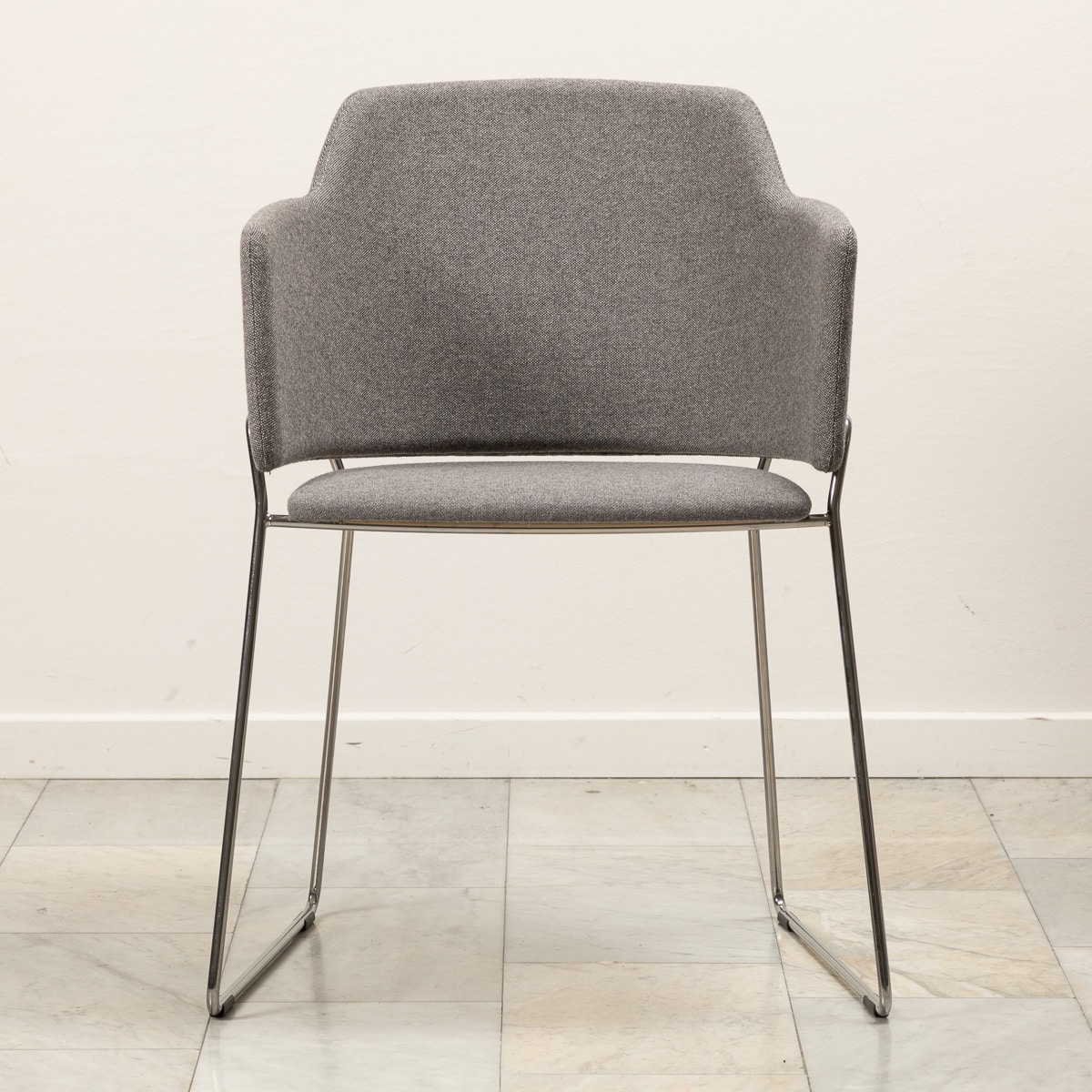 Sæde og ryg i stof (grå). Medestel i metal (krom).