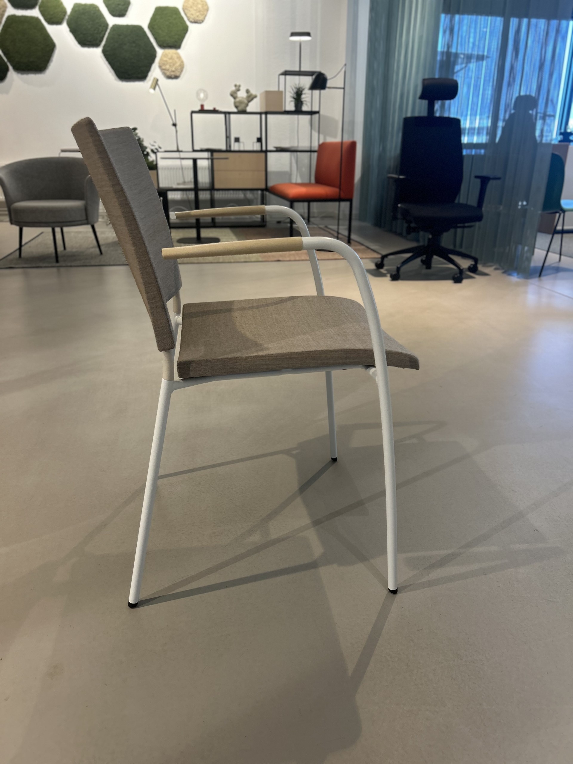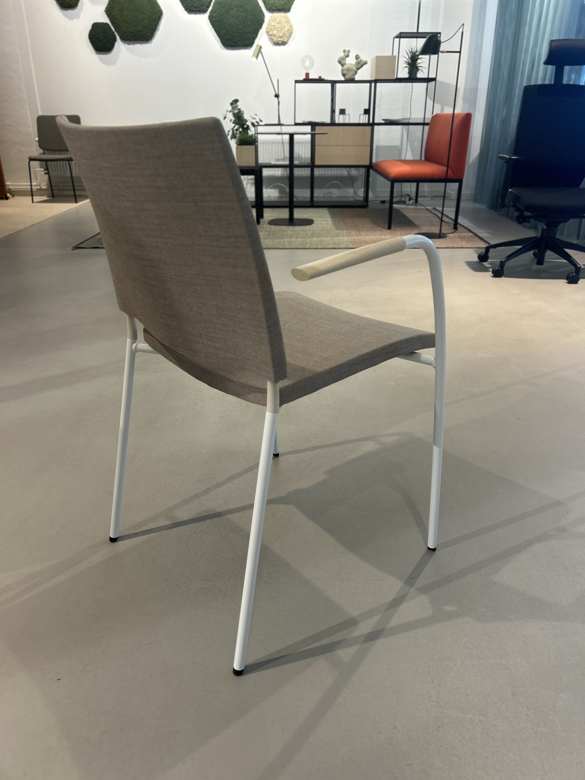 Sæde og ryg i stof (beige). 4-bensstel i metal (hvid).