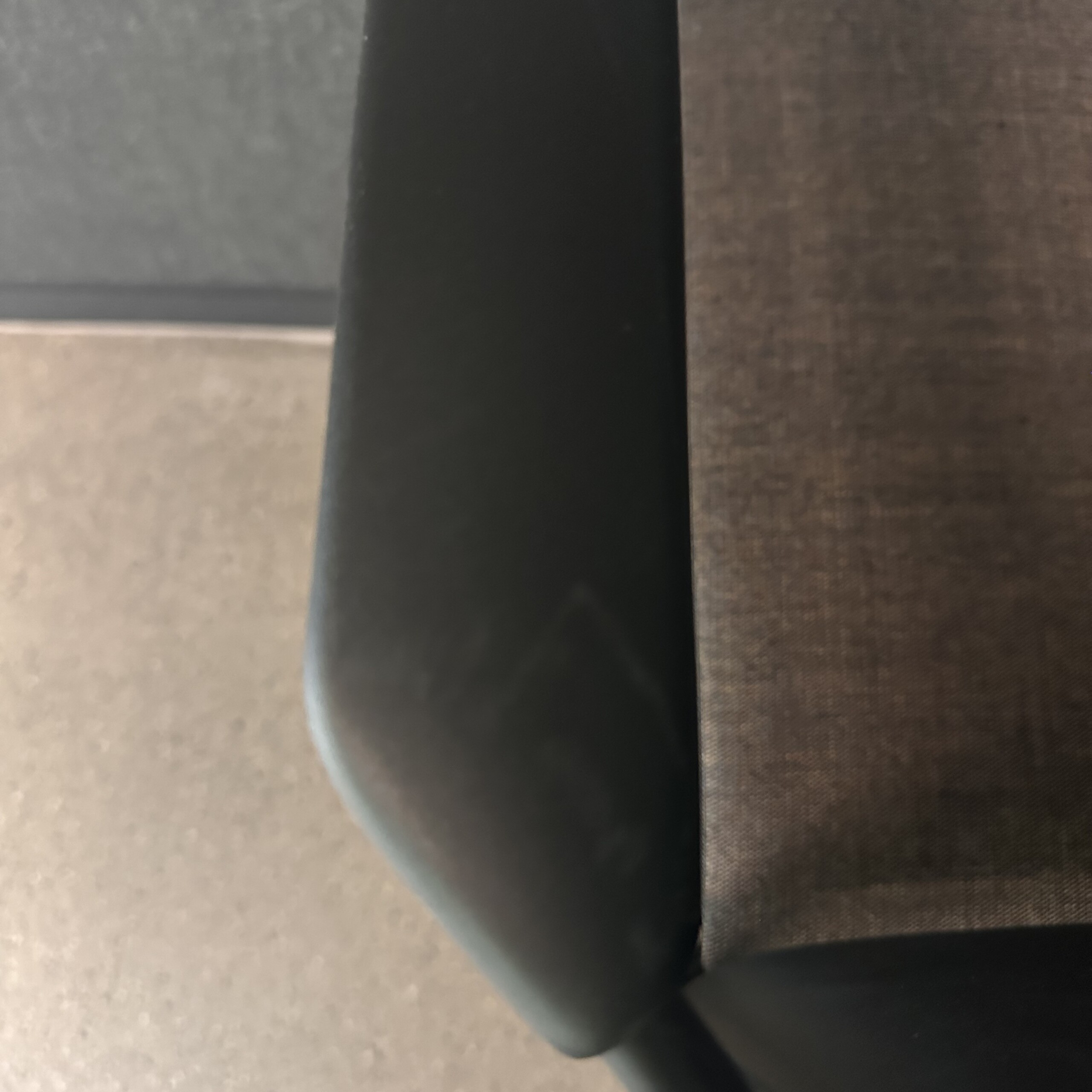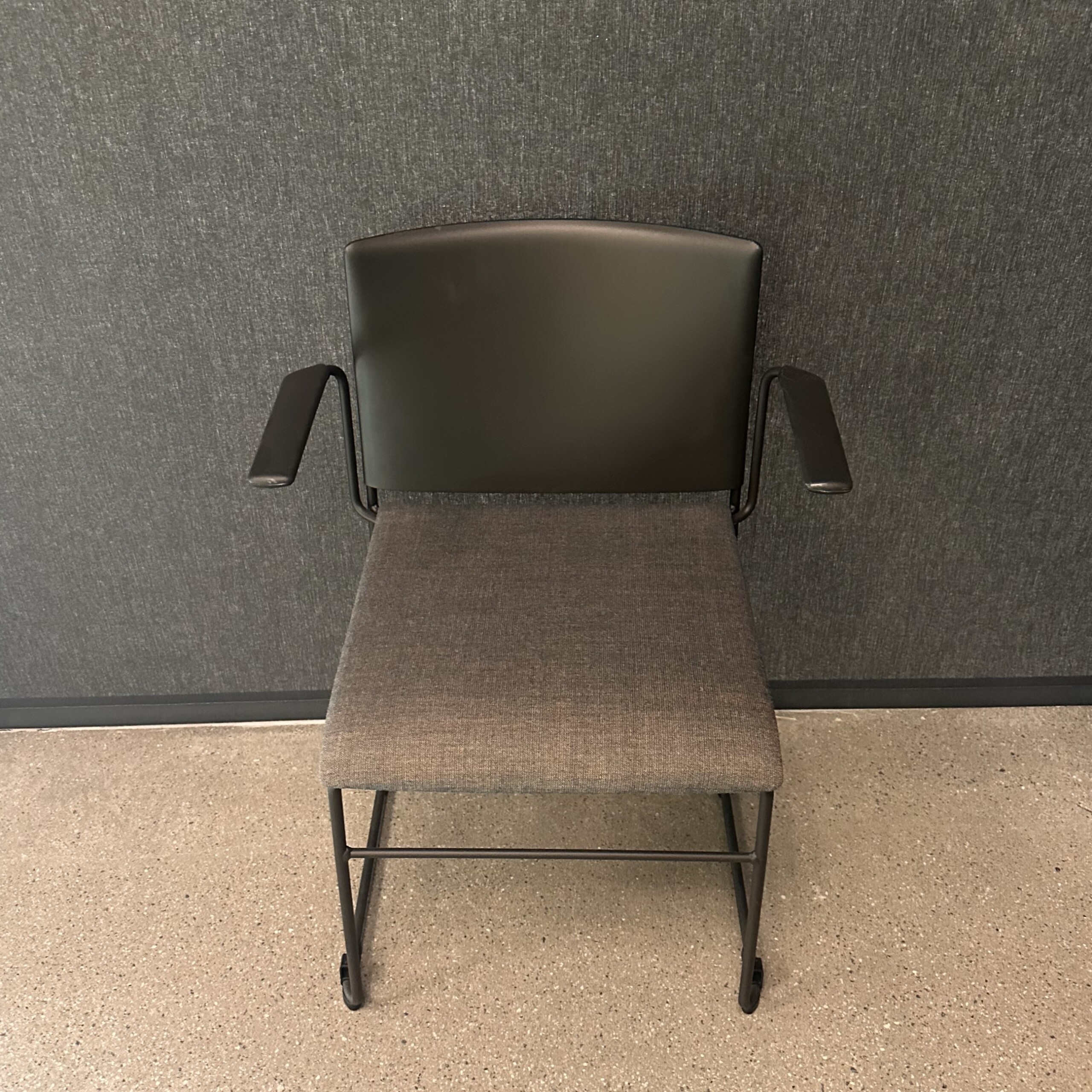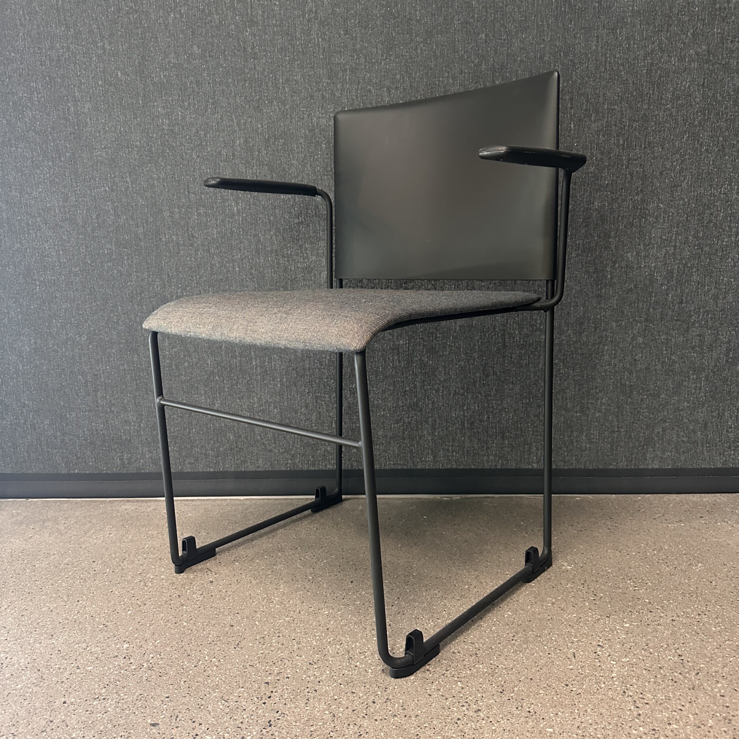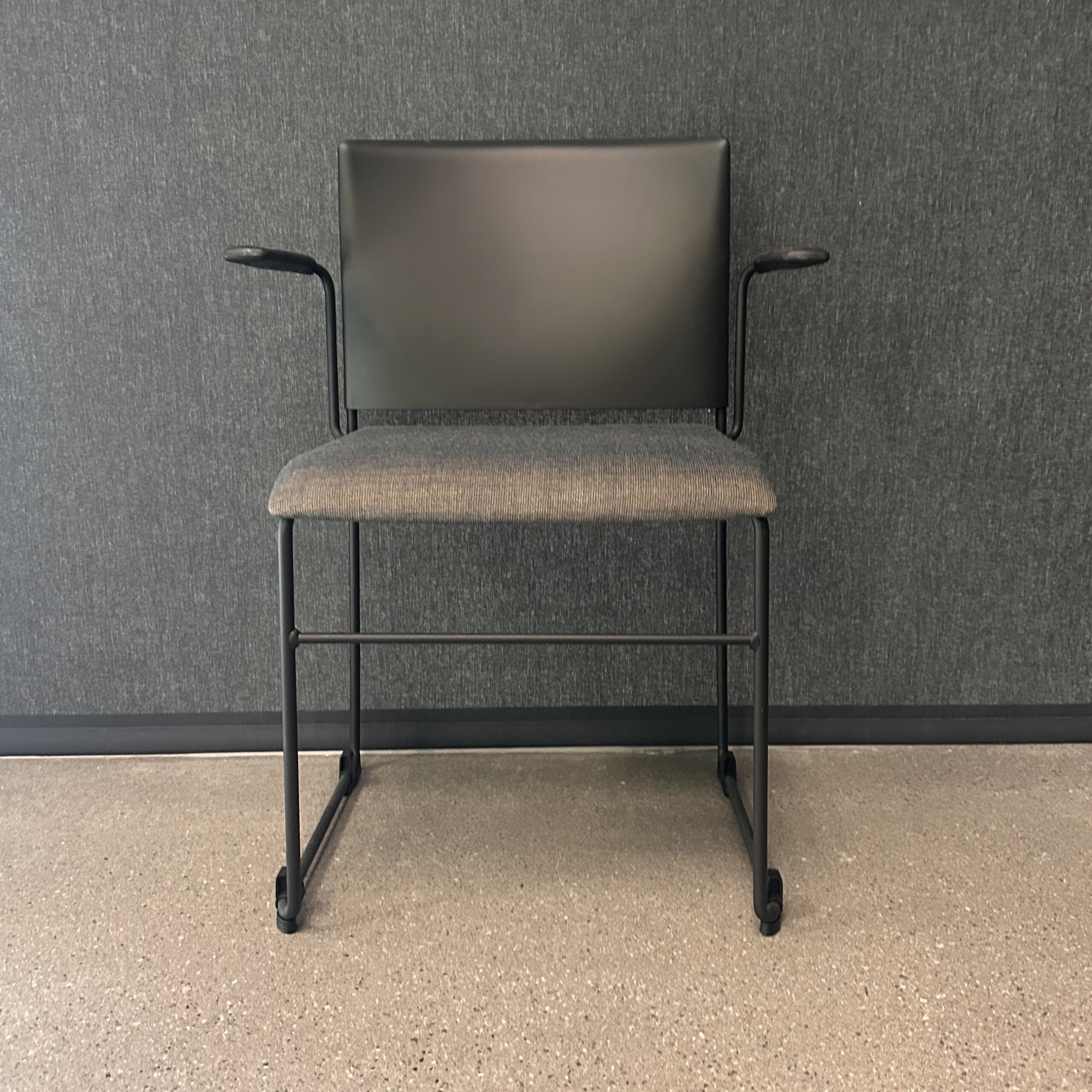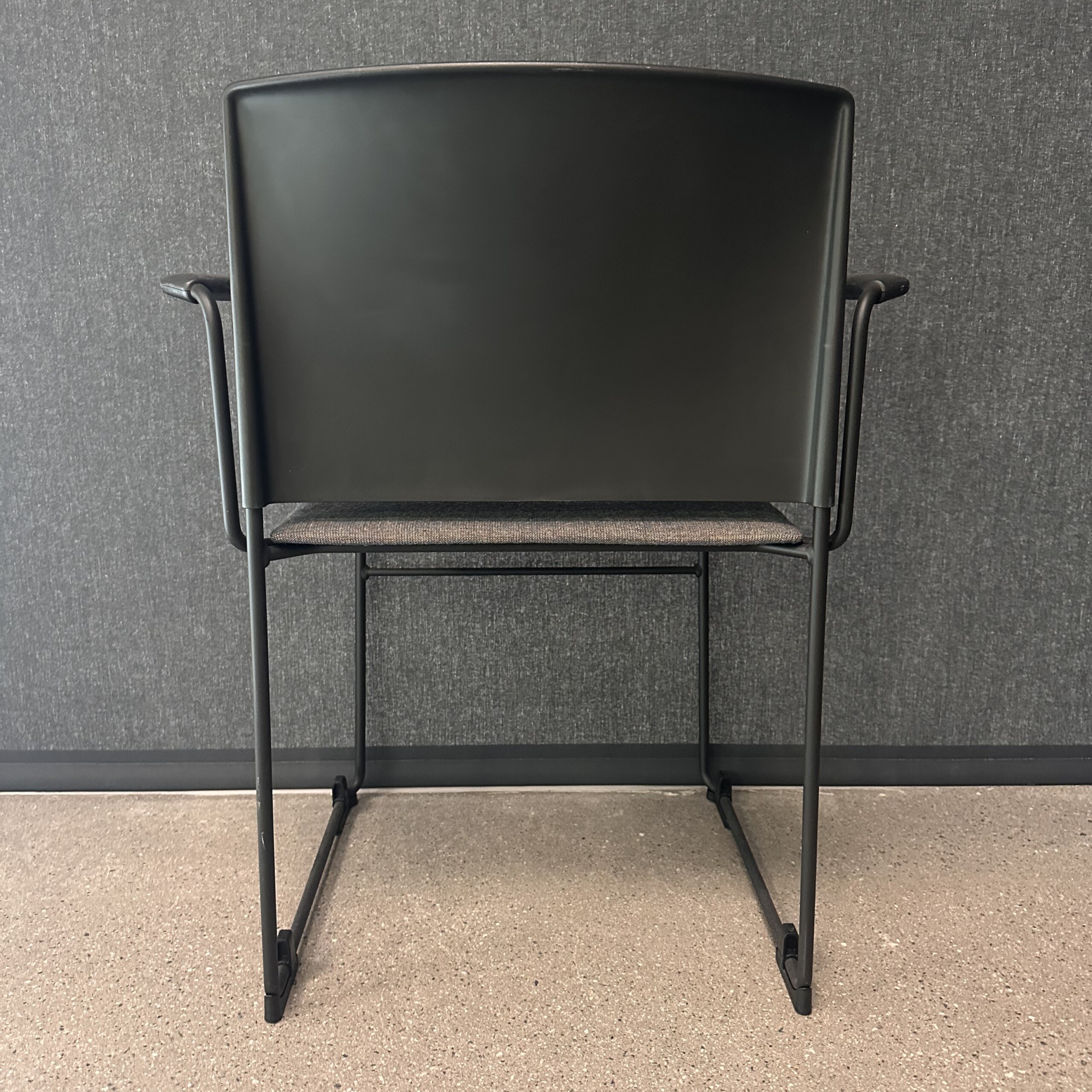 Sæde i stof (grå). Ryg i plast (sort). Medestel i metal (sort).