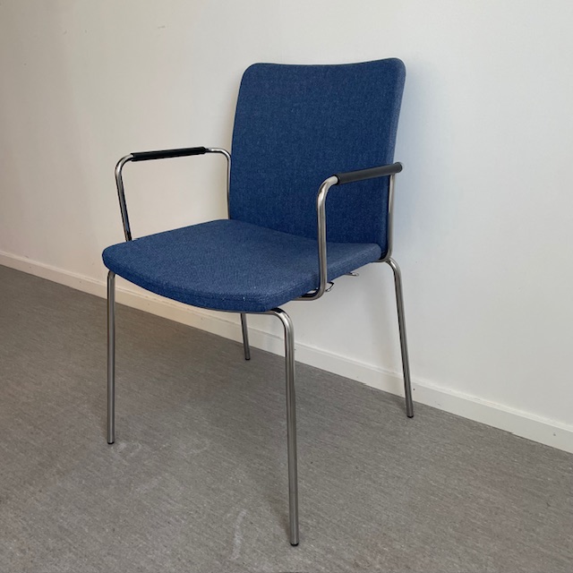 Sæde og ryg i stof (blå). 4-bensstel i metal (krom).