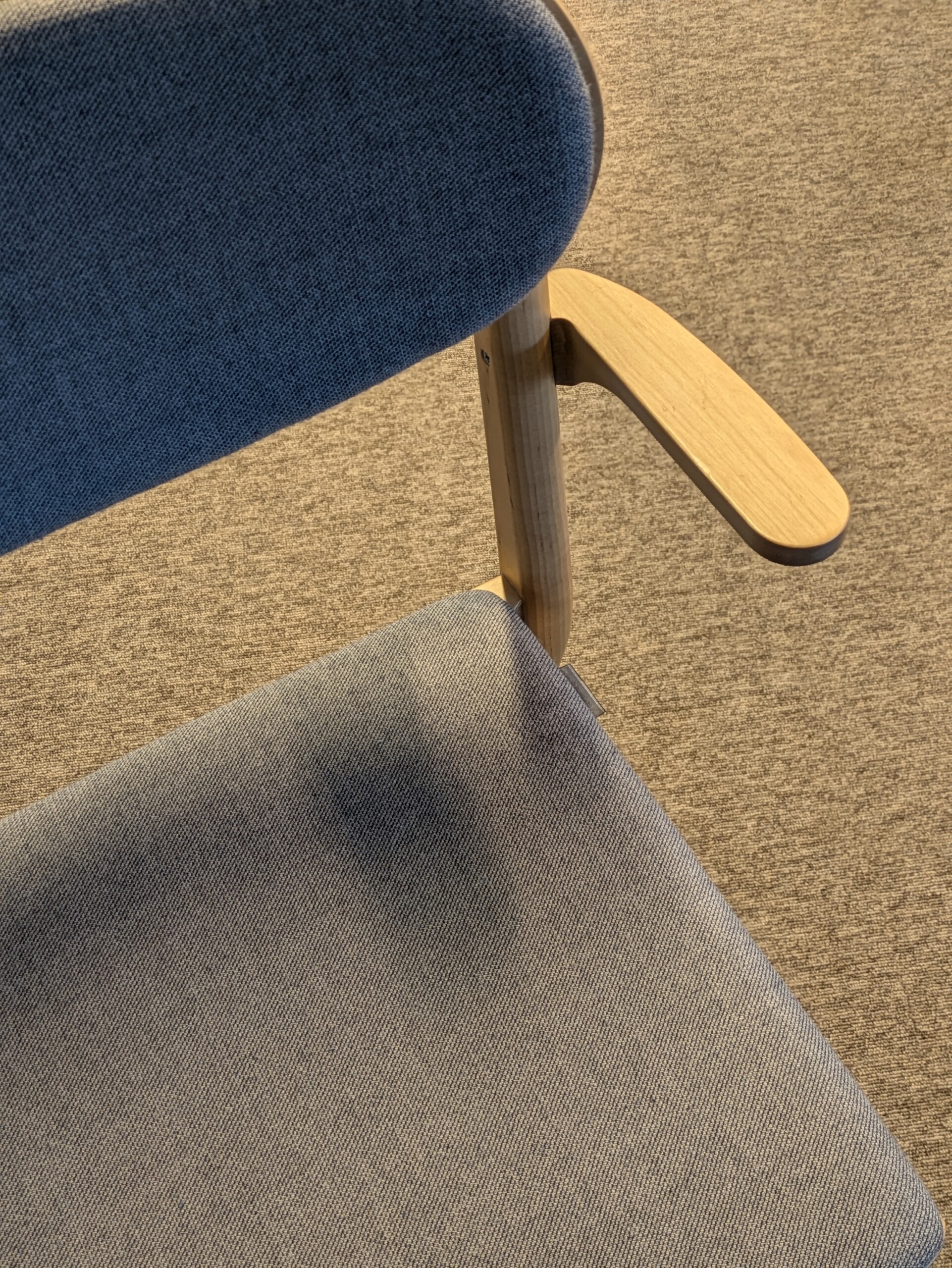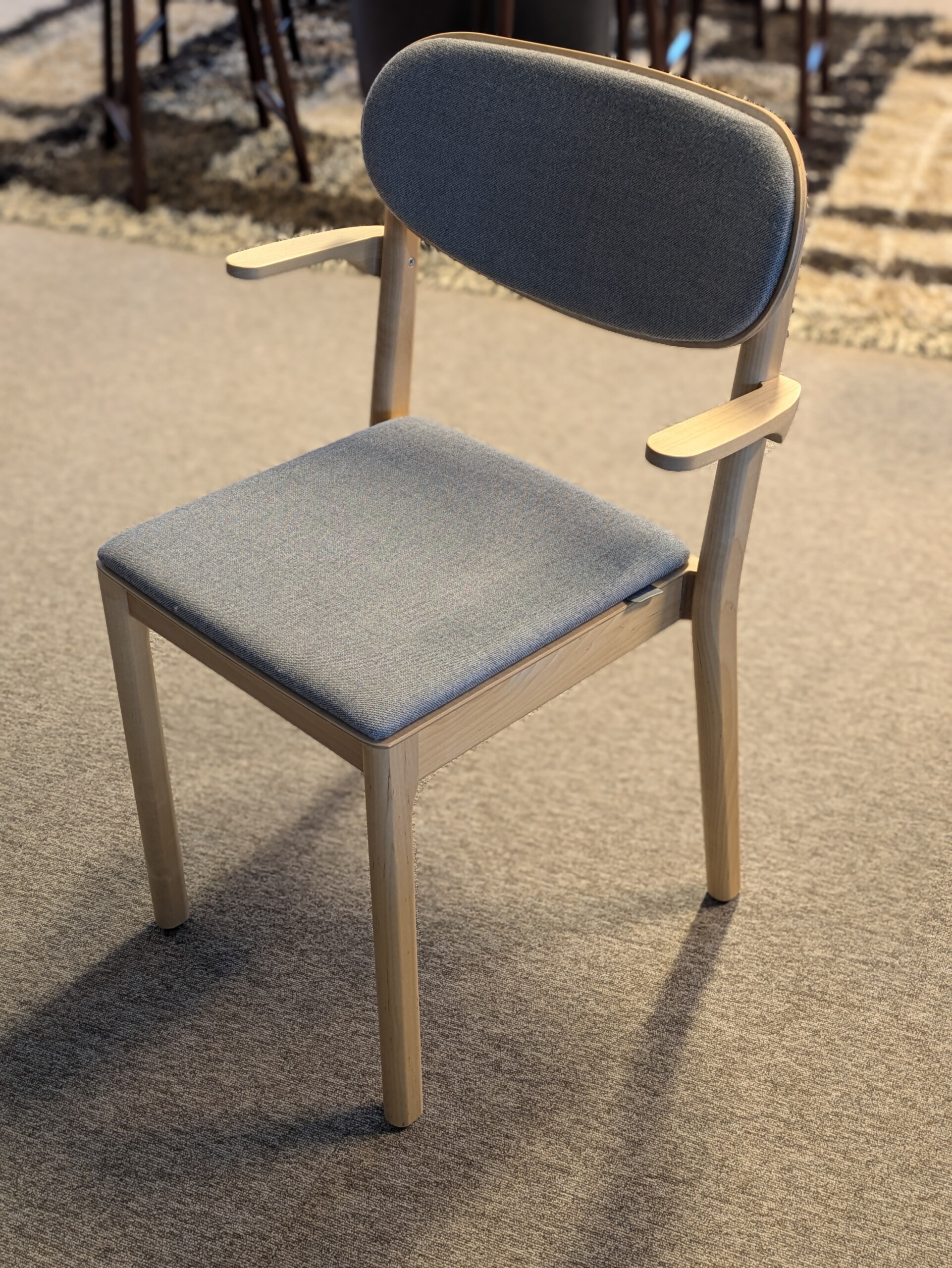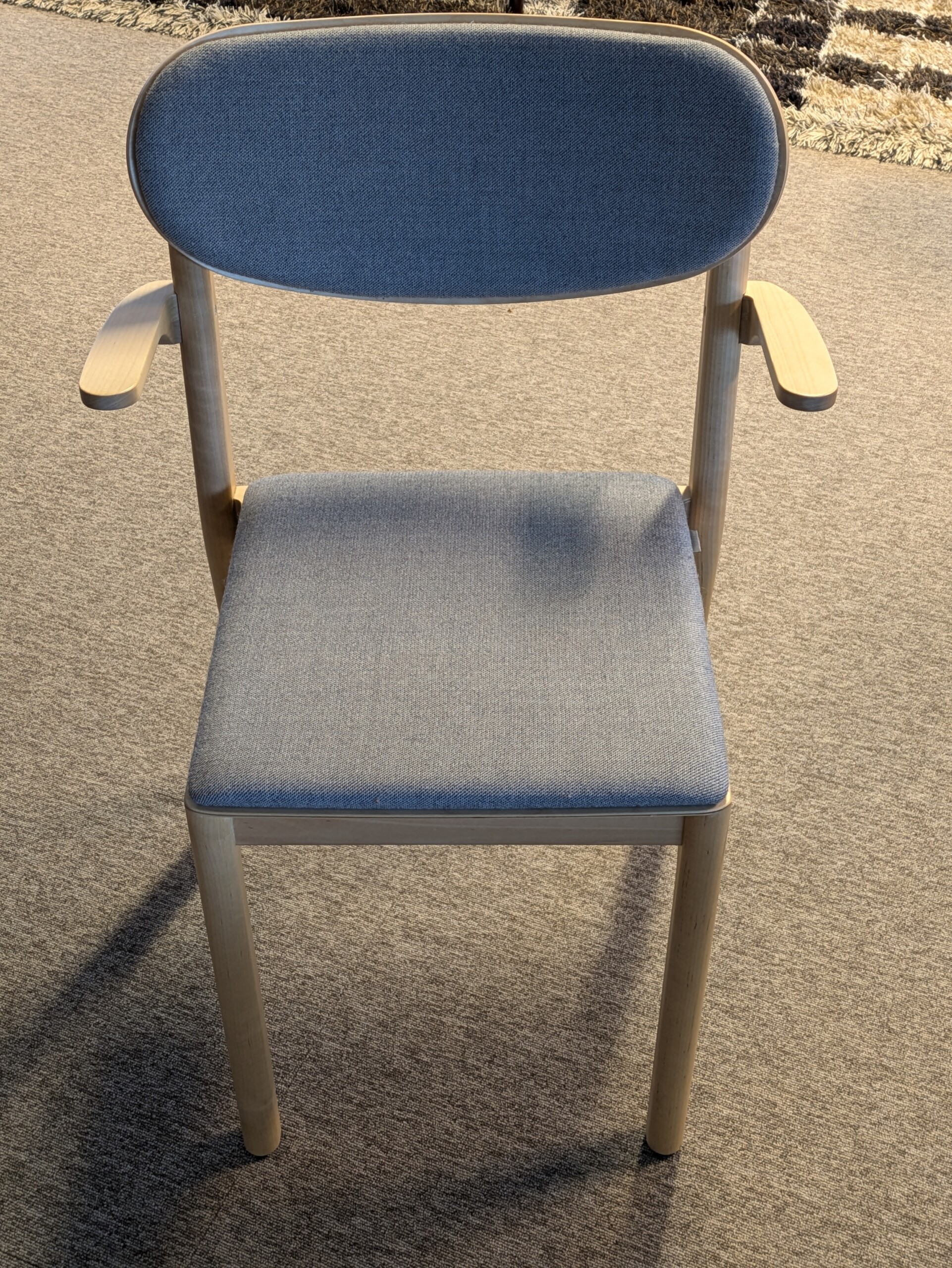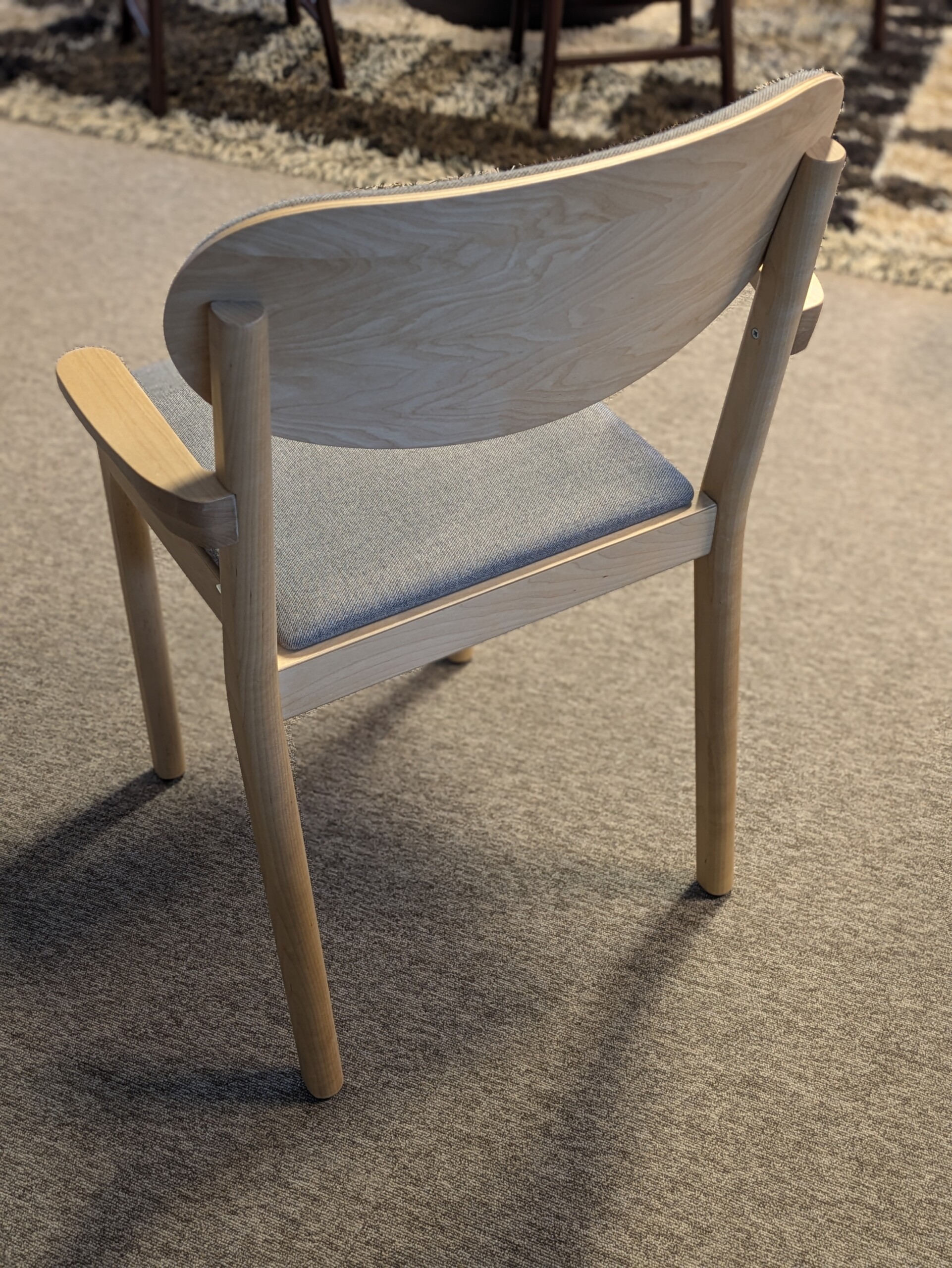 Sæde i stof (grå). Ryg i træ (birk). 4-bensstel i træ (birk).