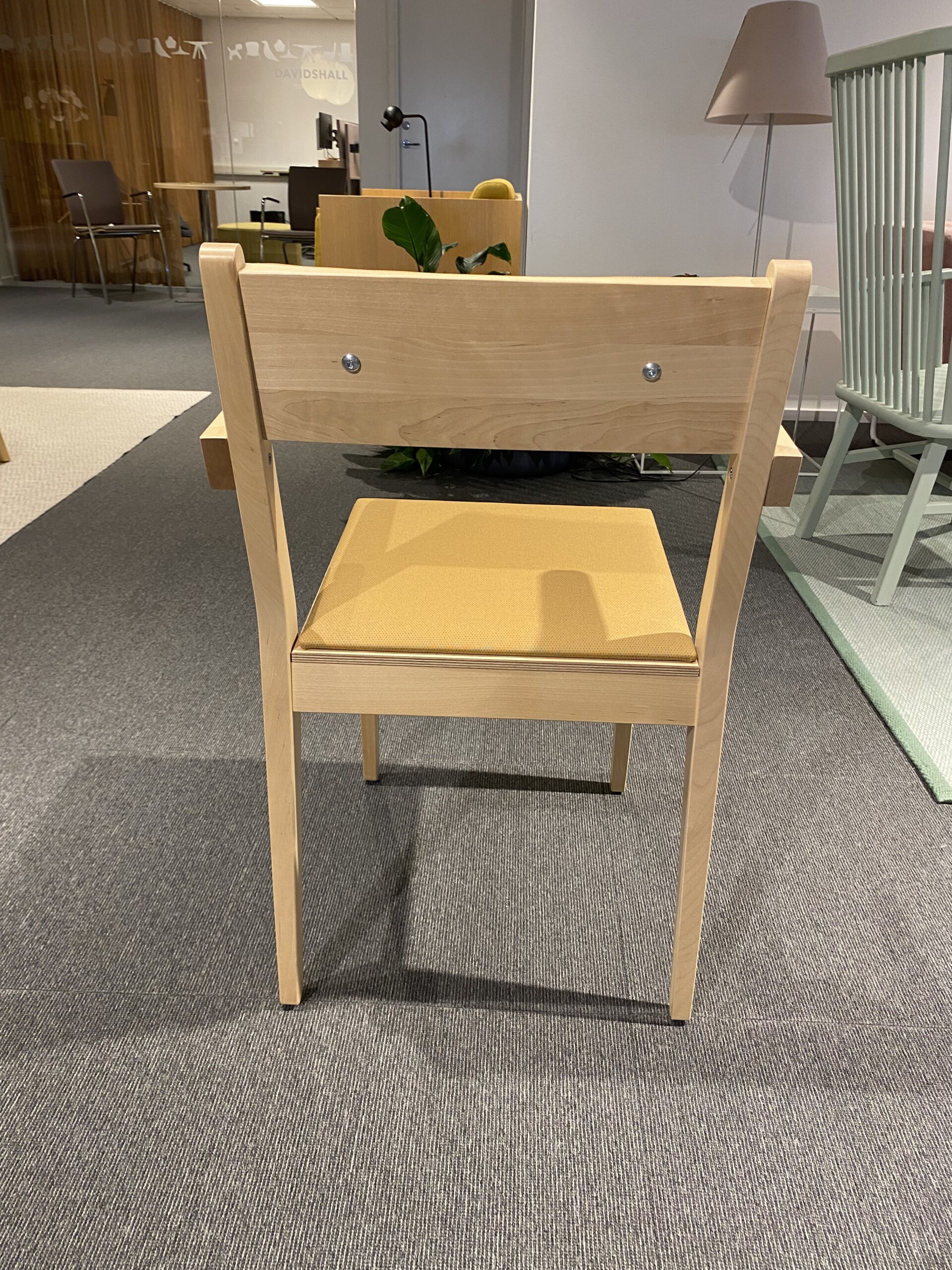 Sæde og ryg i kunstlæder (gul). 4-bensstel i træ (birk).