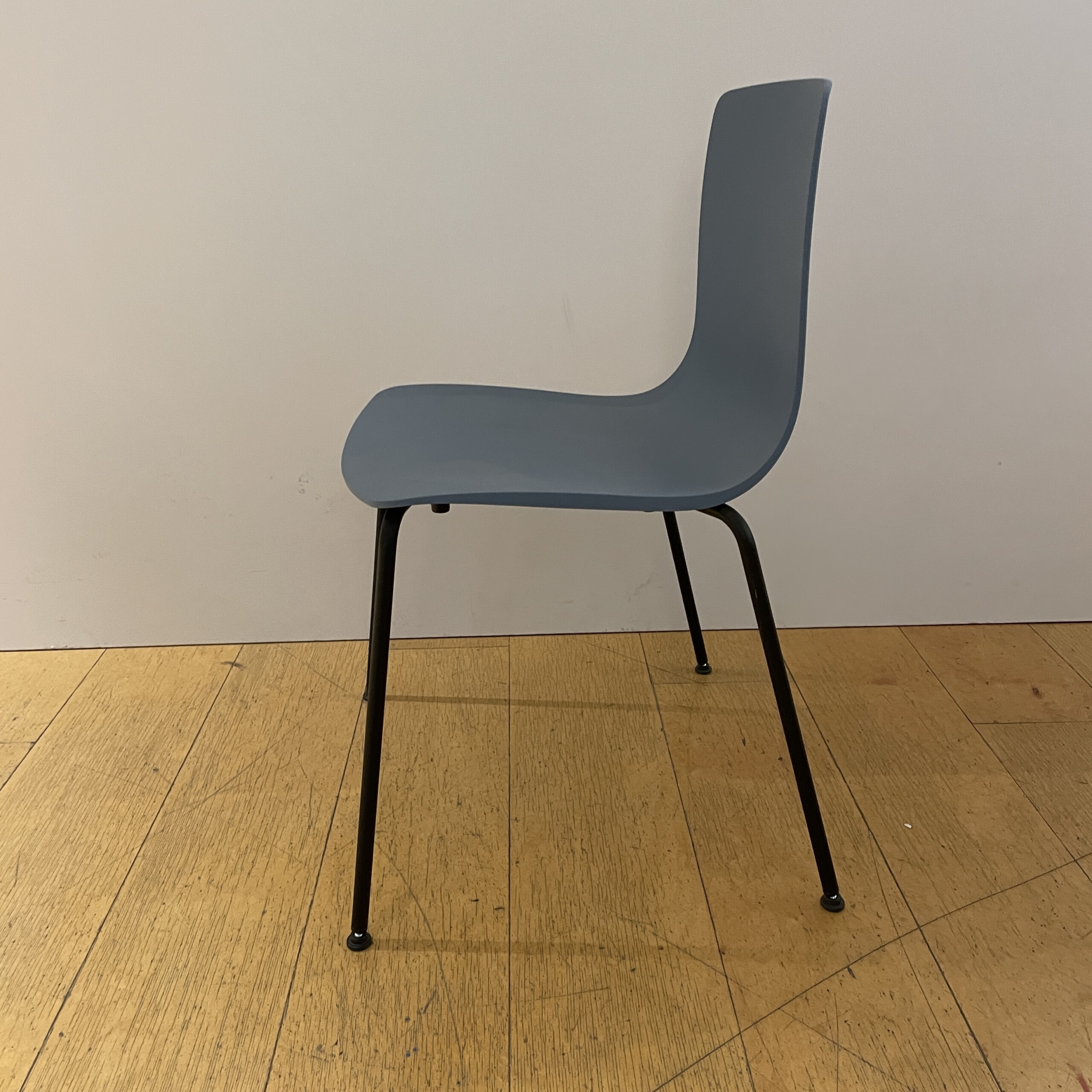 Sæde og ryg i plast (blå). 4-bensstel i metal (sort).