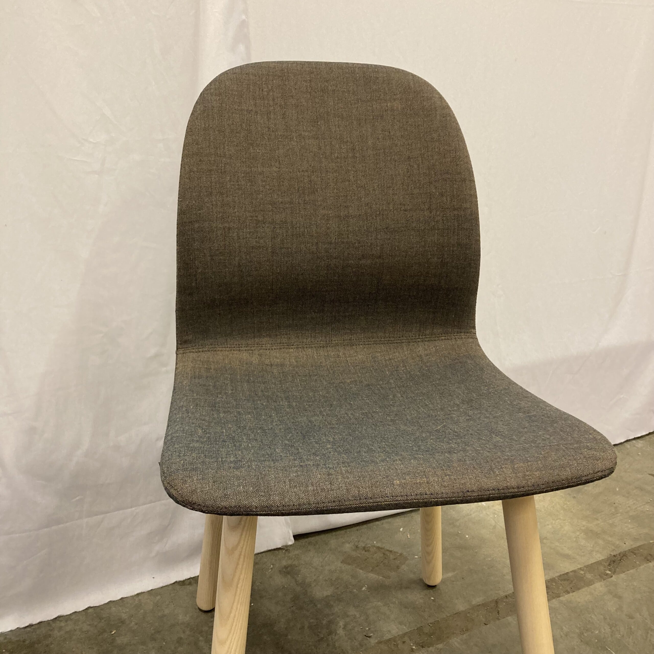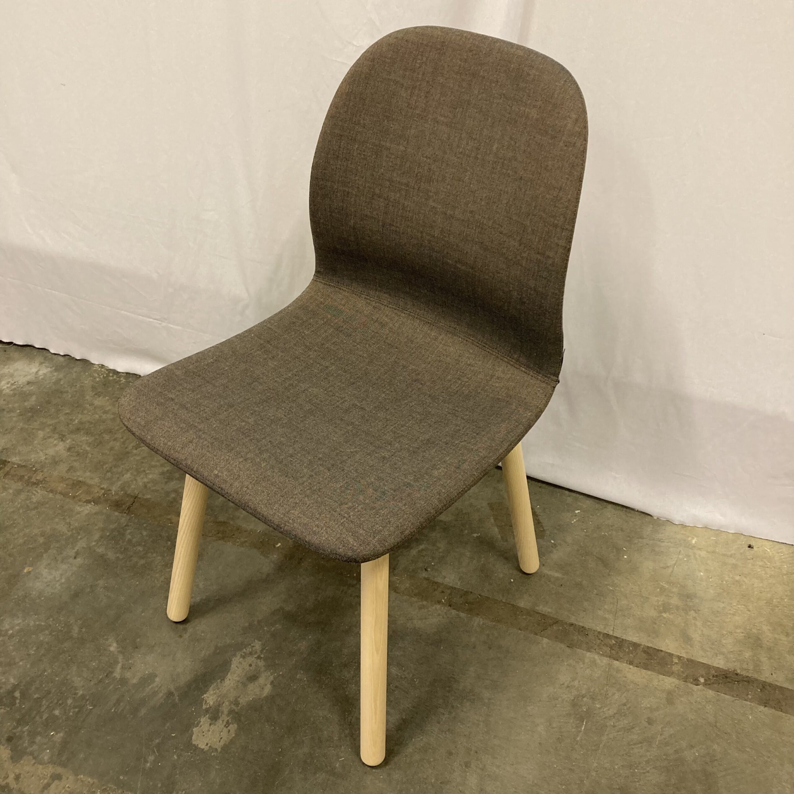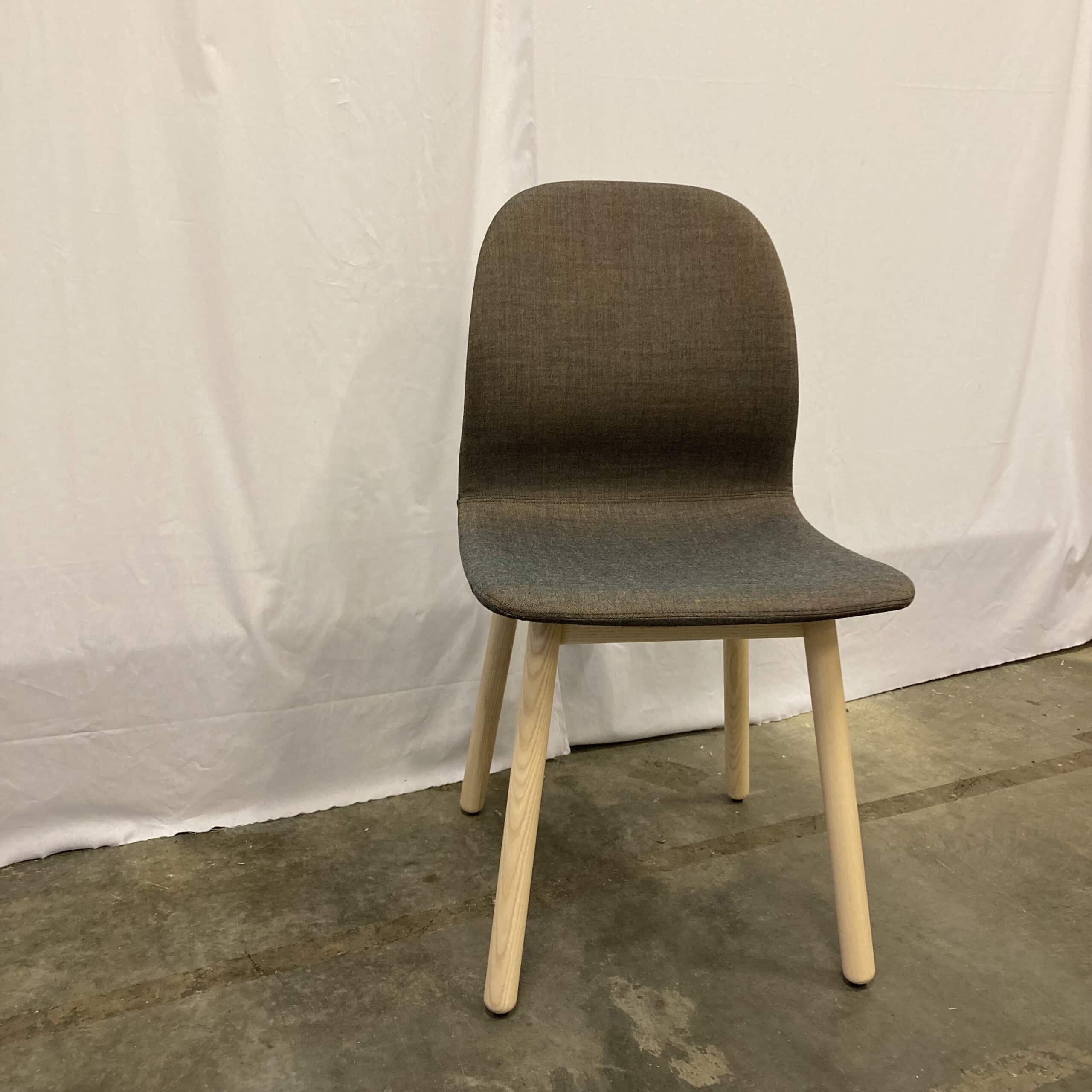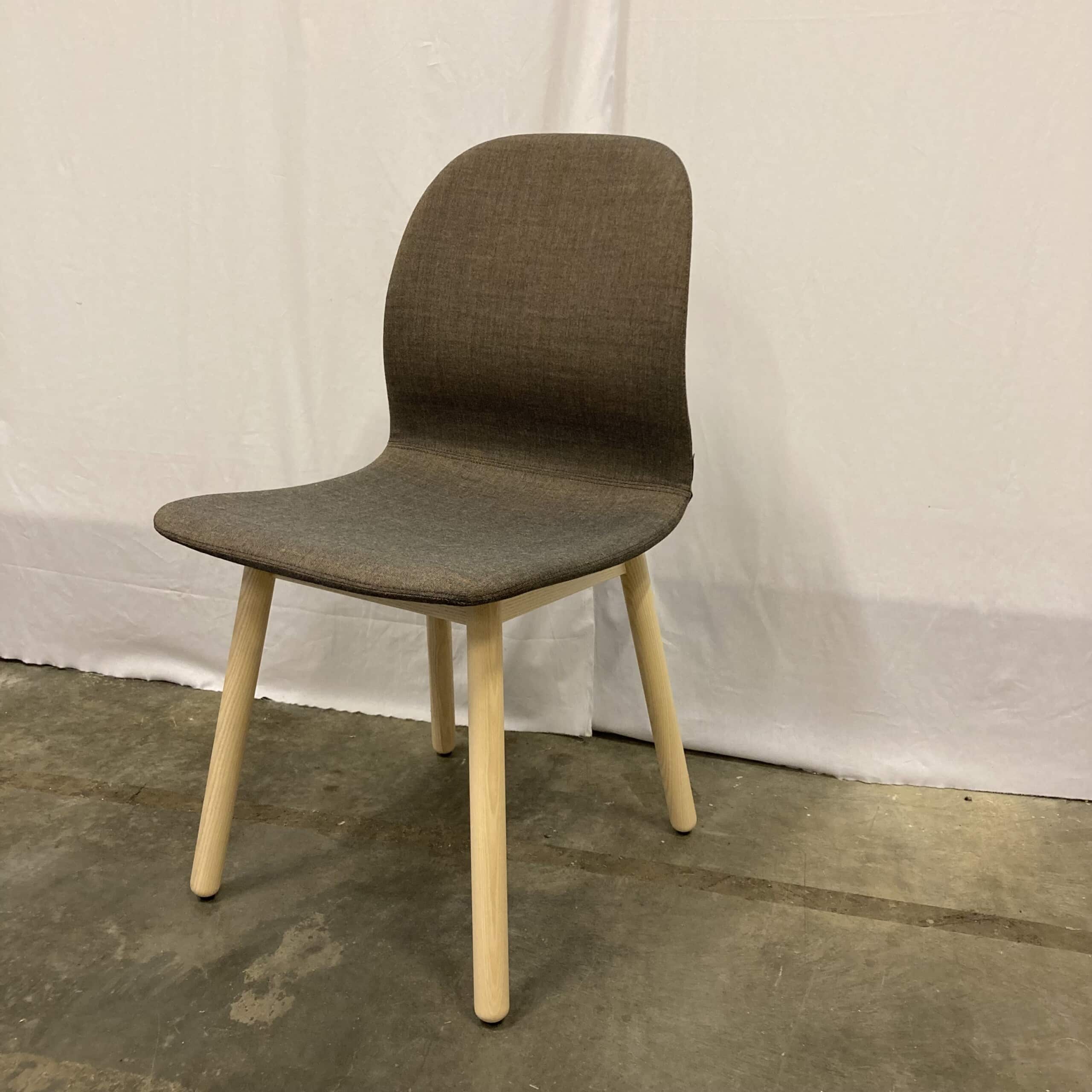 Sæde og ryg i stof (brun). 4-bensstel i træ (ask).