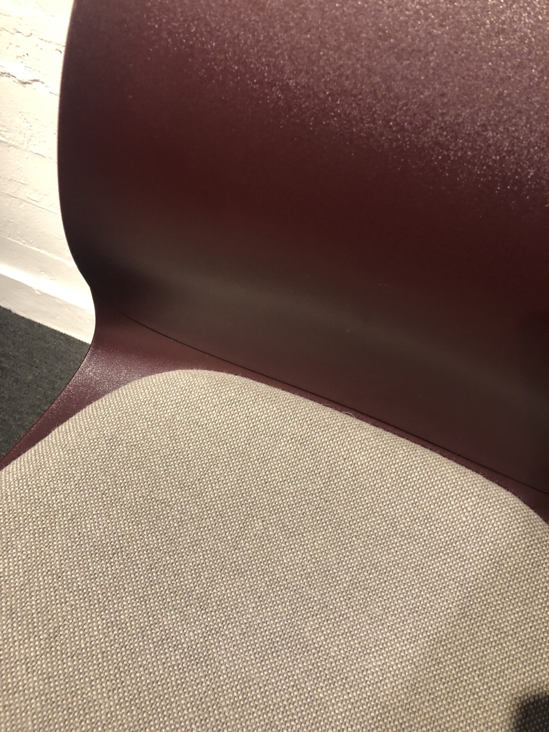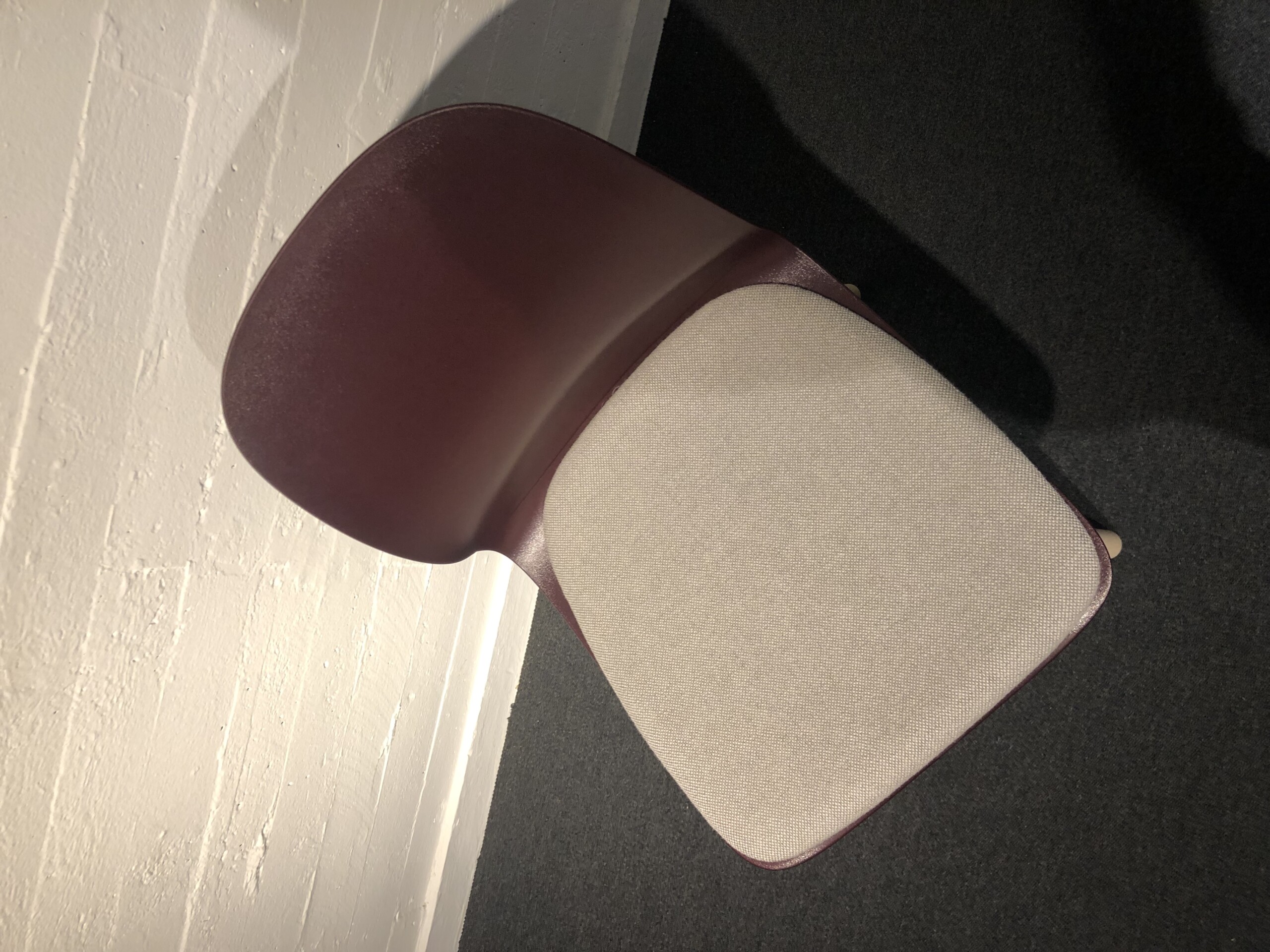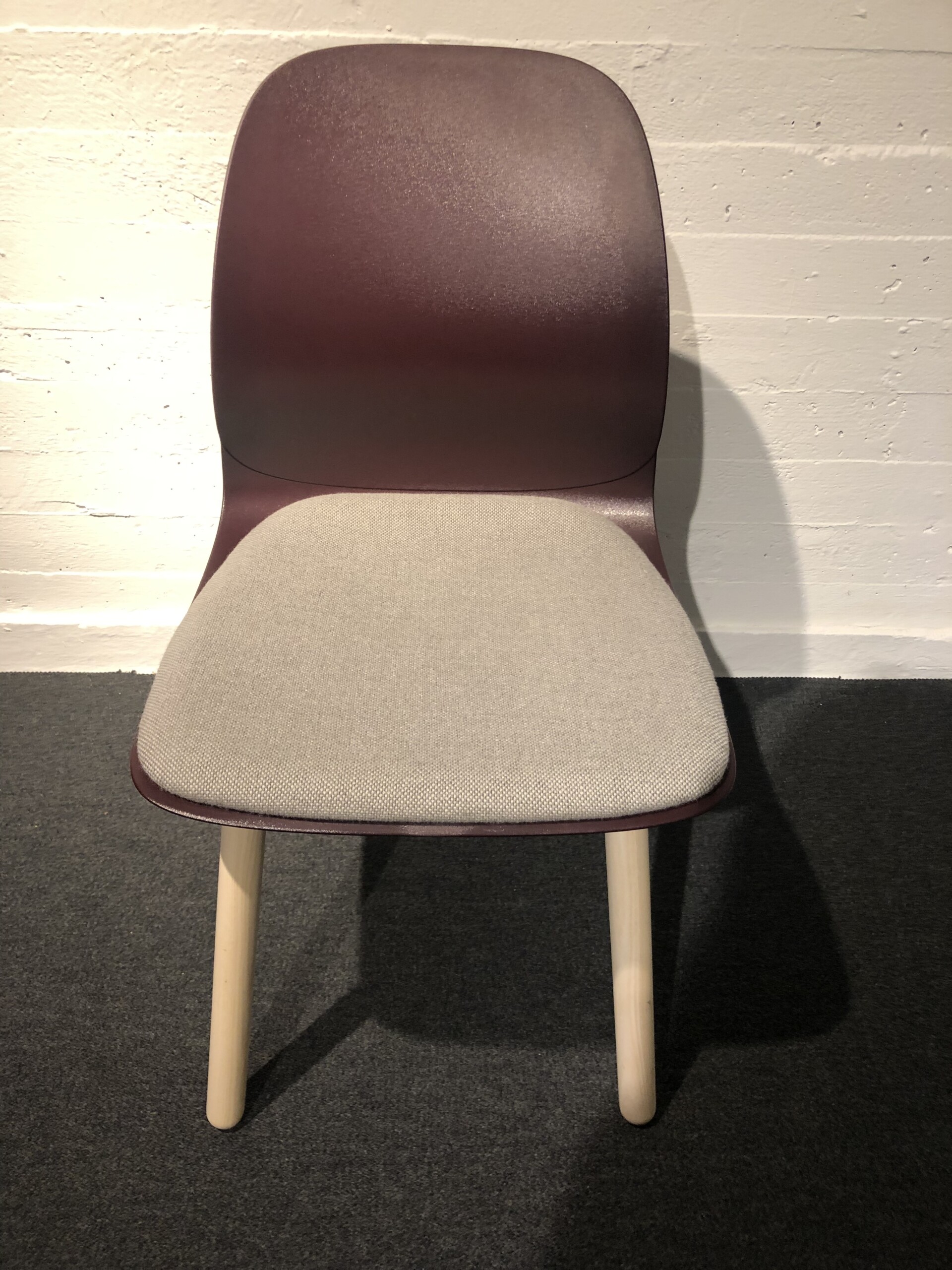 Sæde i stof (beige). Ryg i plast (rød). 4-bensstel i træ (ask).
