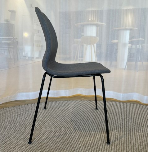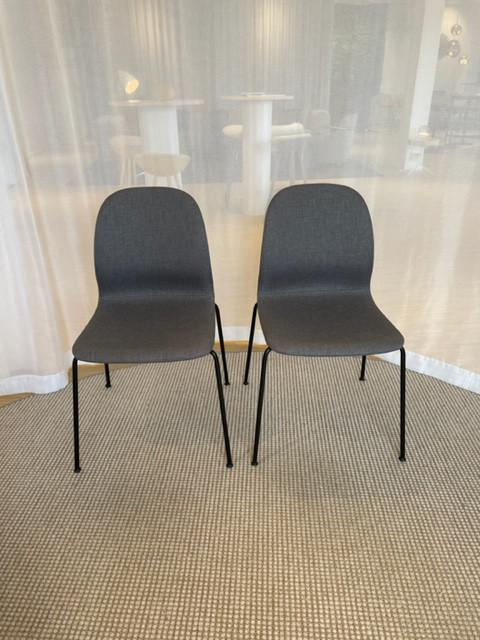 Sæde og ryg i stof (grå). 4-bensstel i metal (sort).
