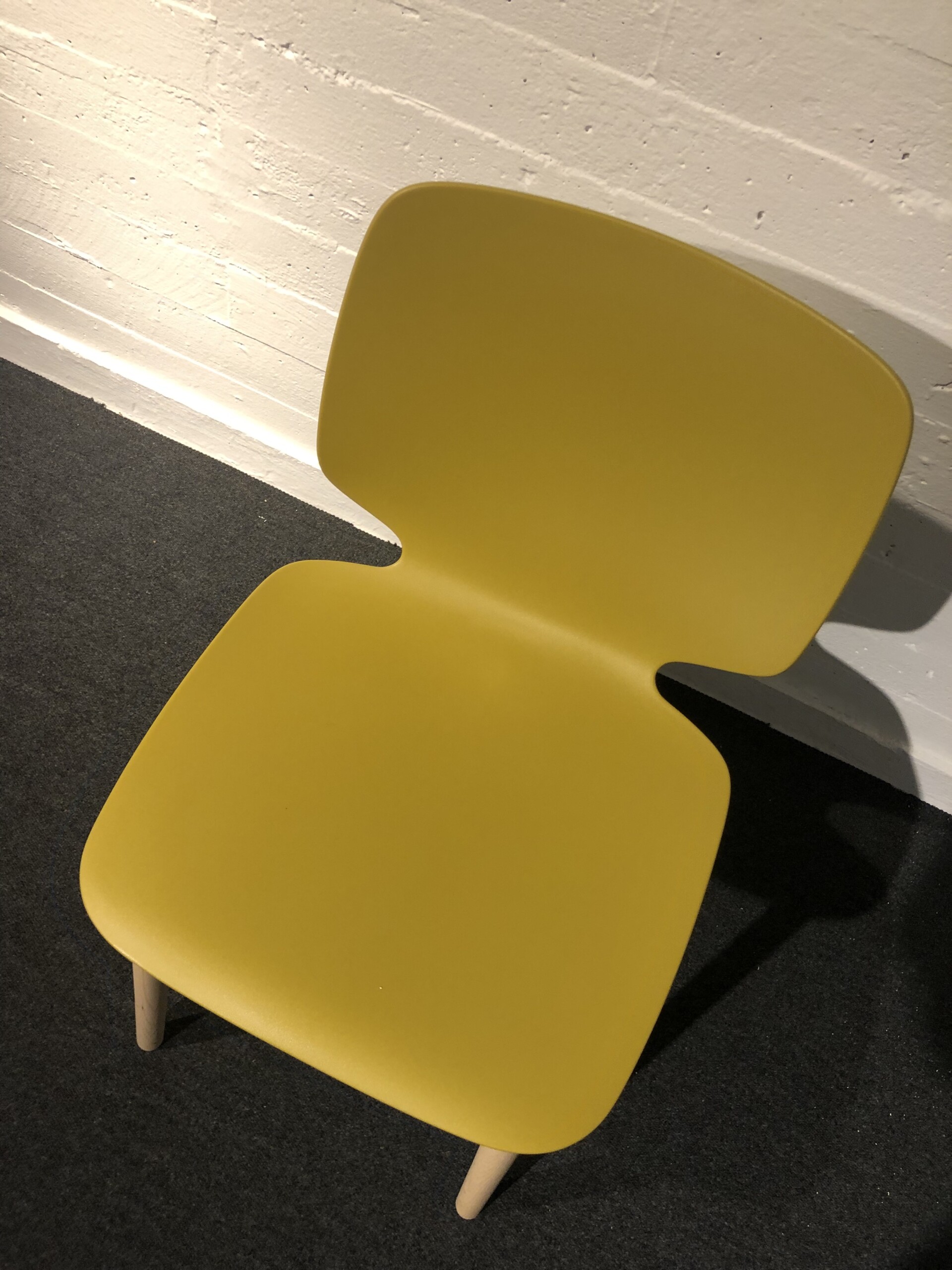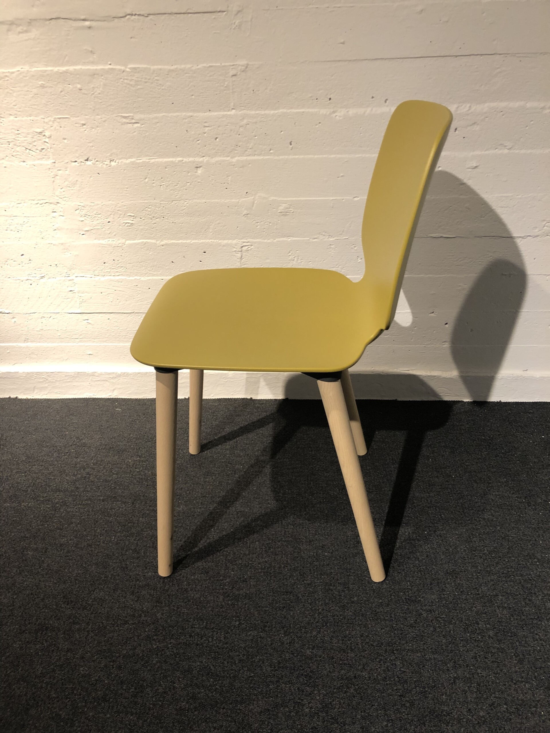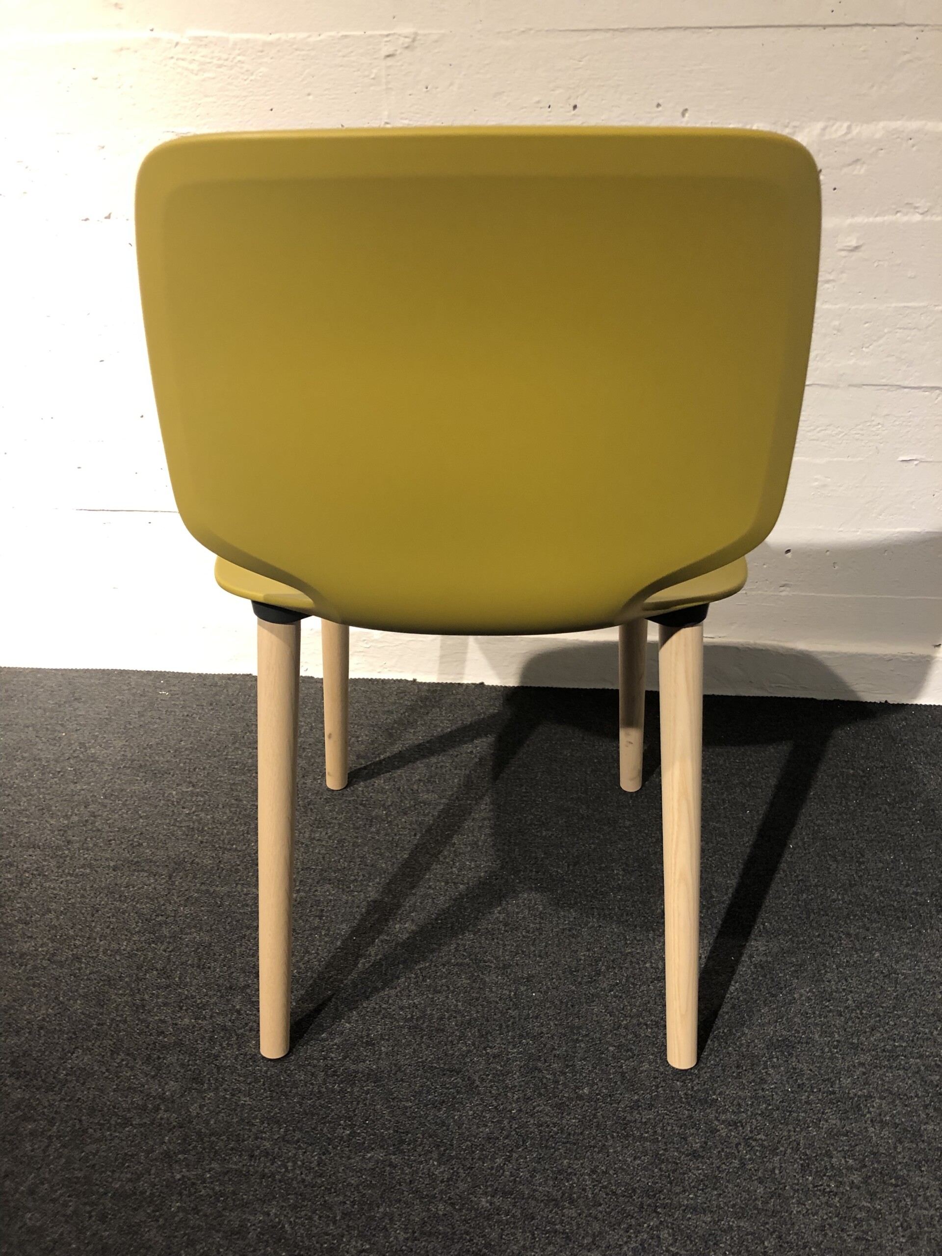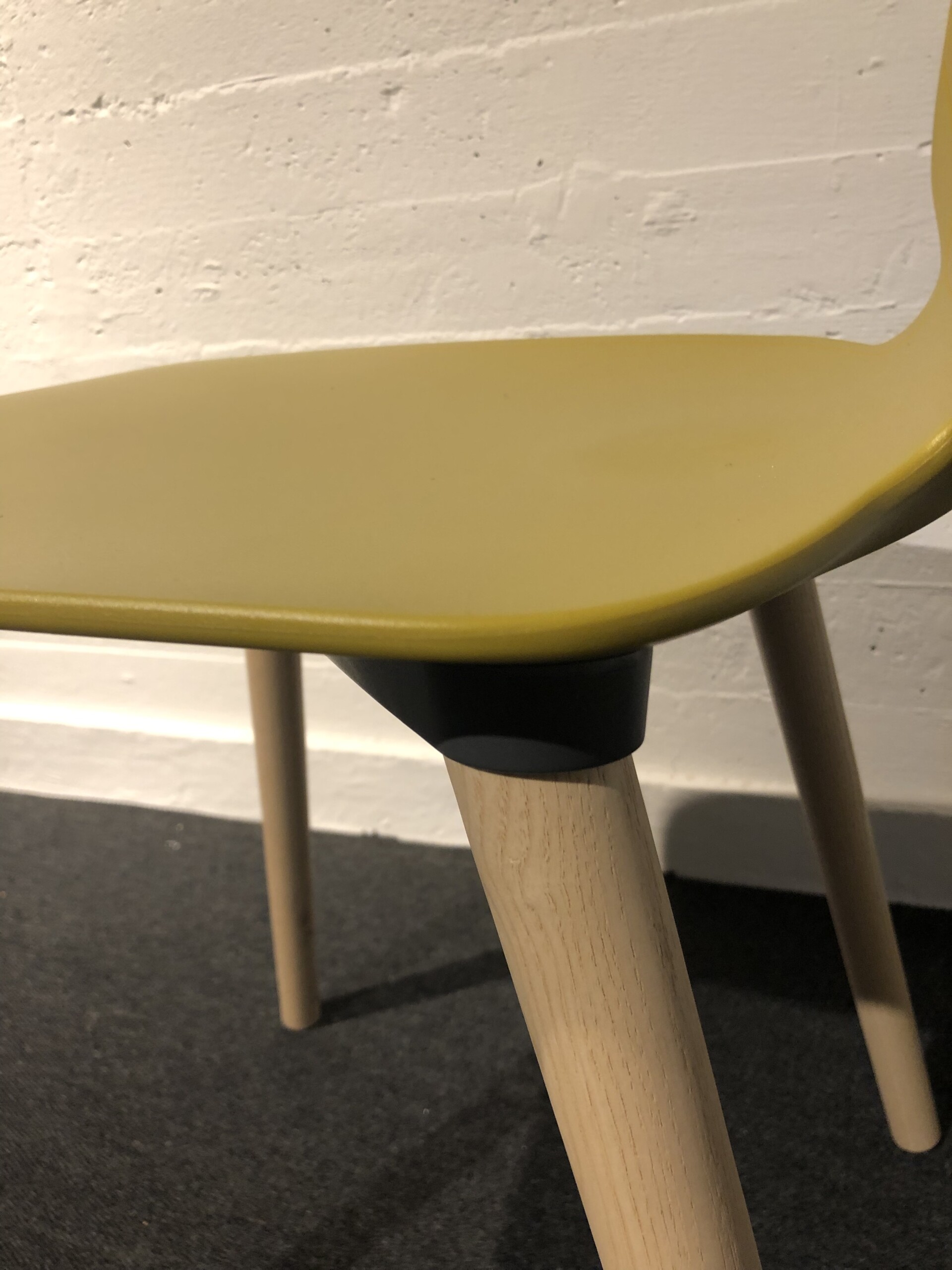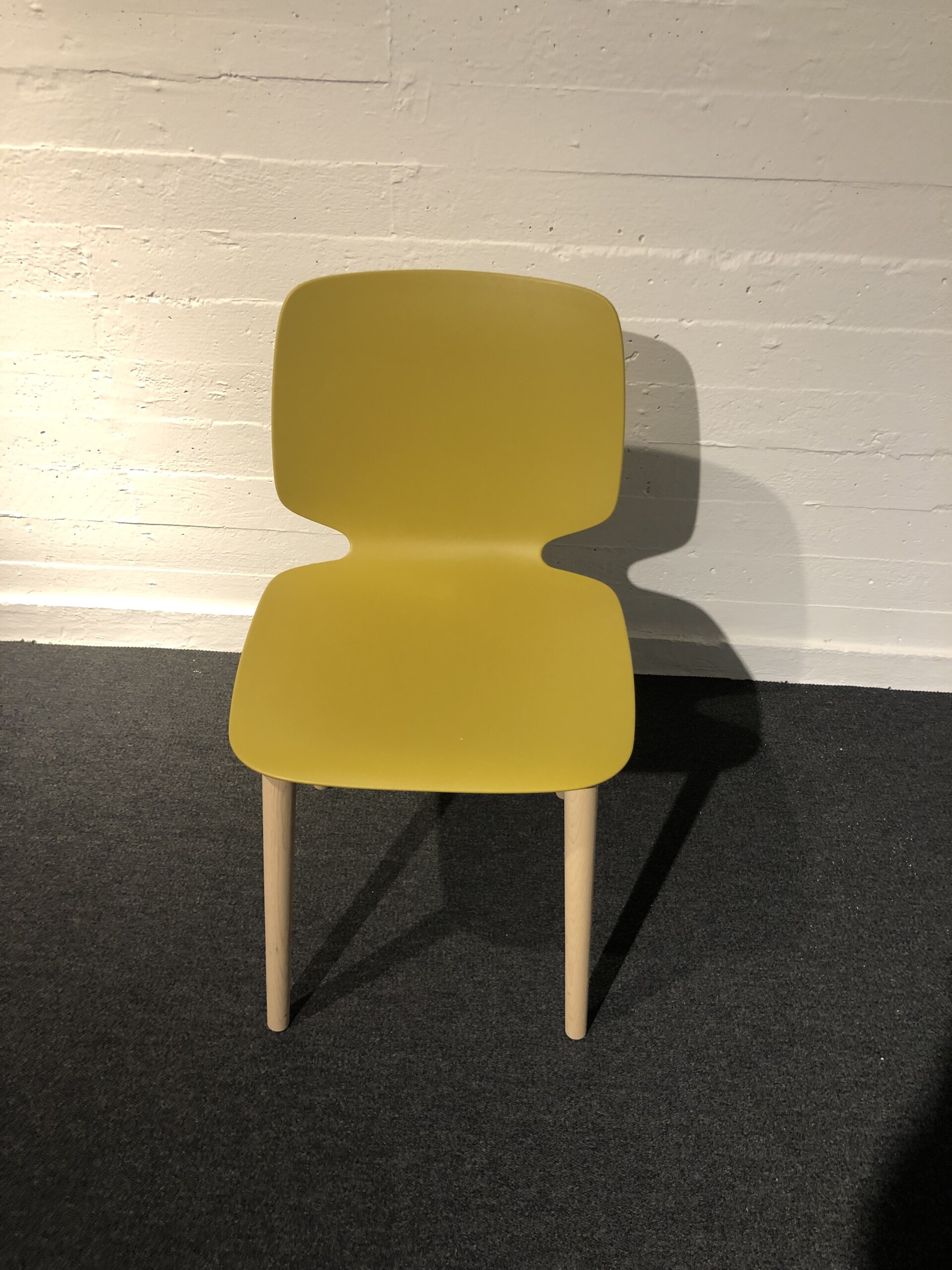 Sæde og ryg i plast (gul). 4-bensstel i træ (ask).