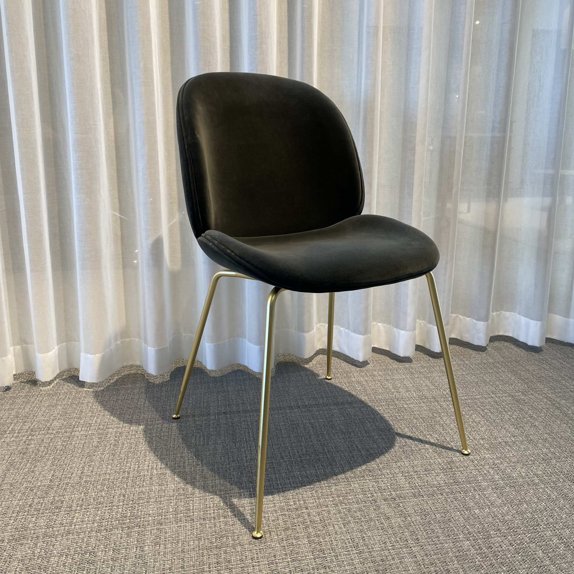 Sæde og ryg i stof (grå). 4-bensstel i metal (mässing).
