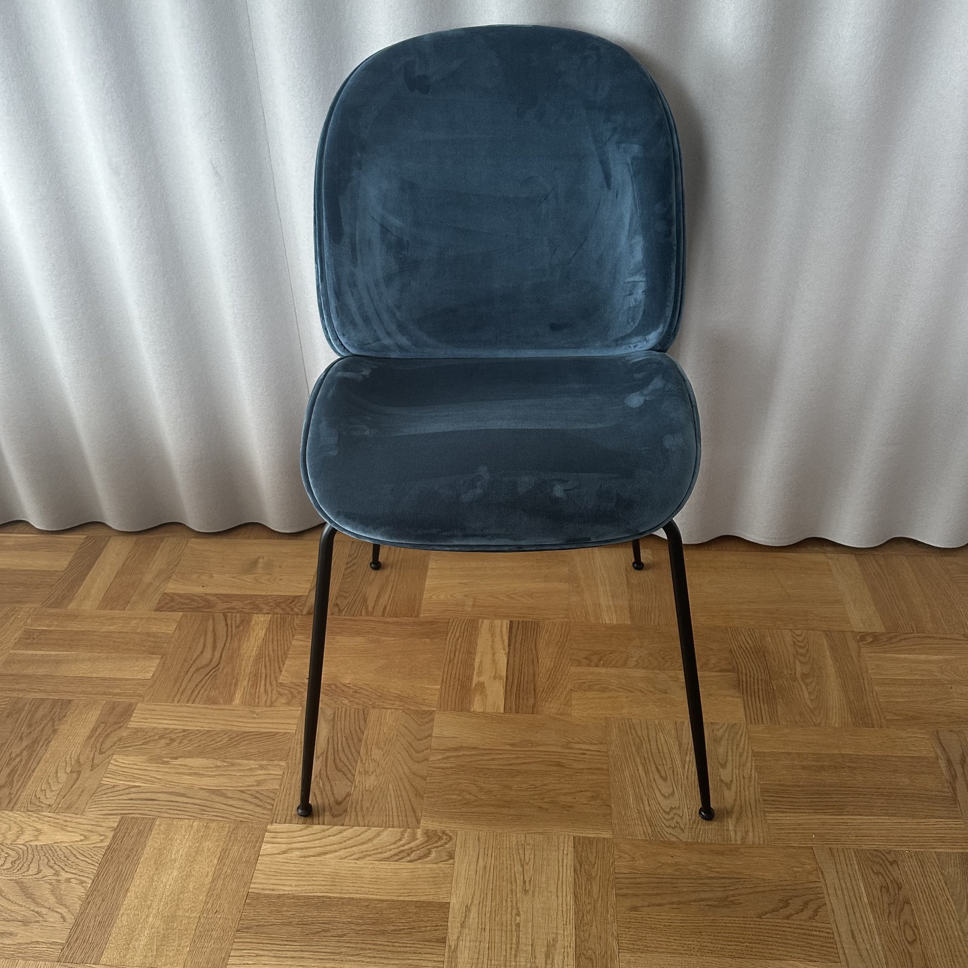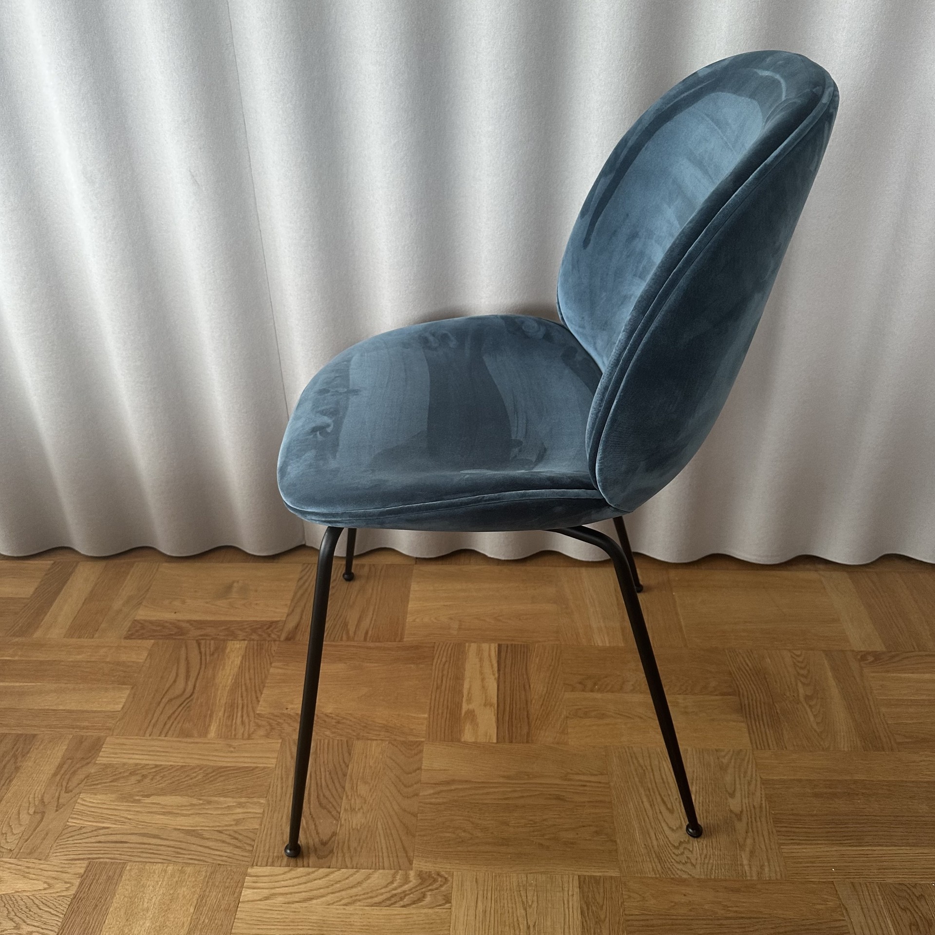 Sæde og ryg i stof (turkis). 4-bensstel i metal (sort).