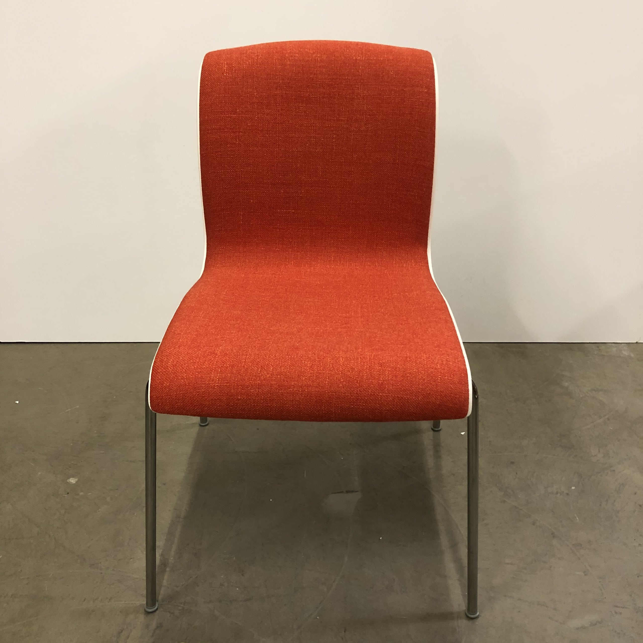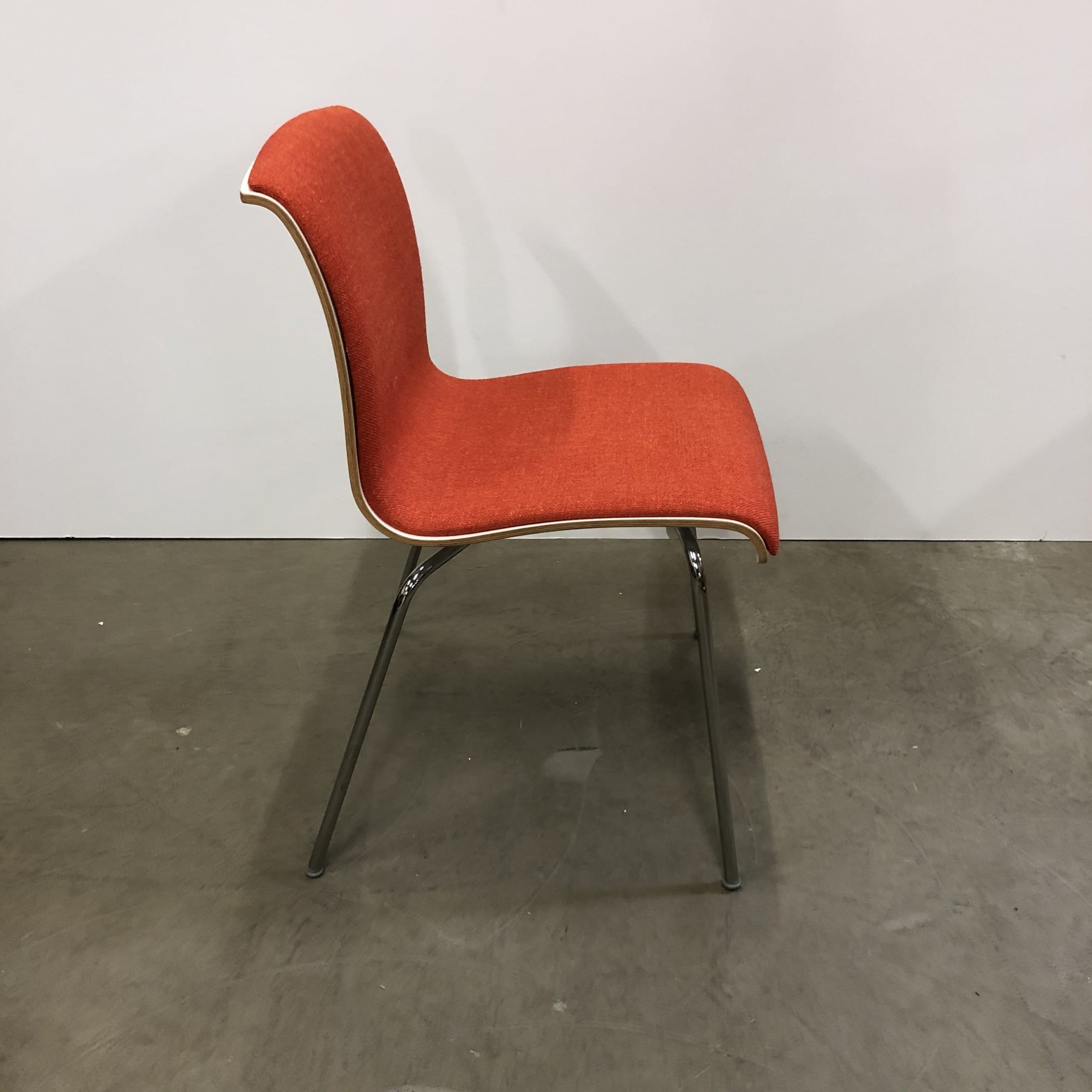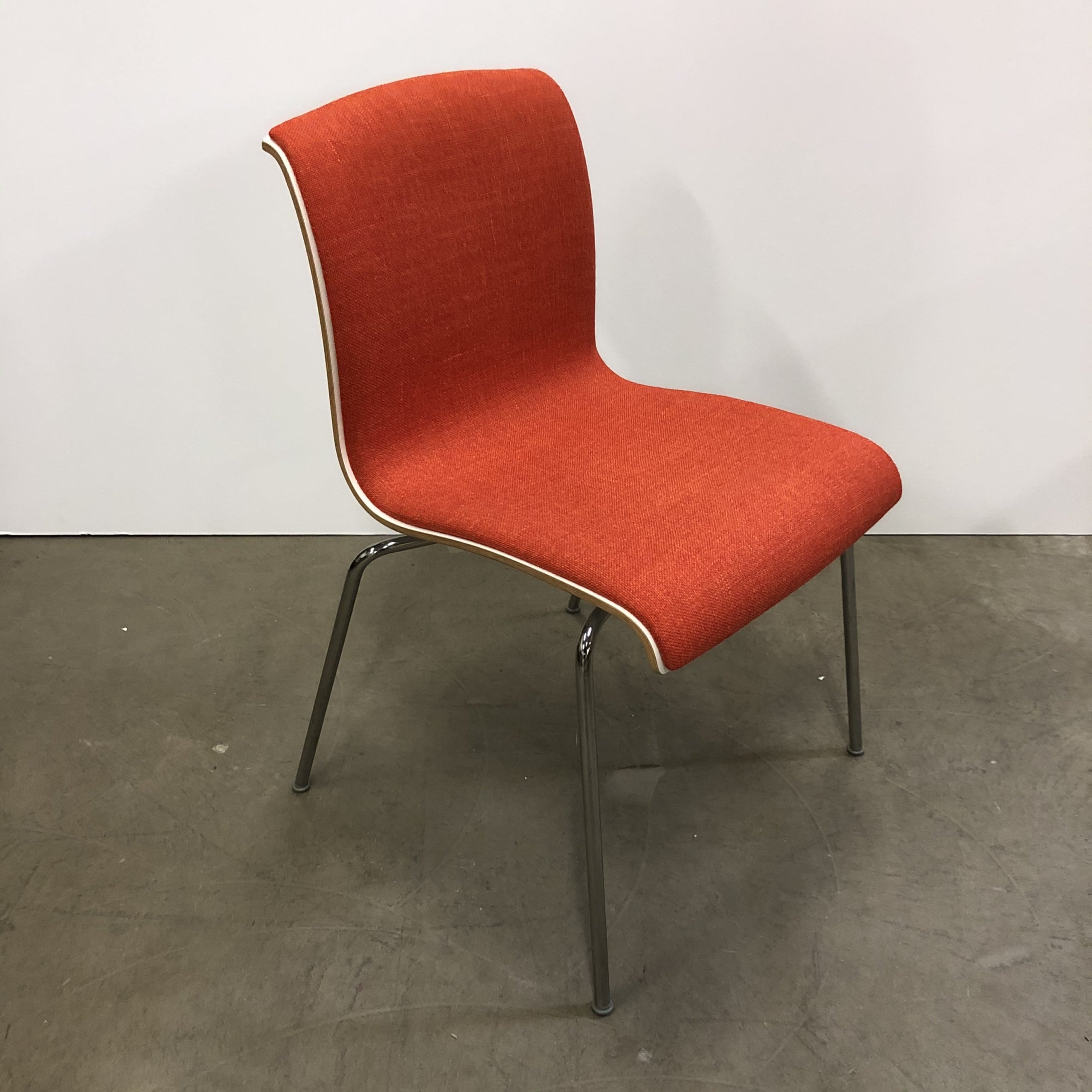 Sæde og ryg i stof (orange). 4-bensstel i metal (krom).