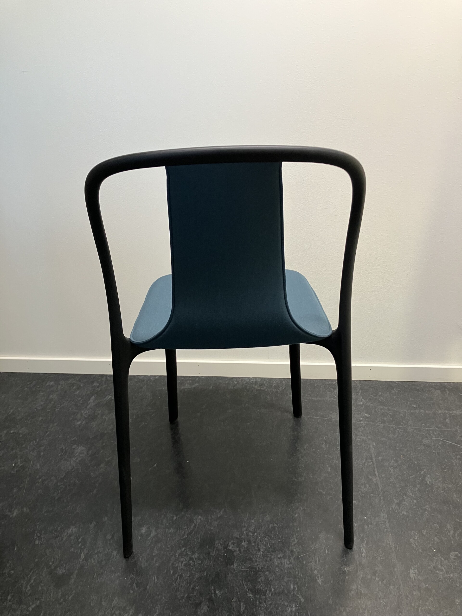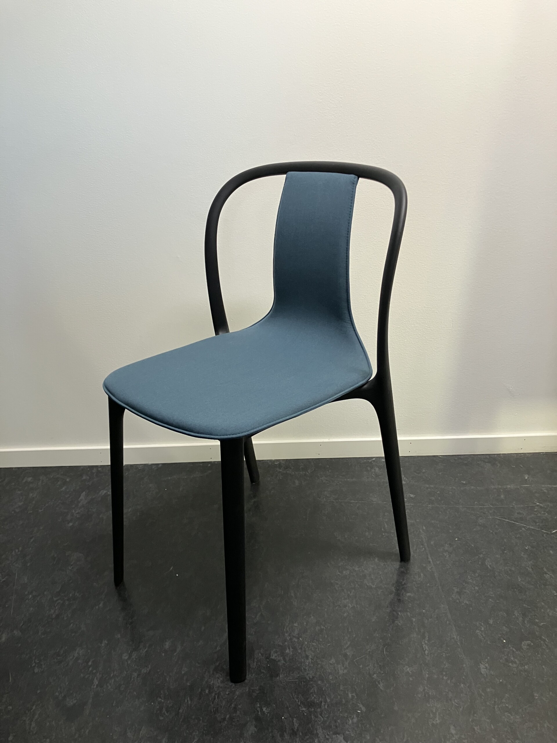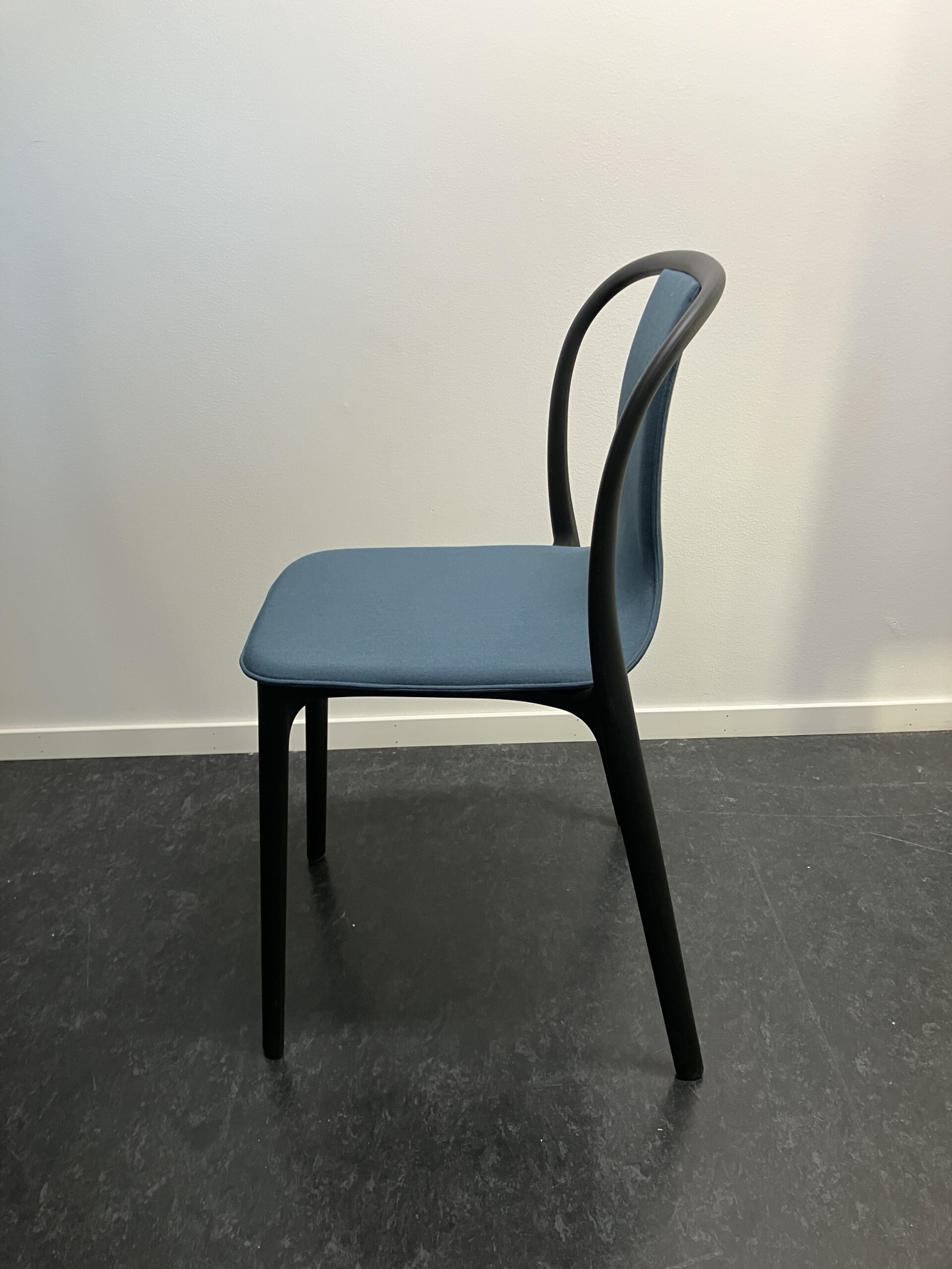 Sæde og ryg i stof (blå). 4-bensstel i plast (sort).