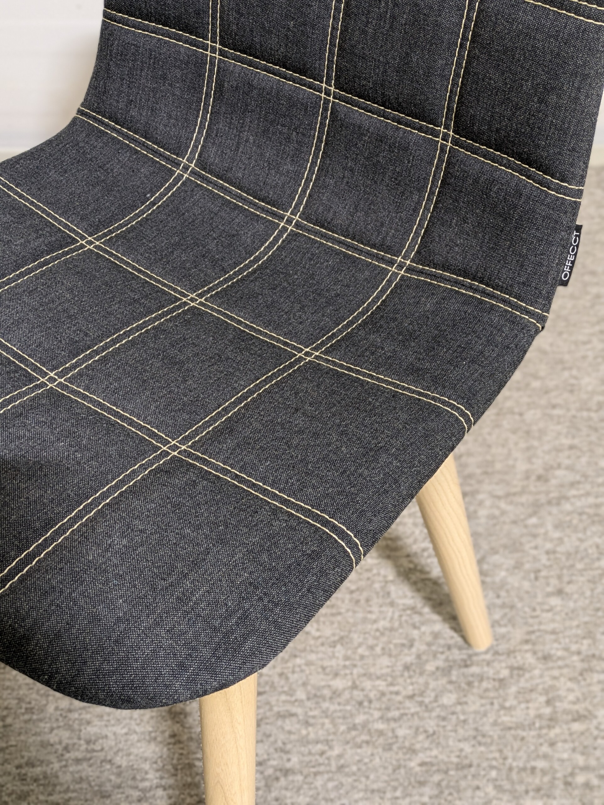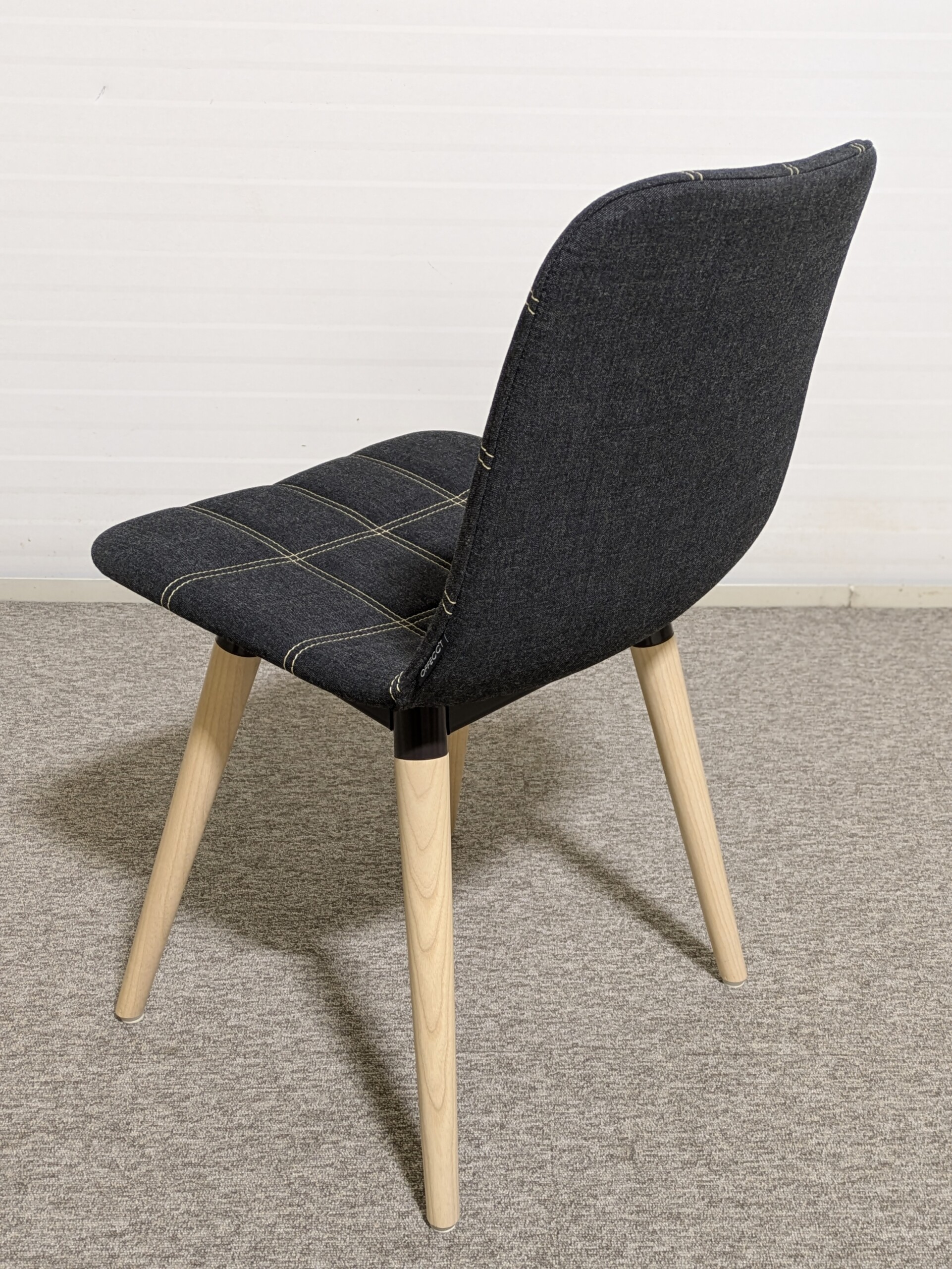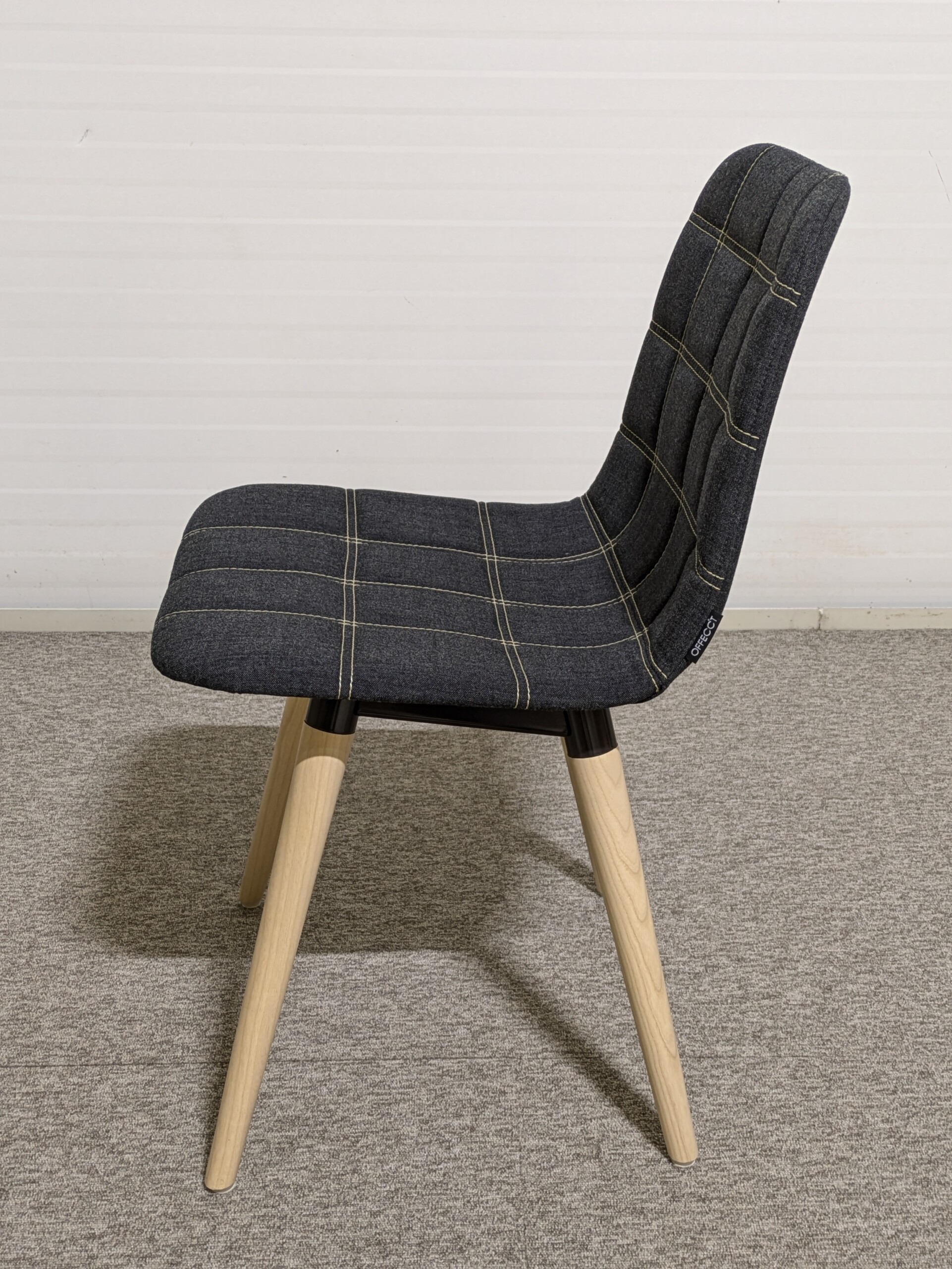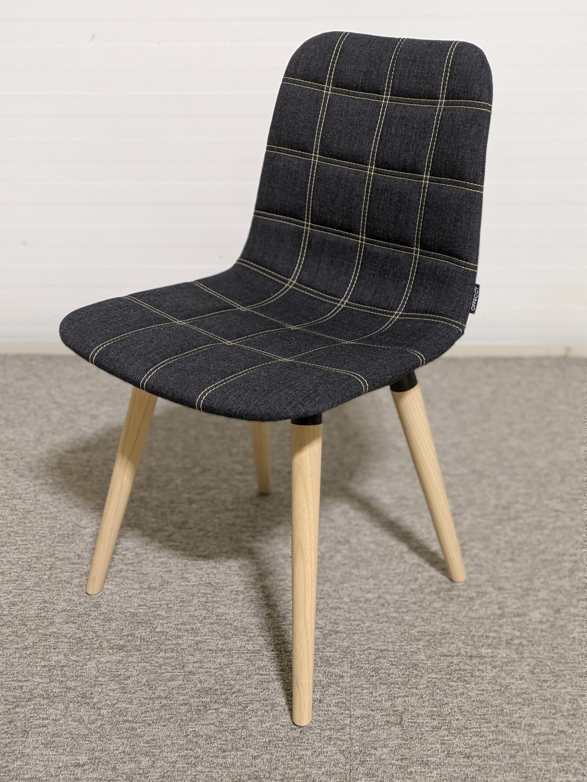 Sæde og ryg i stof (grå). 4-bensstel i træ (ask).