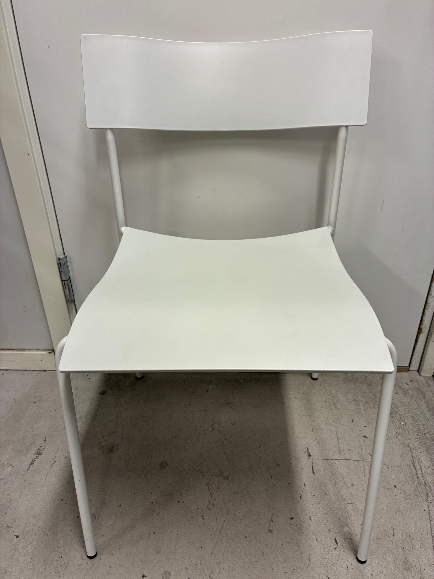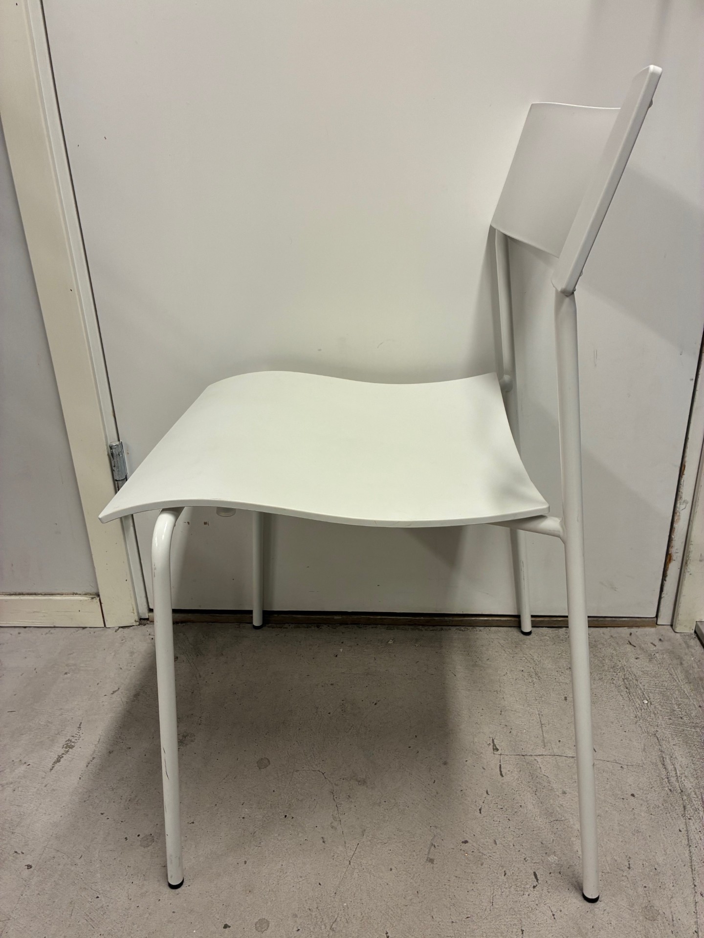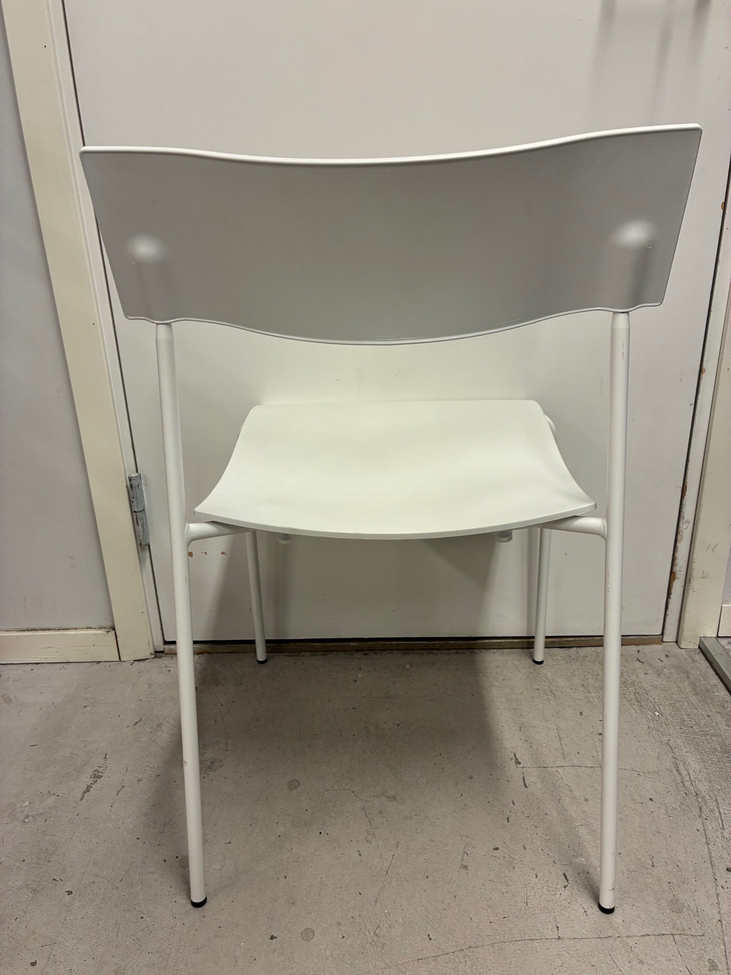 Sæde og ryg i plast (hvid). 4-bensstel i metal (hvid).
