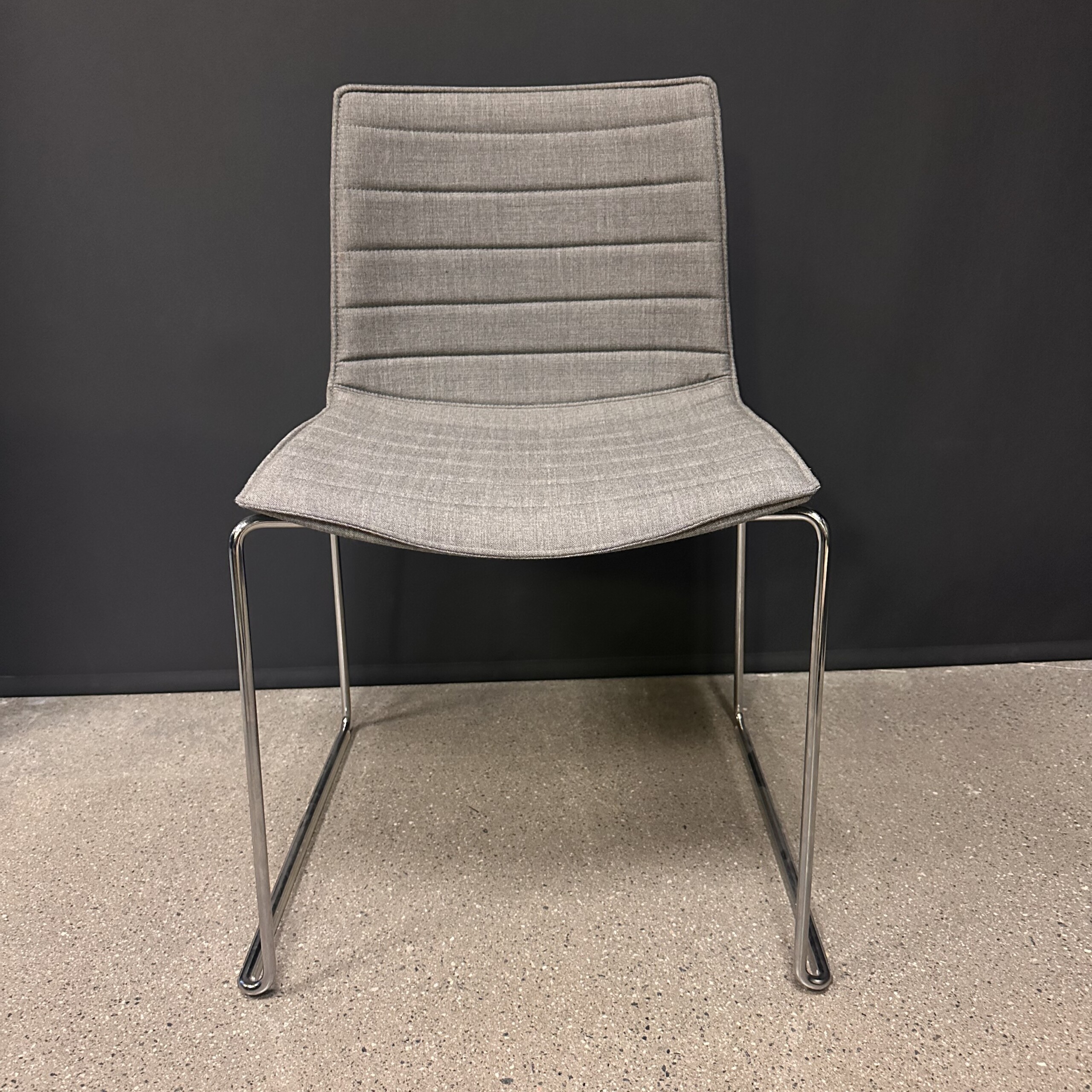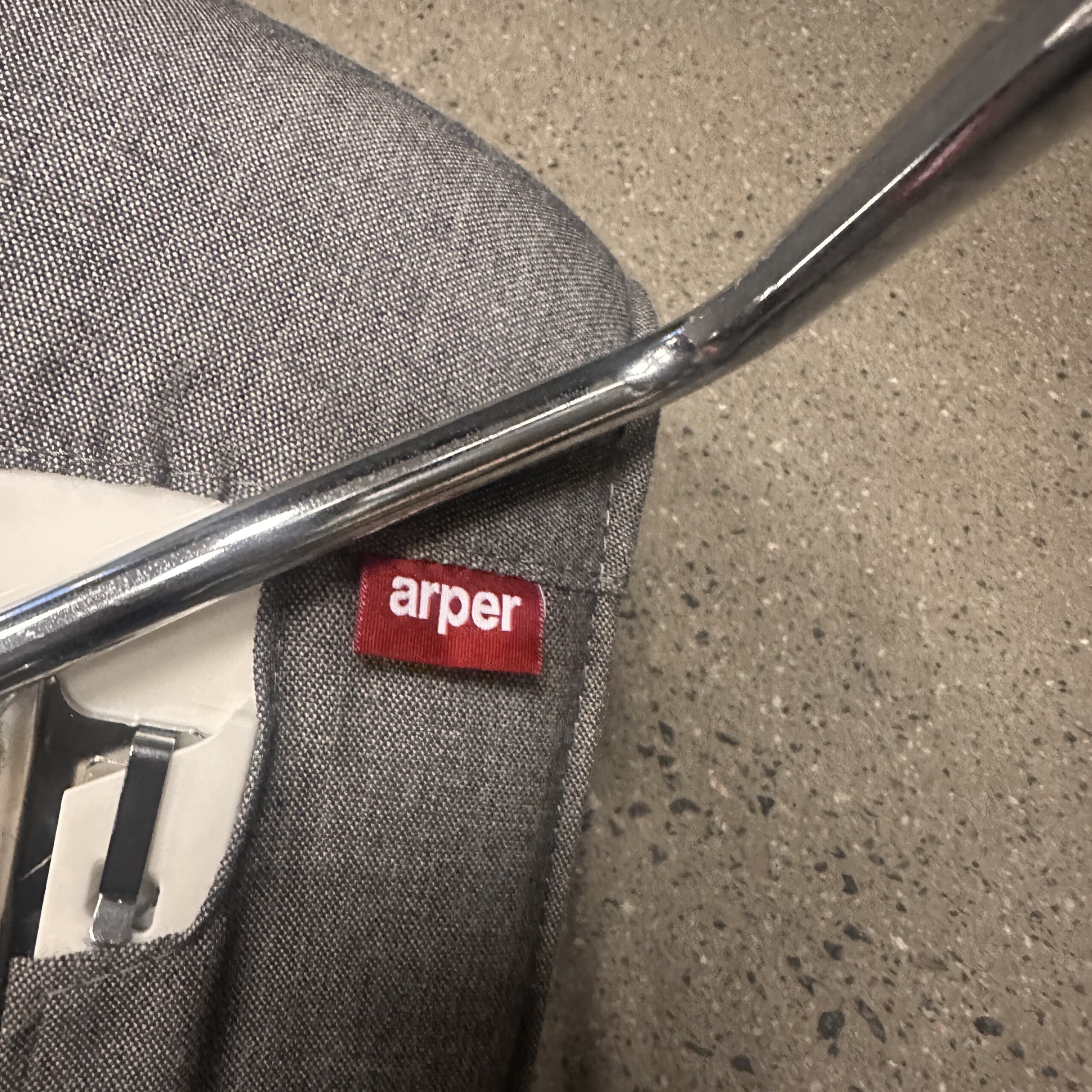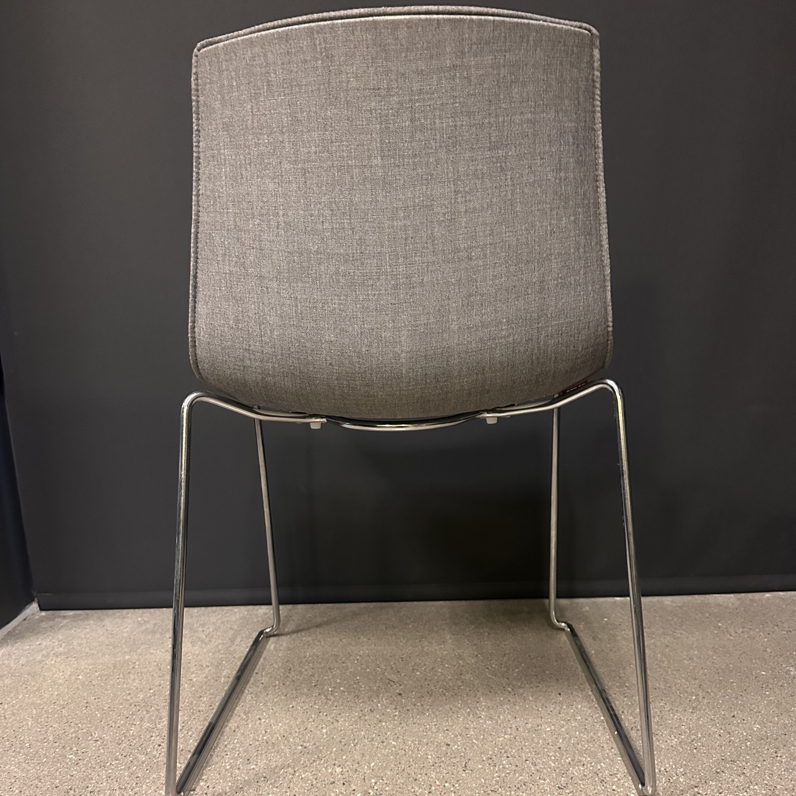 Sæde og ryg i stof (grå). Medestel i metal (sølv).
