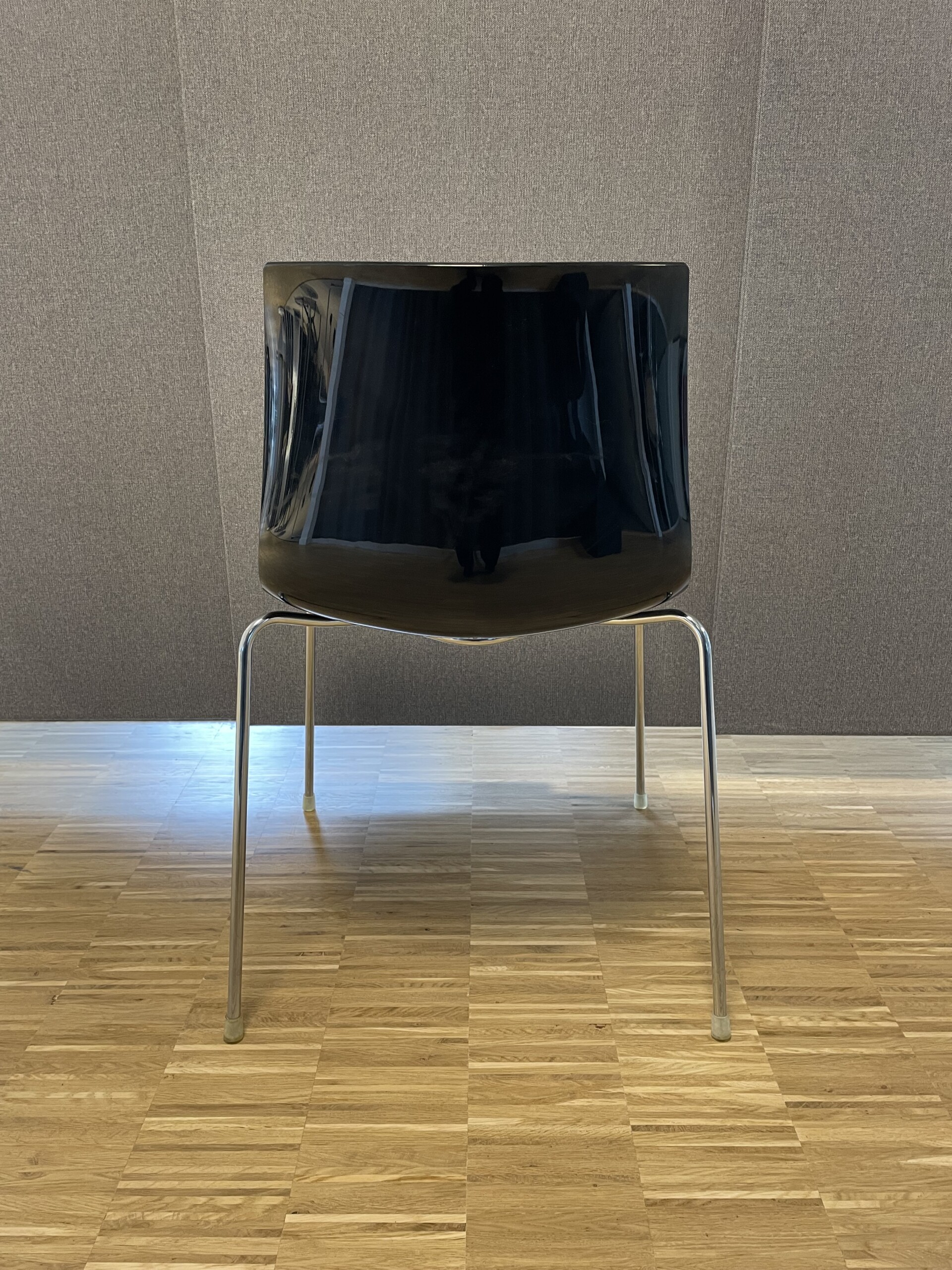 Sæde og ryg i plast (hvid). 4-bensstel i metal (krom).
