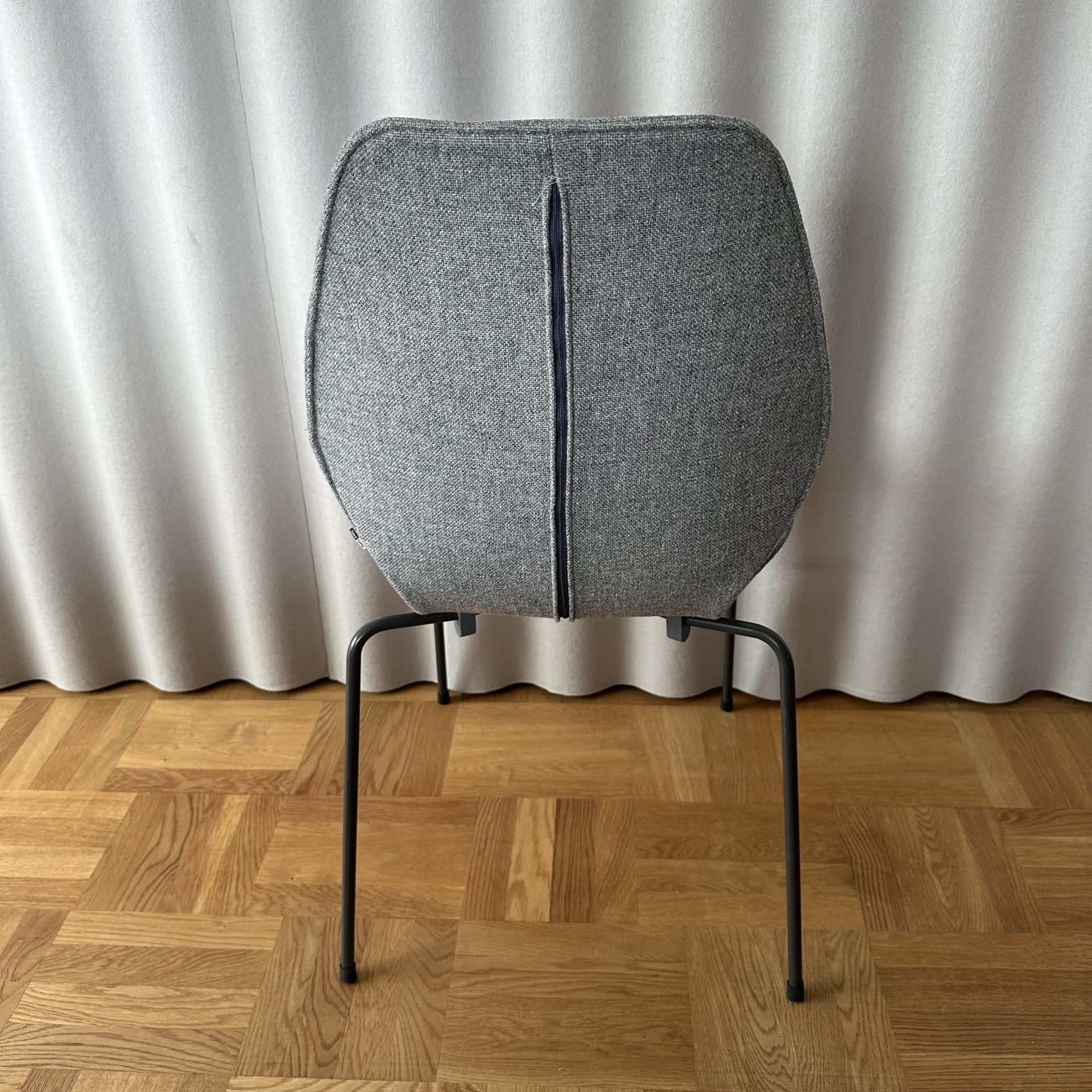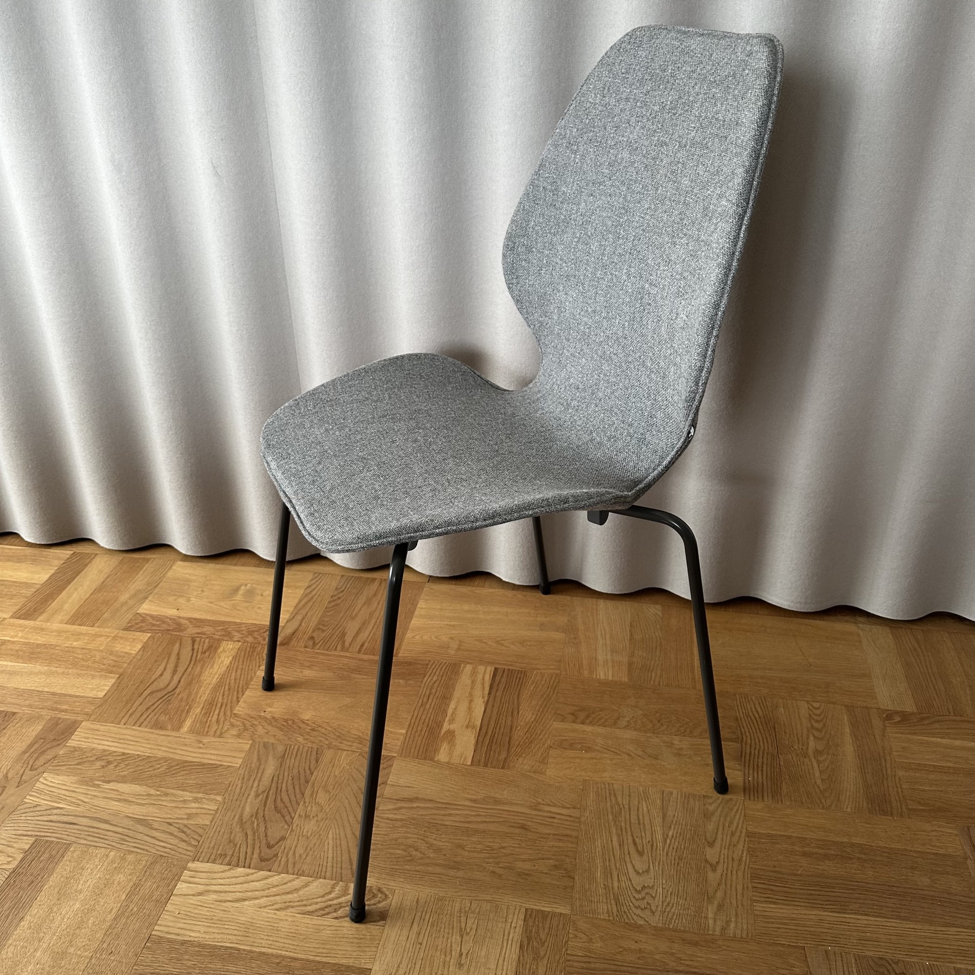 Sæde og ryg i stof (grå). 4-bensstel i metal (sort).