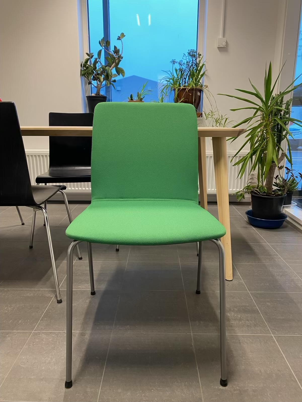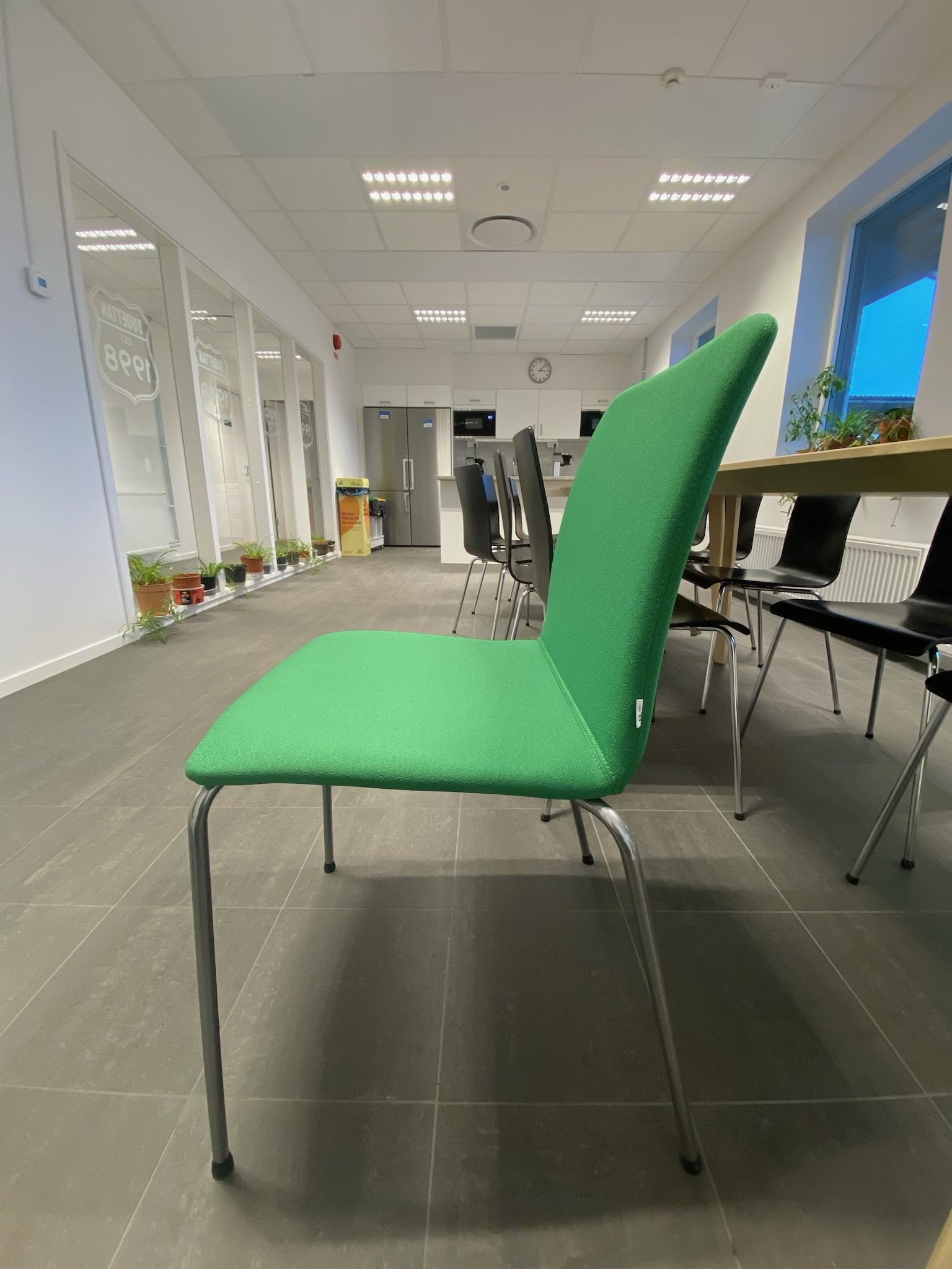 Sæde og ryg i stof (grøn). 4-bensstel i metal (sølv).