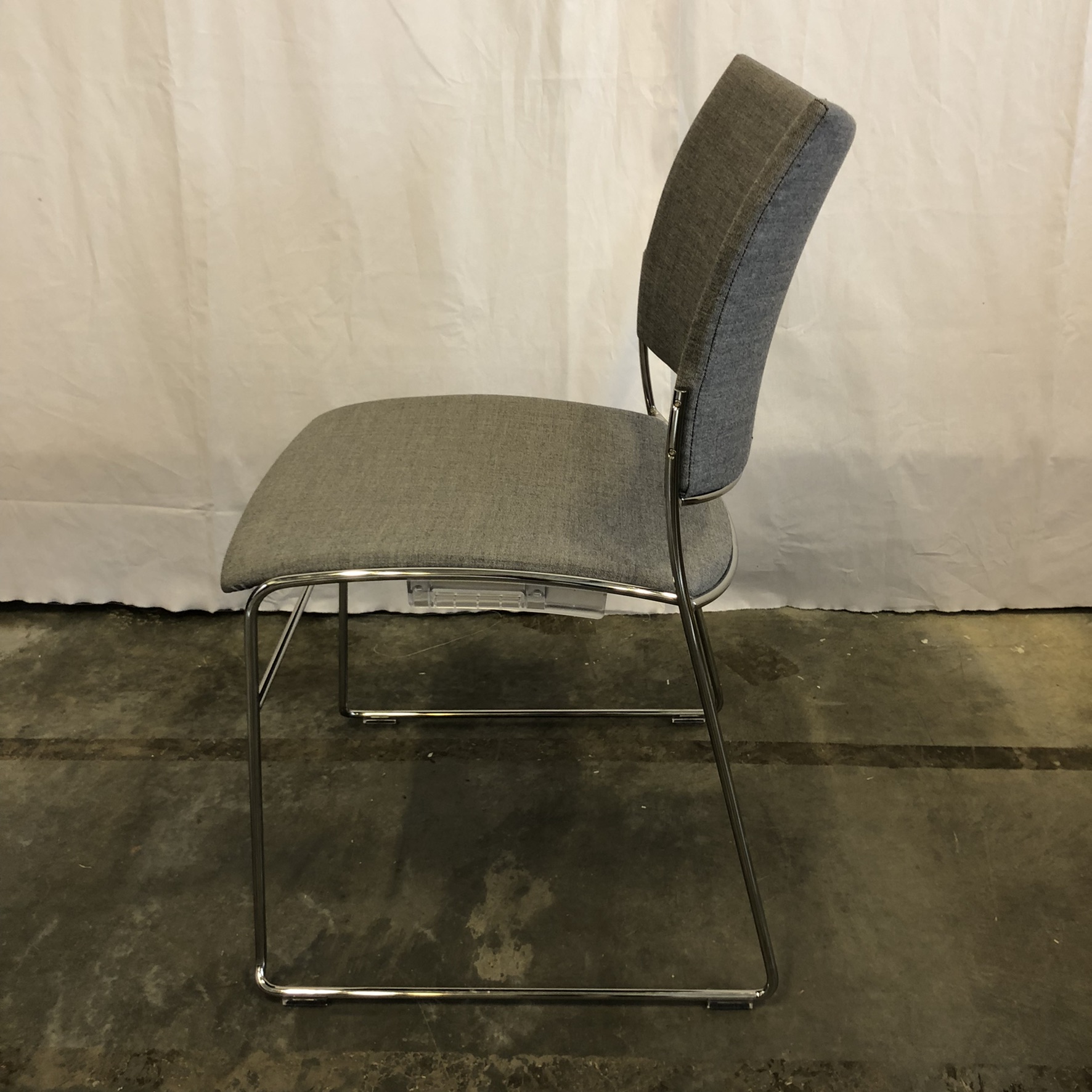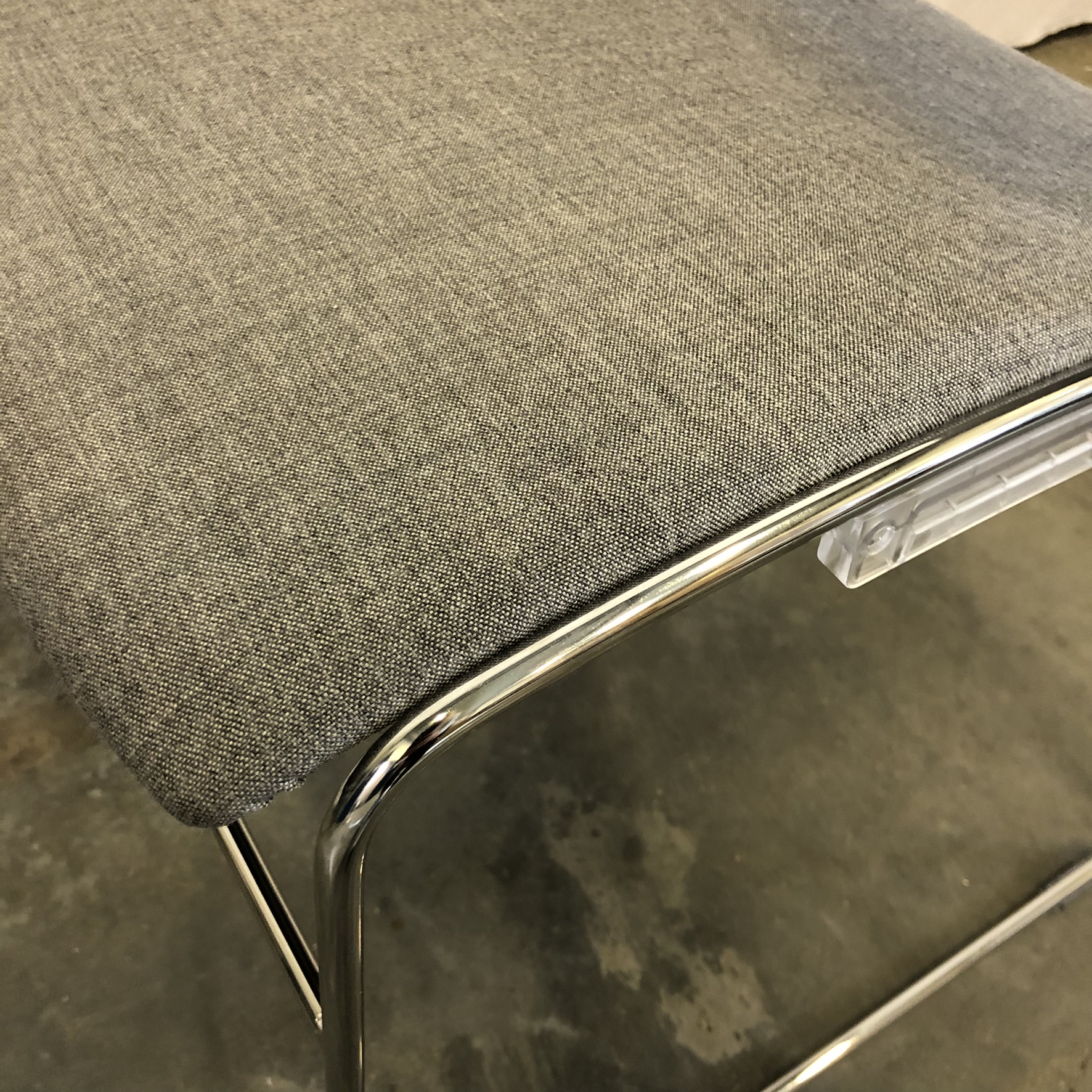 Sæde og ryg i stof (grå). Medestel i metal (krom).