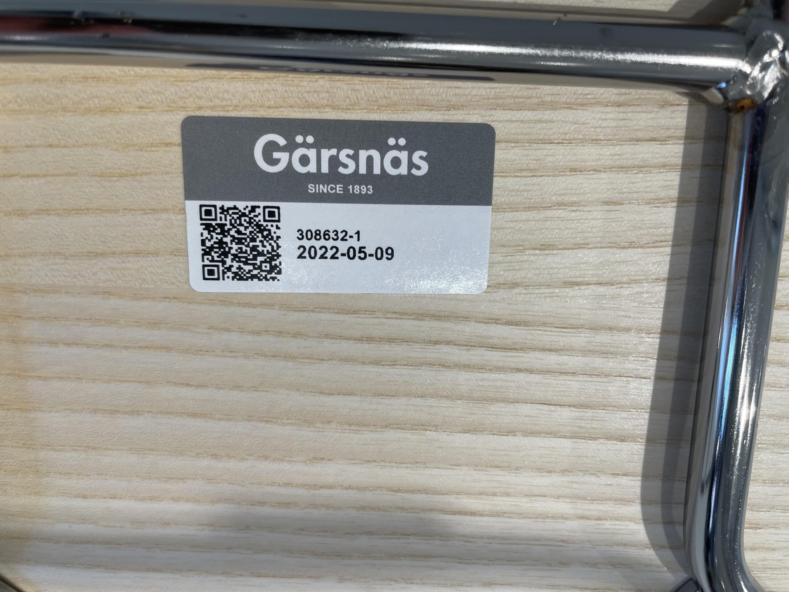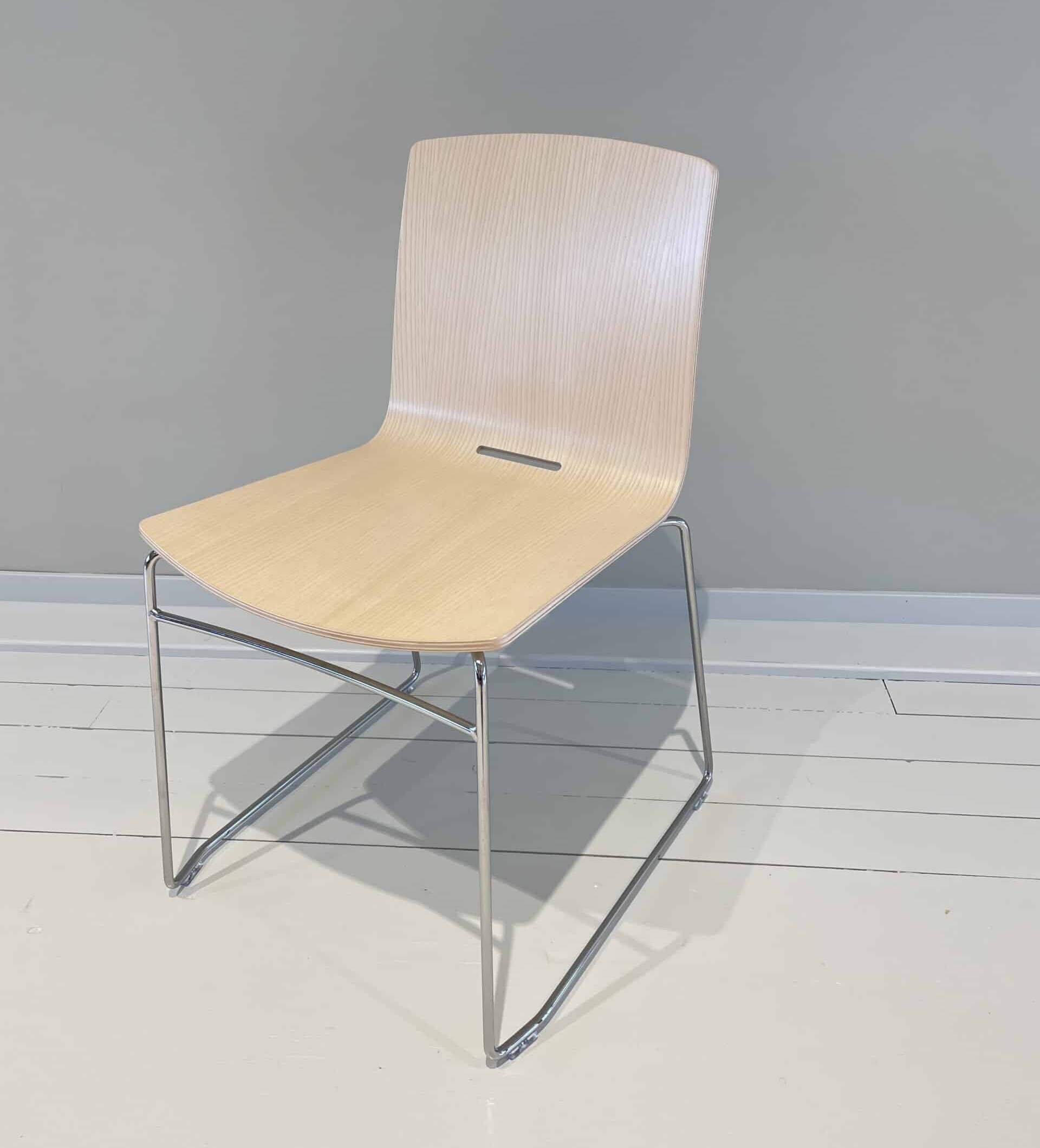 Sæde og ryg i træ (ask). Medestel i metal (krom).