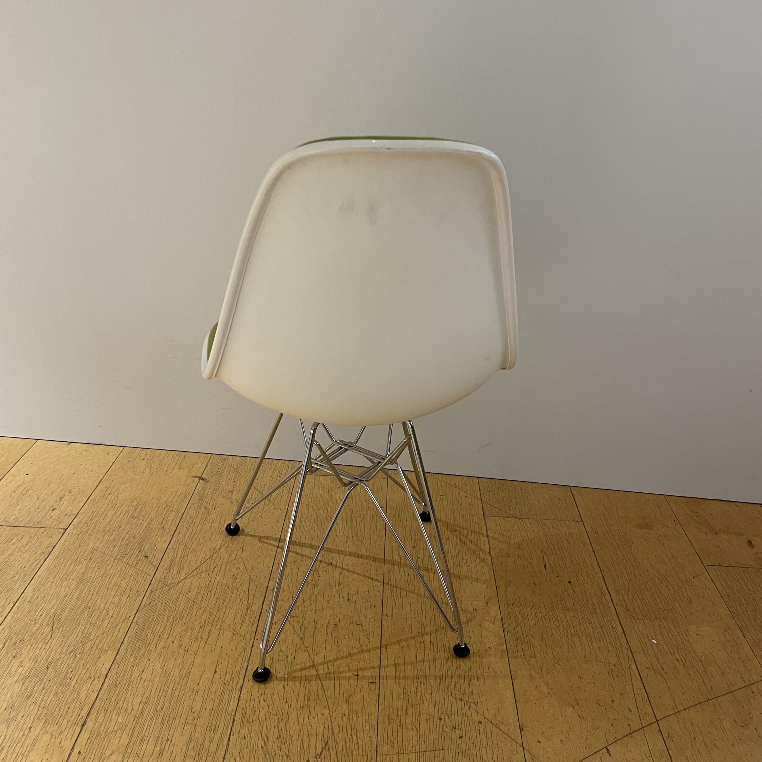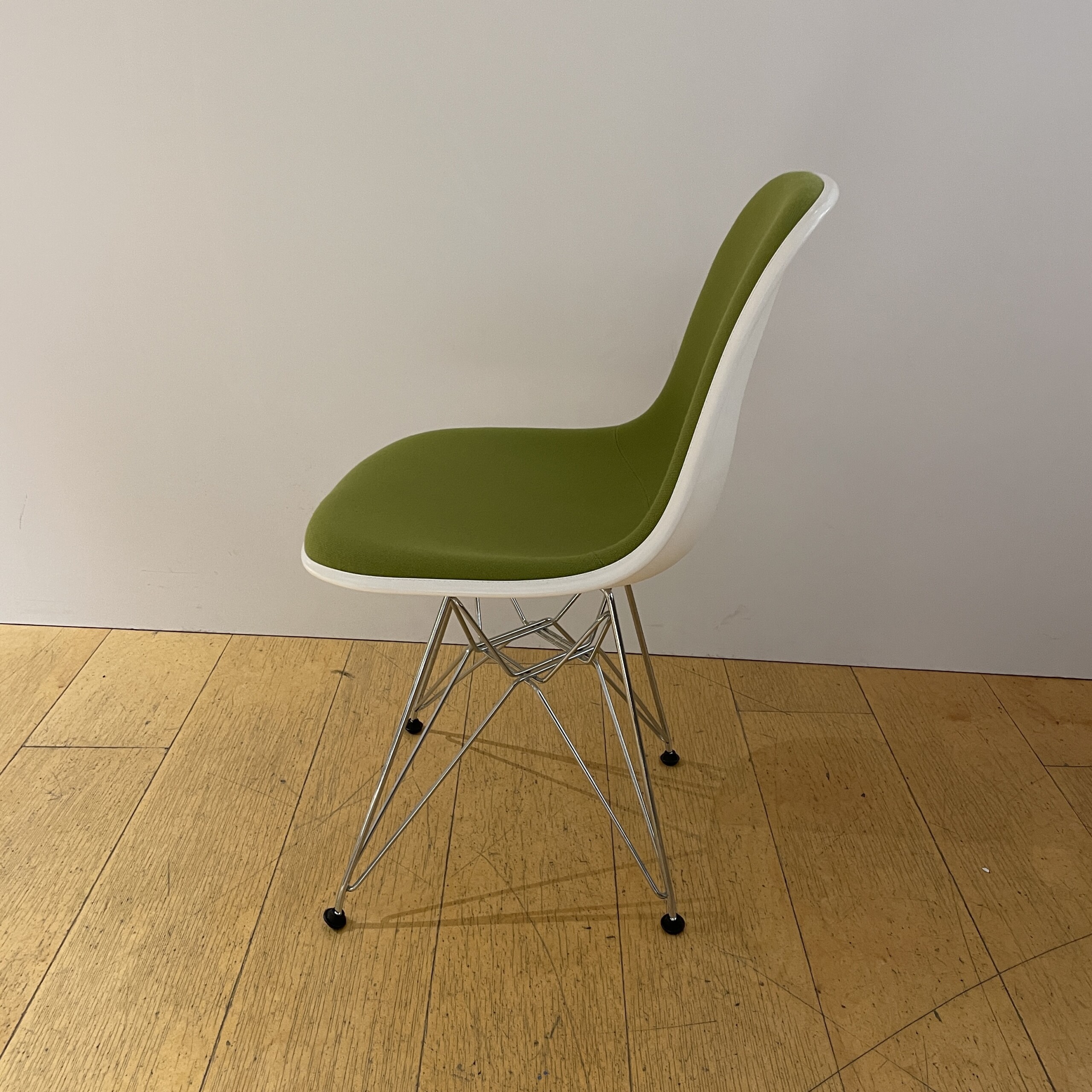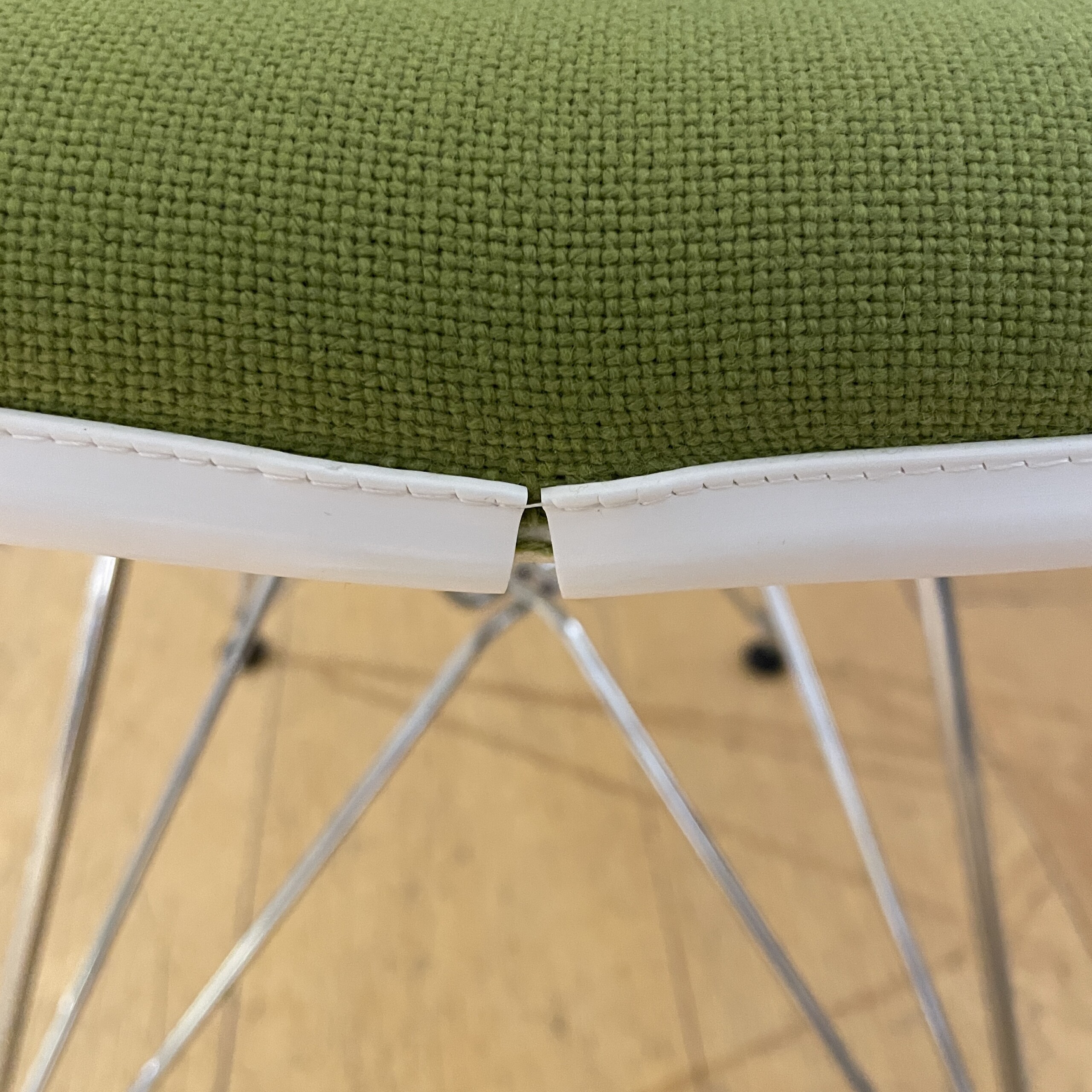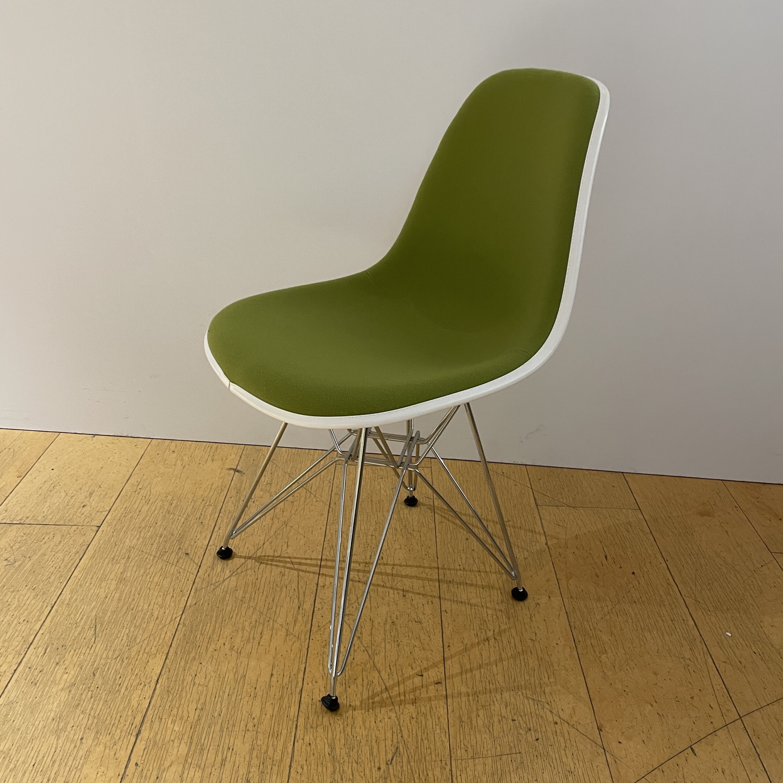 Sæde og ryg i stof (grøn). 4-bensstel i metal (krom).