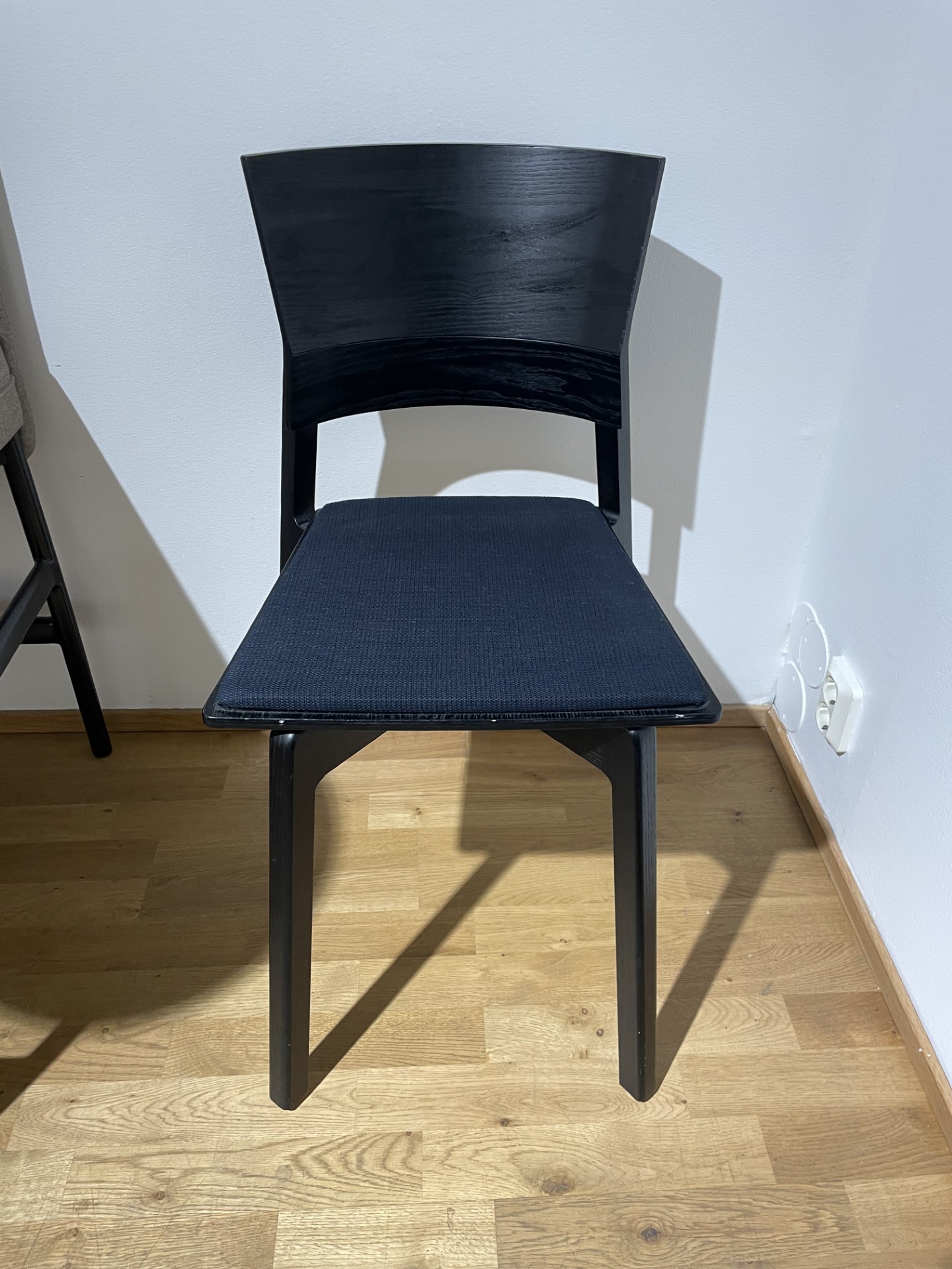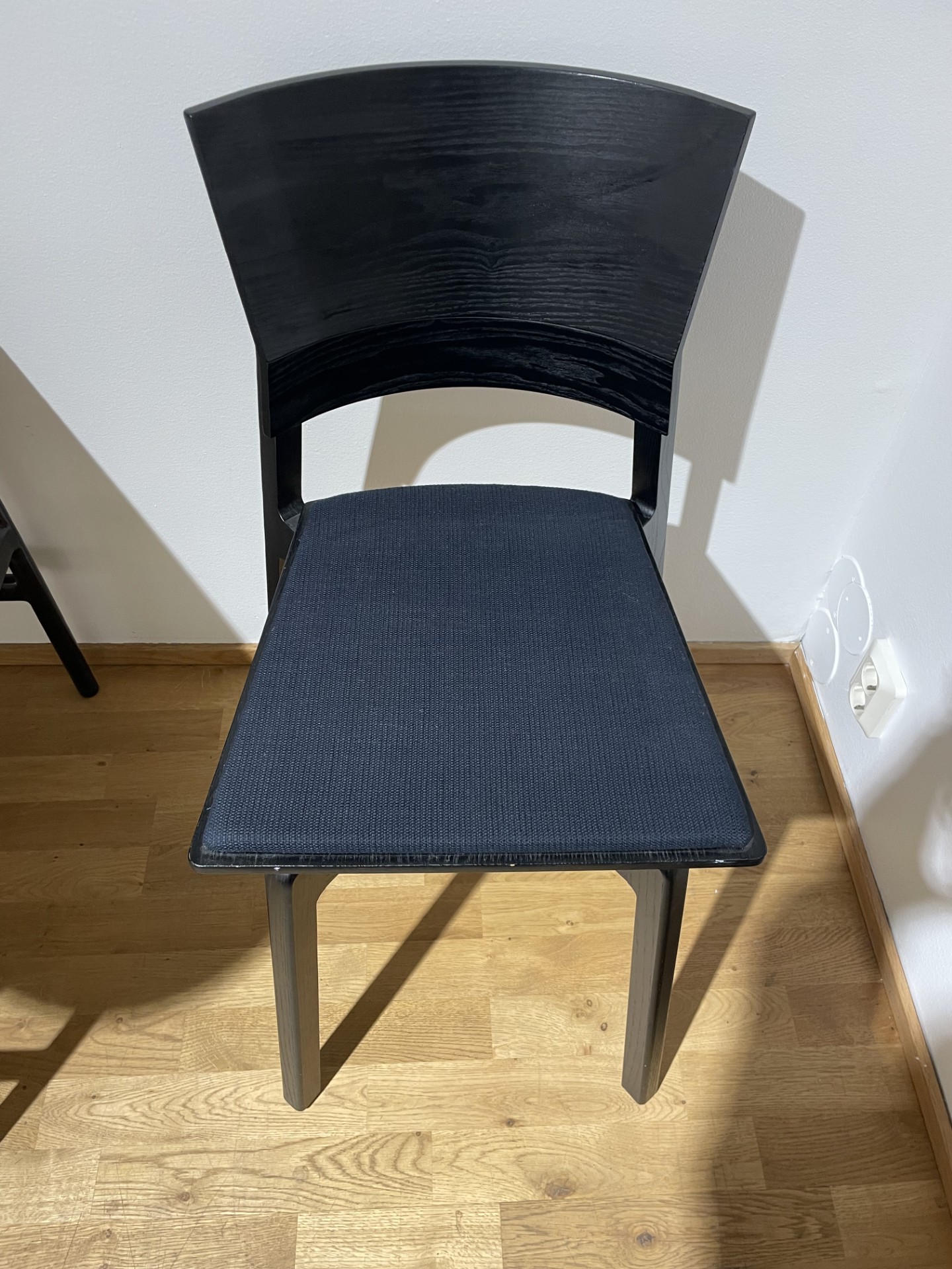 Sæde i stof (blå). Ryg i træ (sort). 4-bensstel i træ (sort).