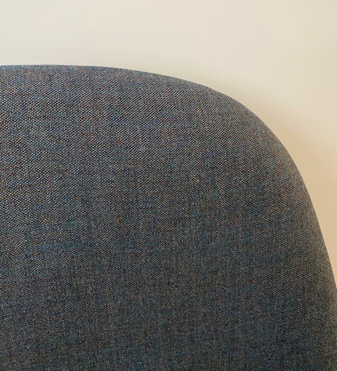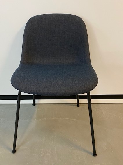Sæde og ryg i stof (blå). 4-bensstel i metal (sort).