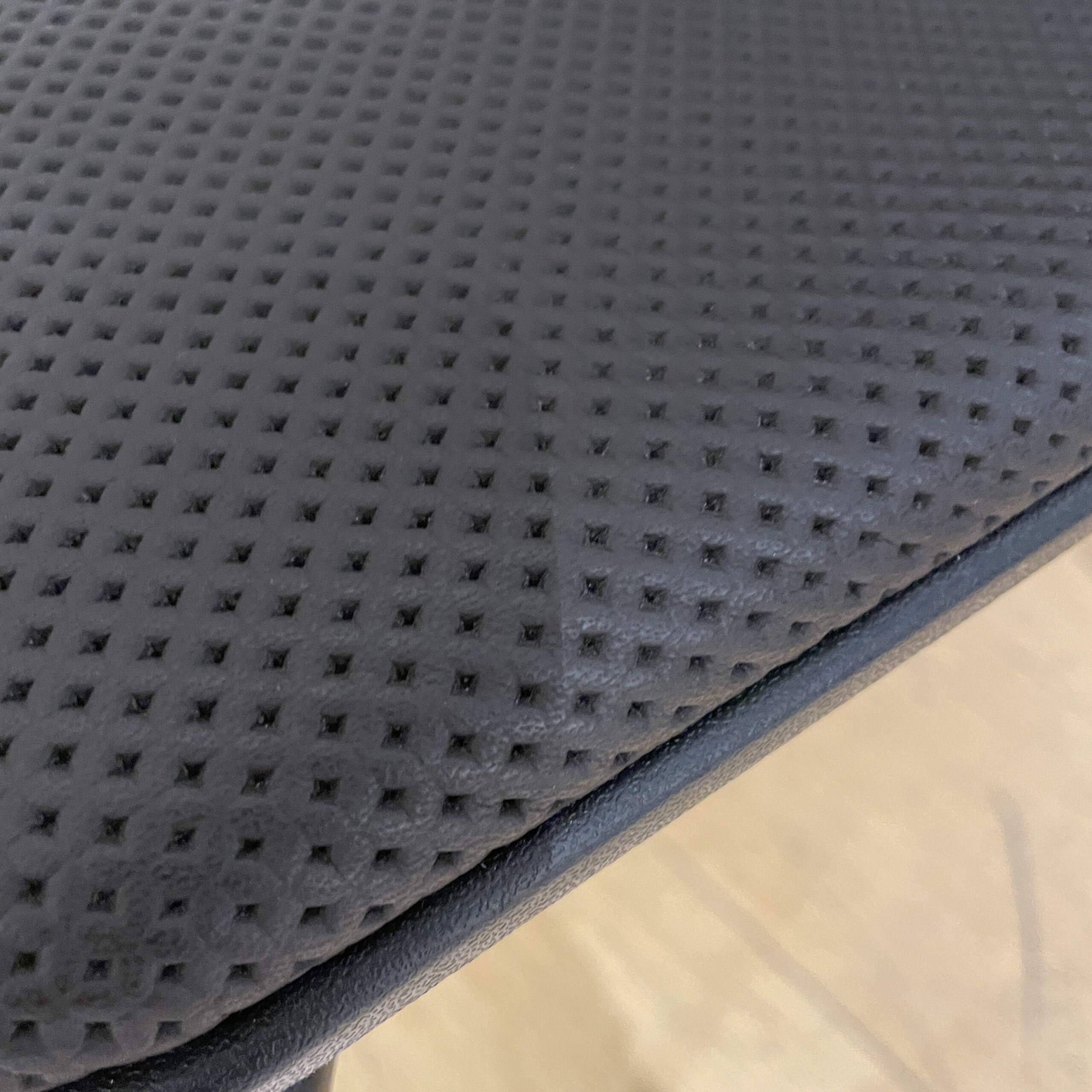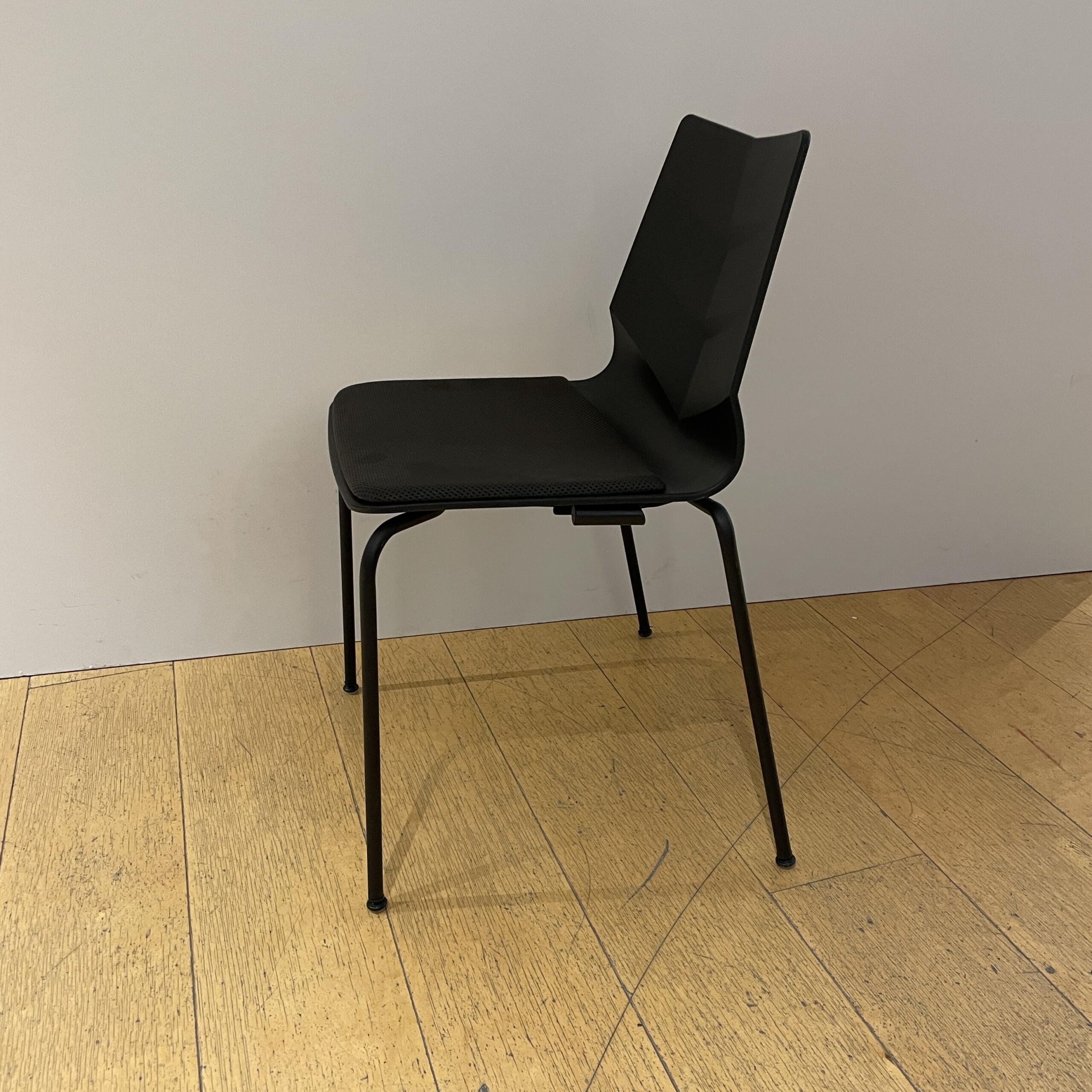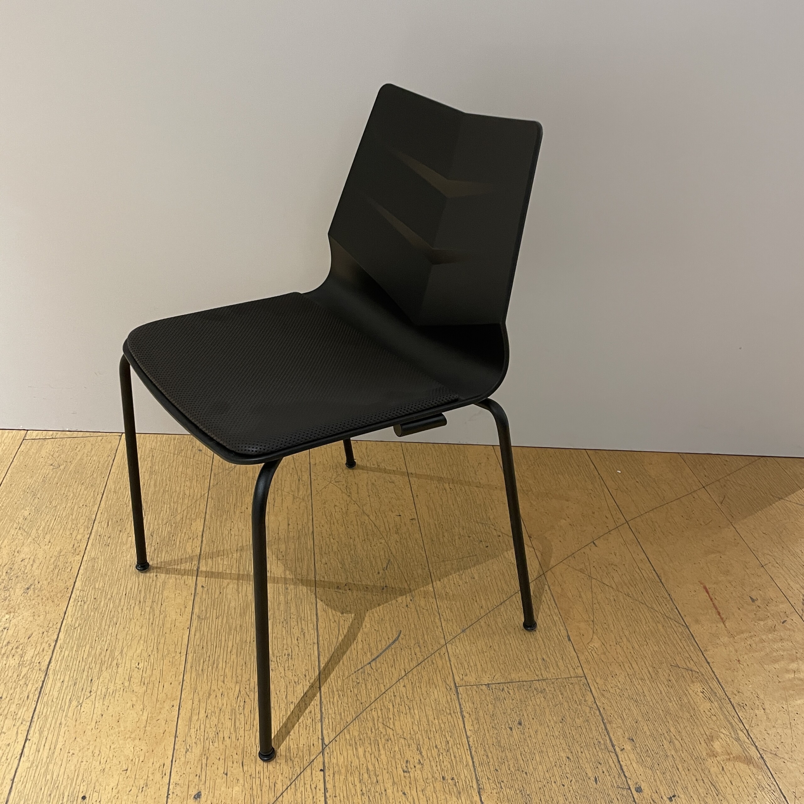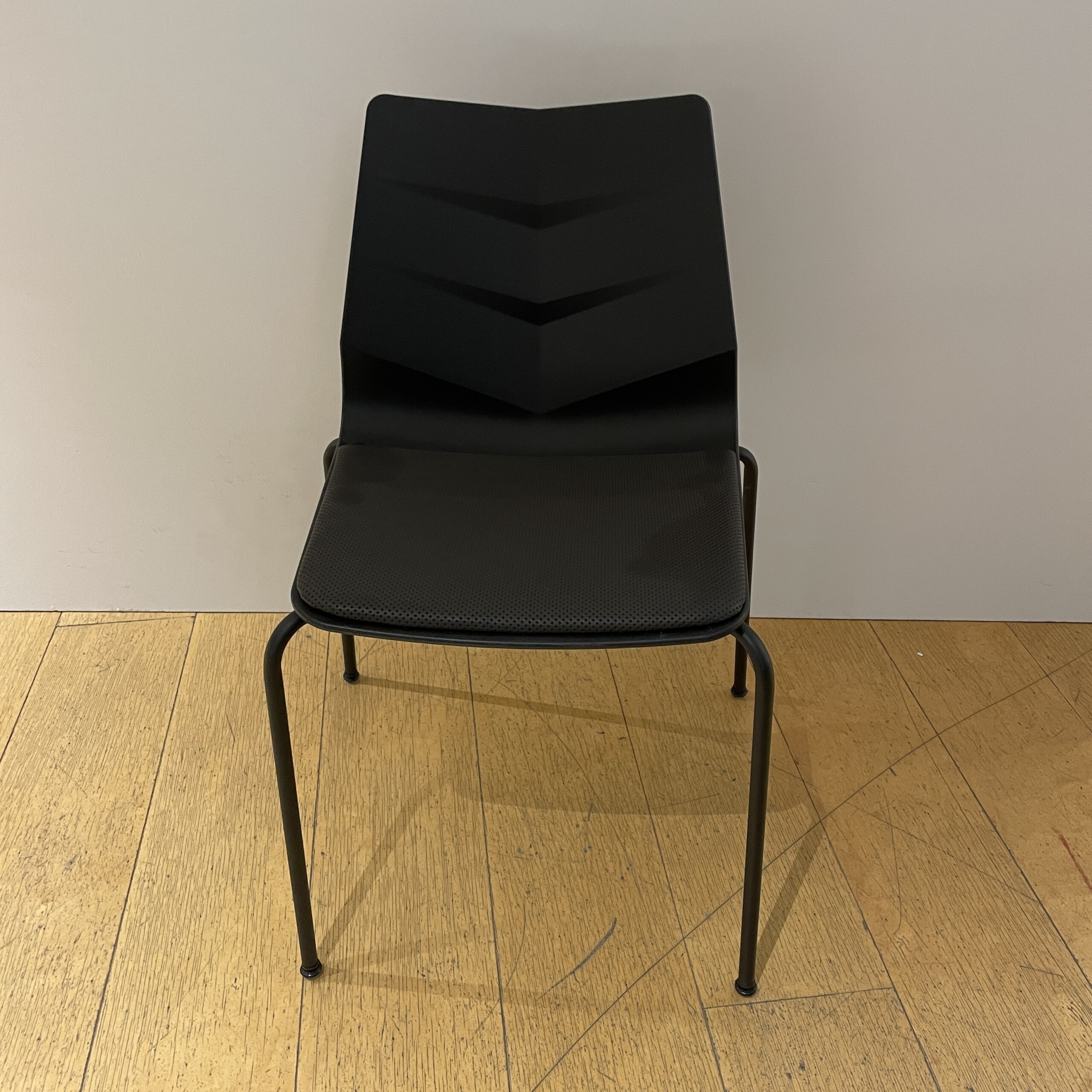 Sæde i læder (brun). Ryg i plast (sort). 4-bensstel i metal (sort).