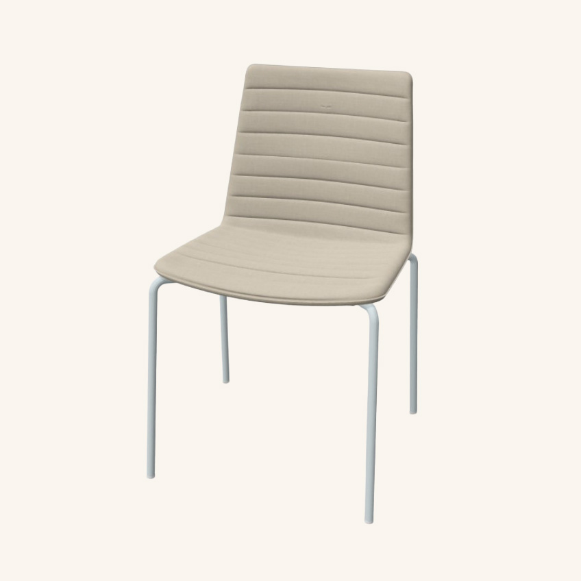 Sæde og ryg i stof (beige). 4-bensstel i metal (rustfri).
