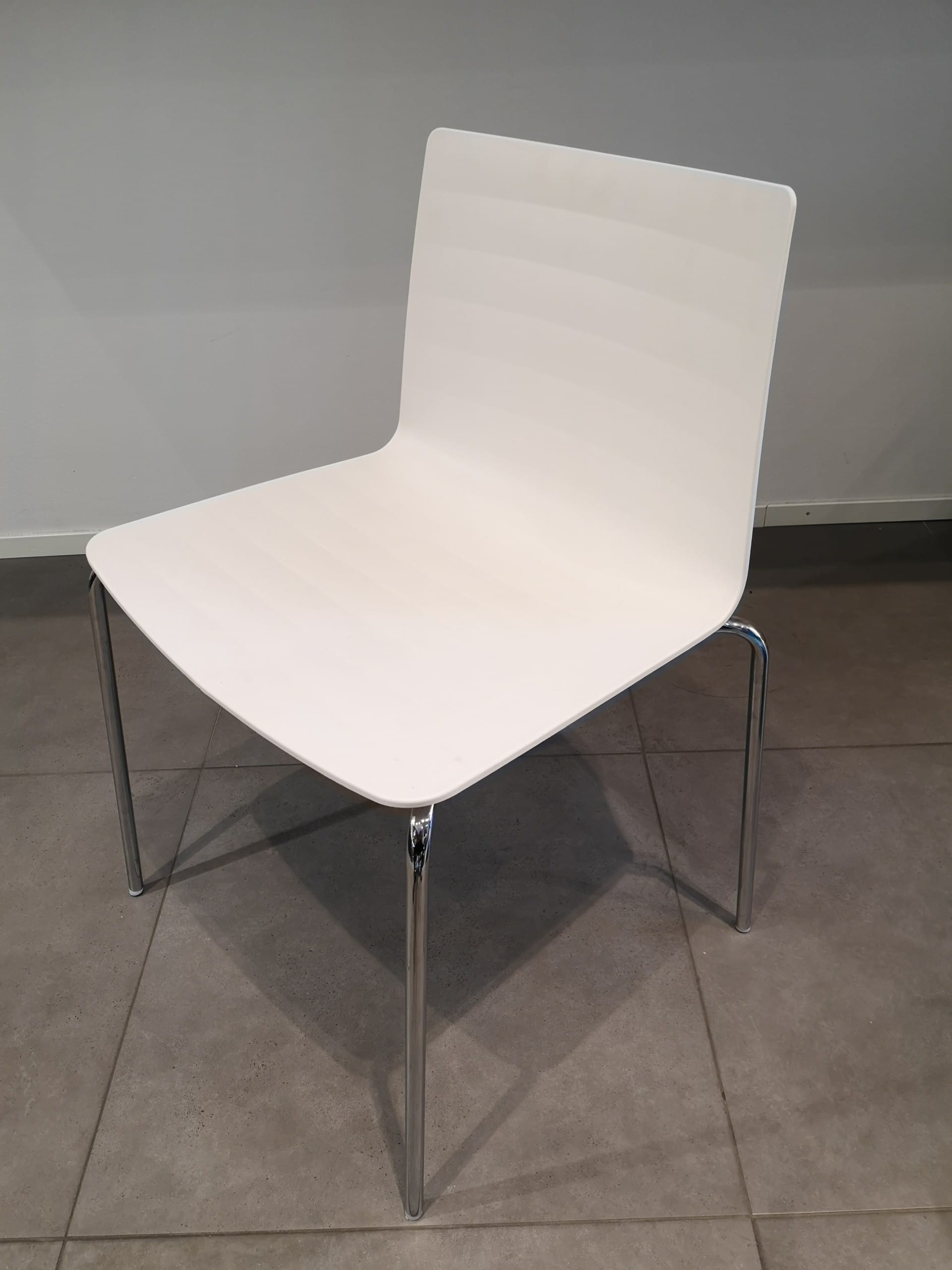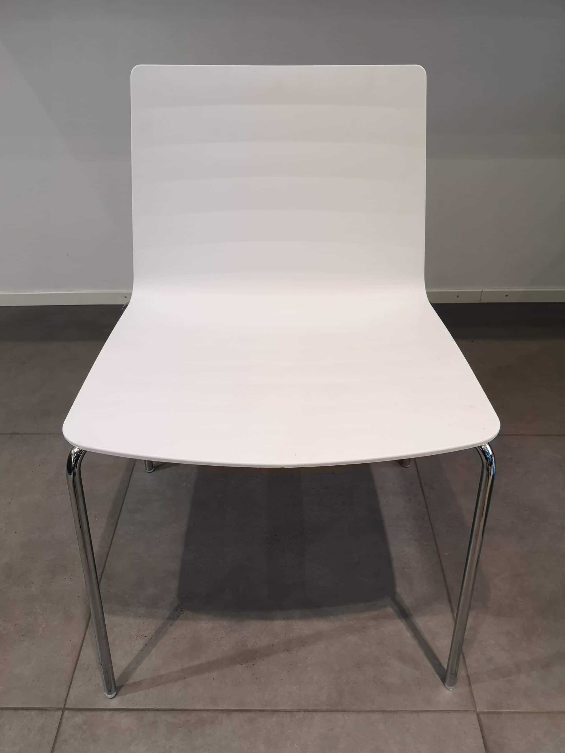 Sæde og ryg i plast (hvid). 4-bensstel i metal (krom).