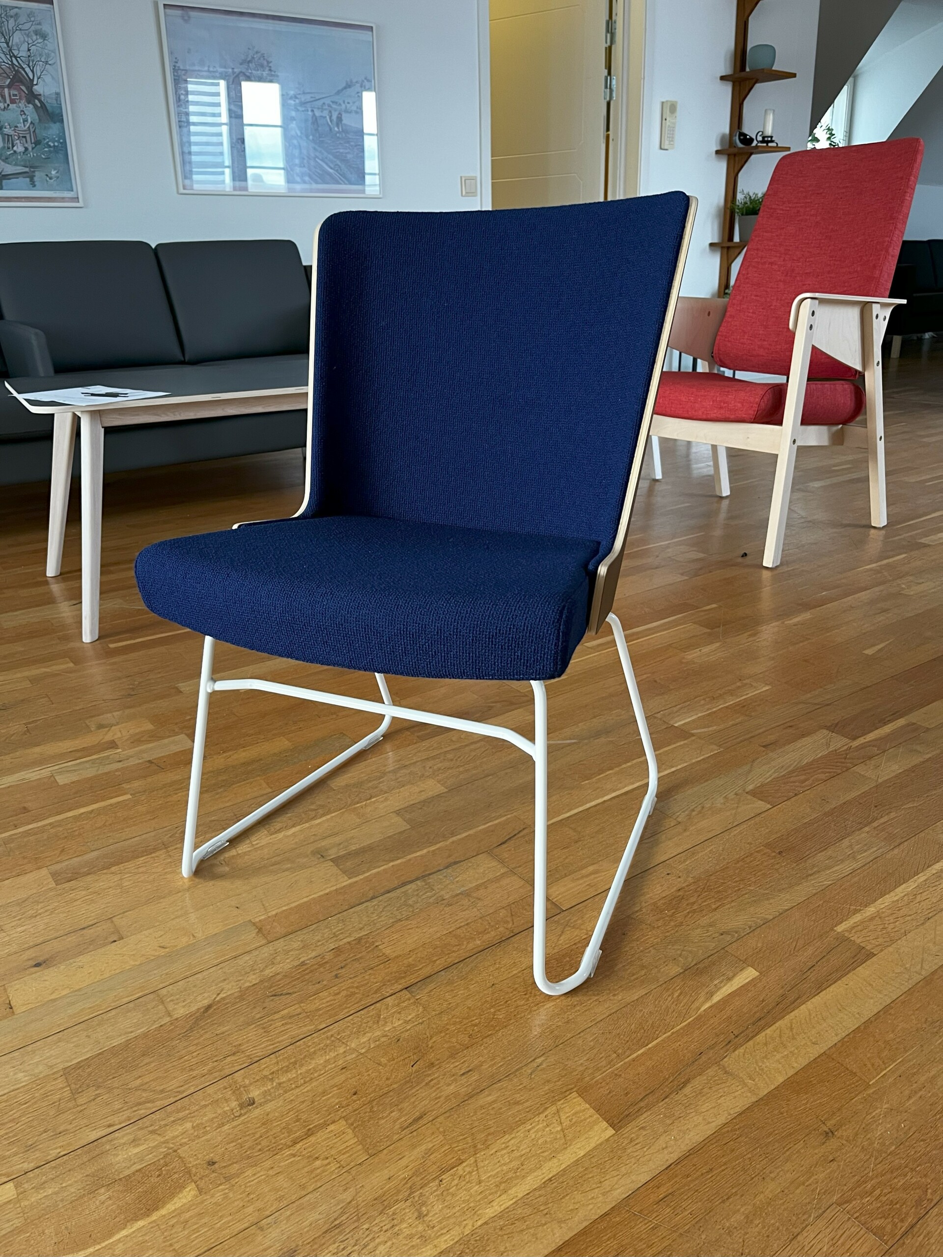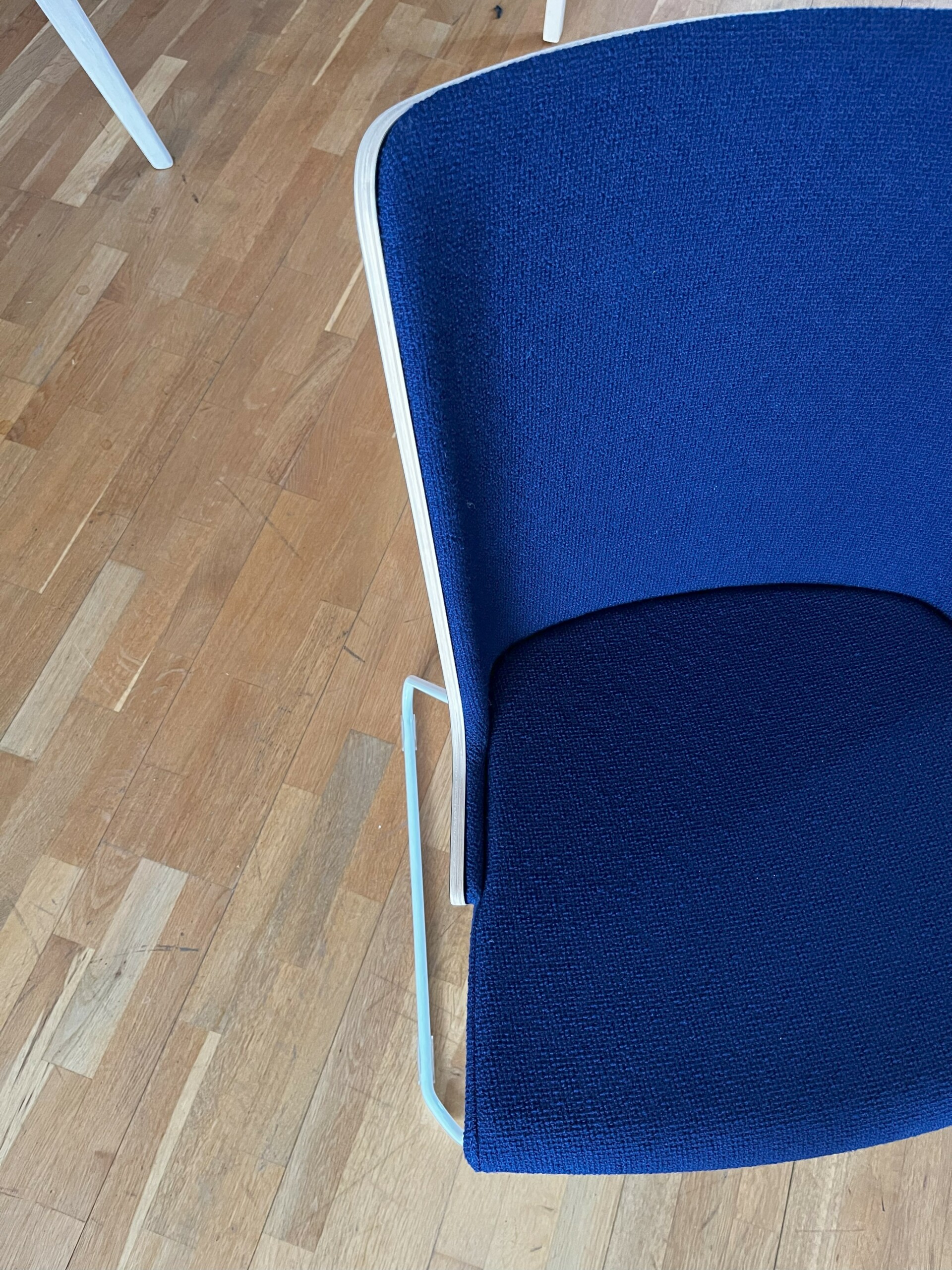 Sæde og ryg i stof (blå). Medestel i metal (hvid).