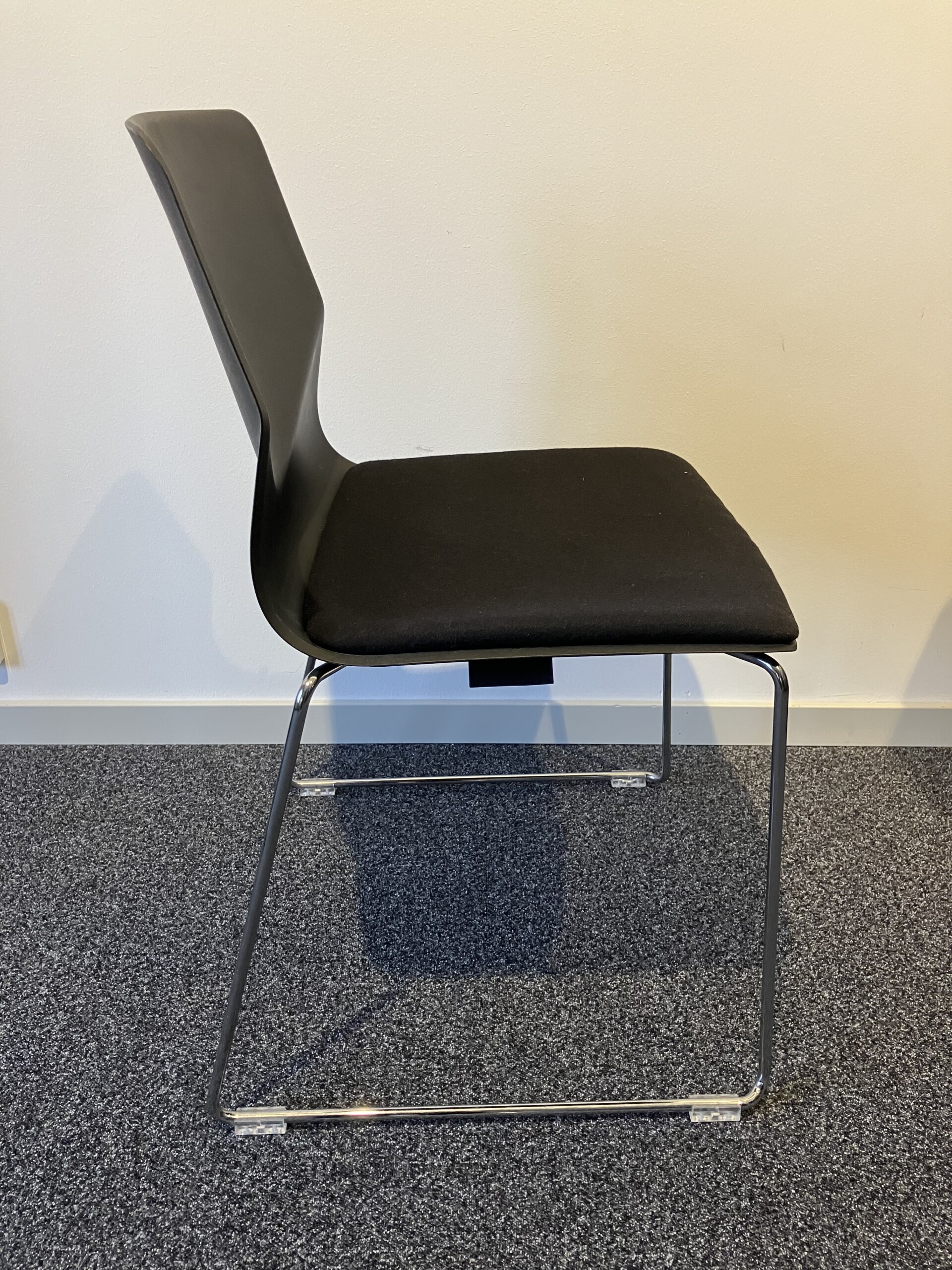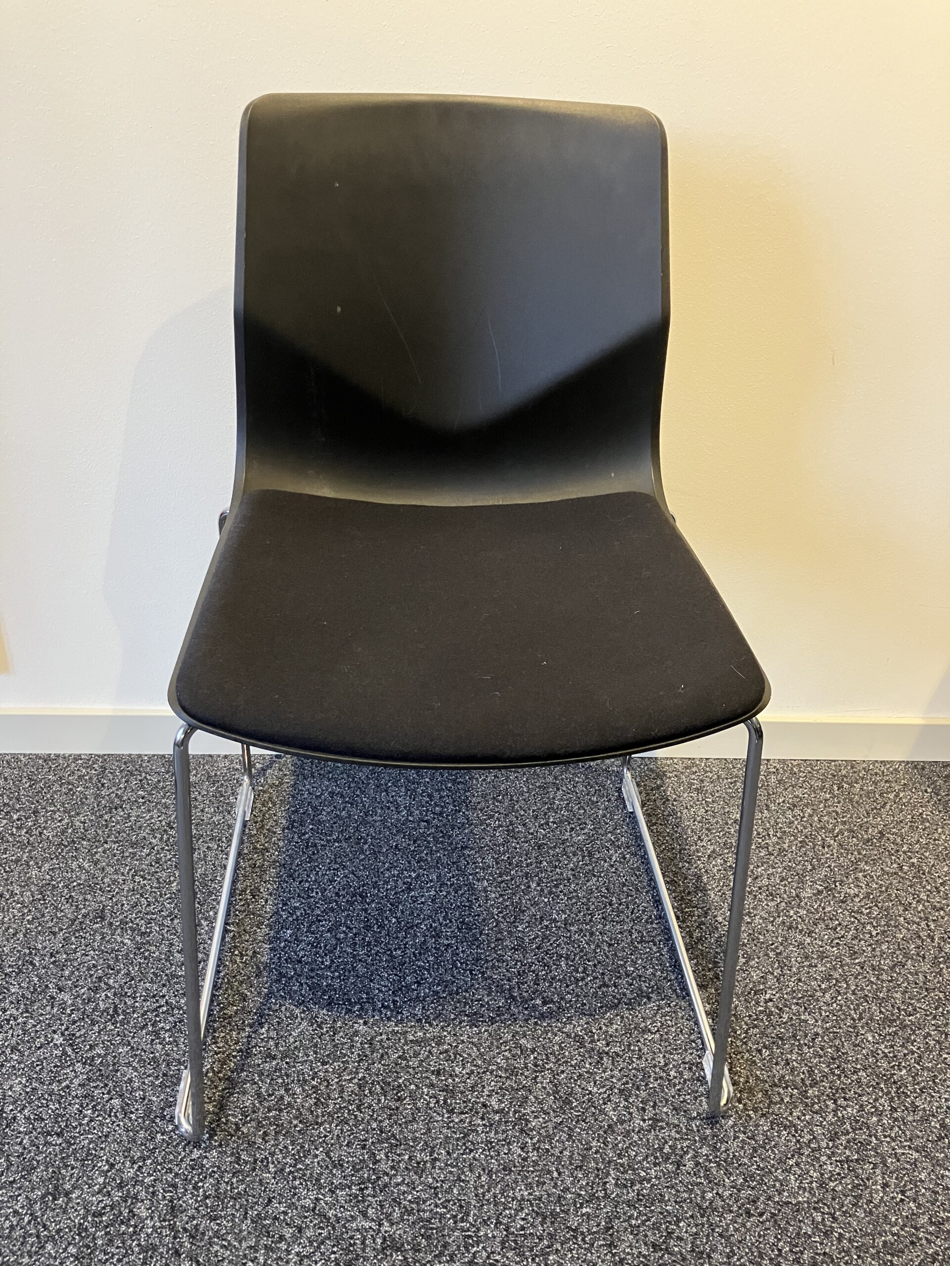 Sæde i stof (sort). Ryg i plast (sort). Medestel i metal (krom).