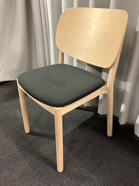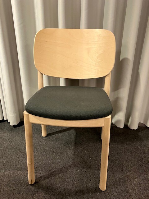 Sæde i stof (grøn). Ryg i træ (birk). 4-bensstel i træ (birk).