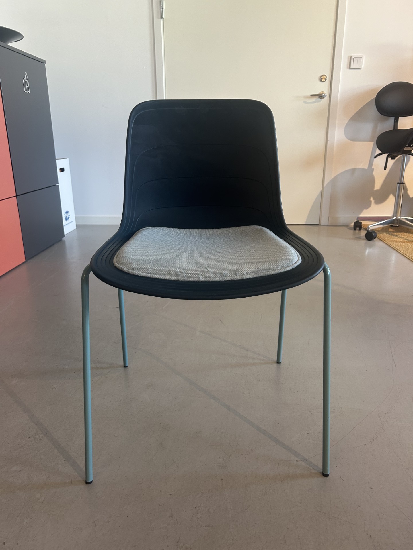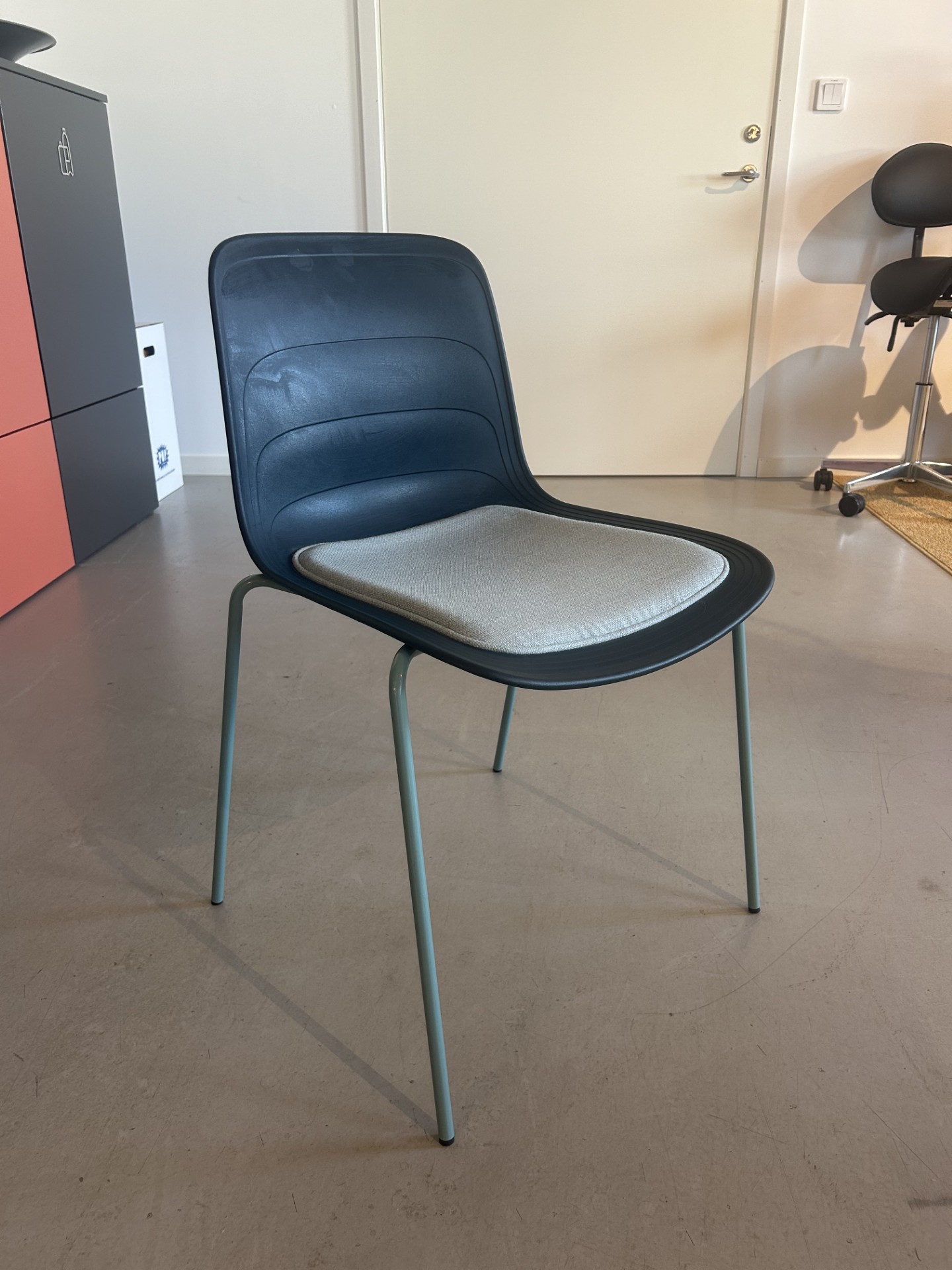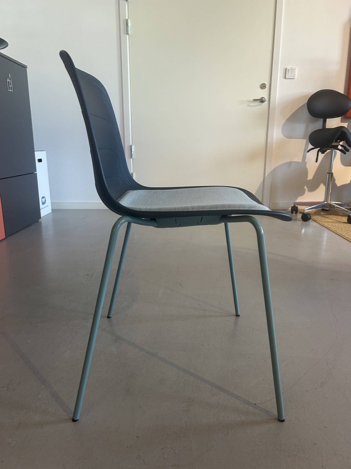 Sæde i stof (turkis). Ryg i plast (blå). 4-bensstel i metal (turkis).