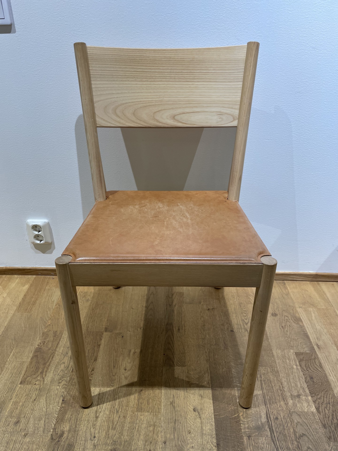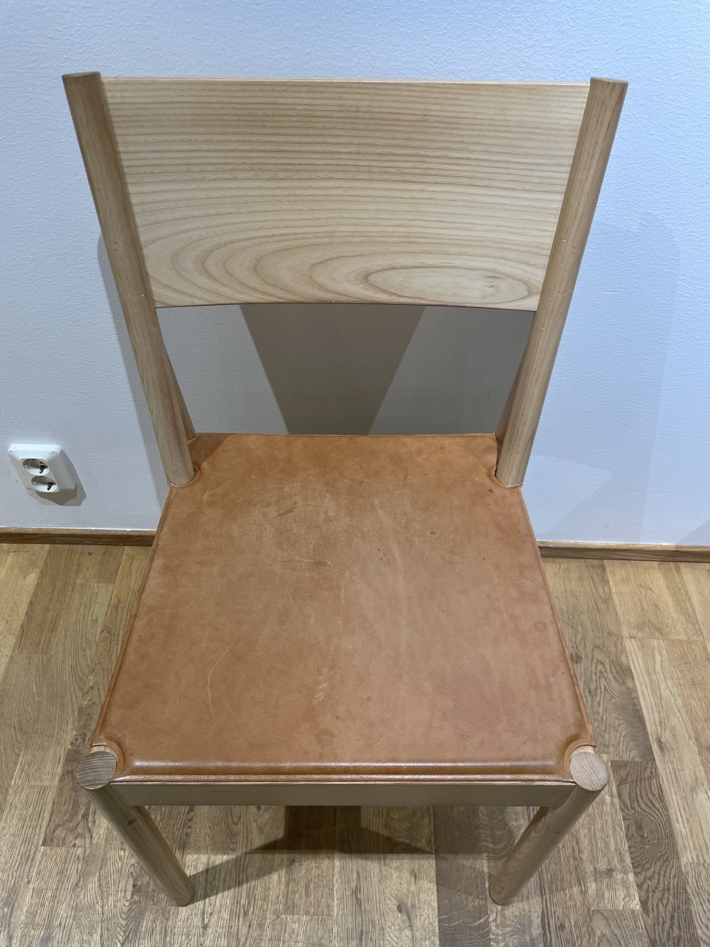 Sæde i læder (brun). Ryg i træ (ask). 4-bensstel i træ (ask).