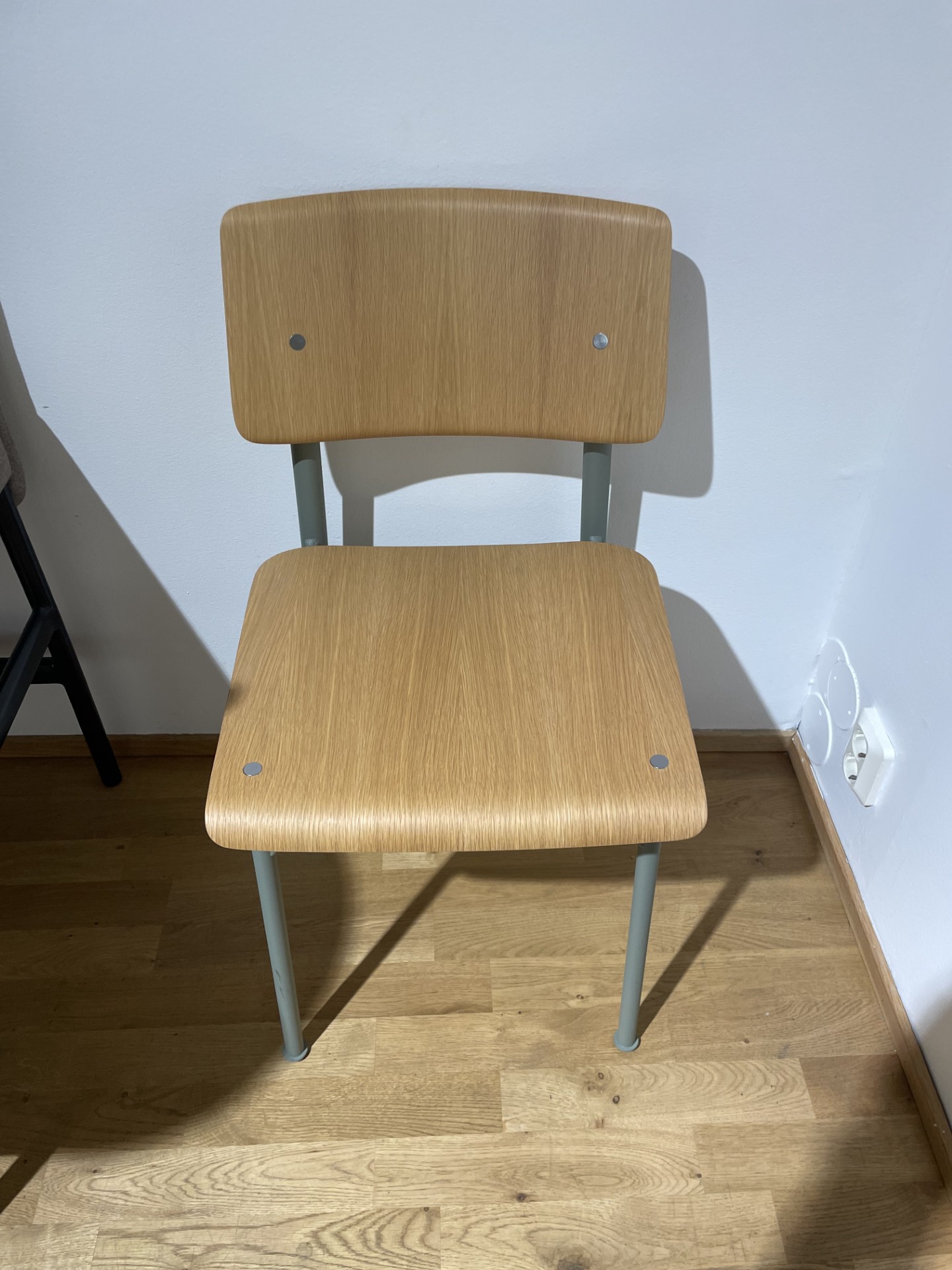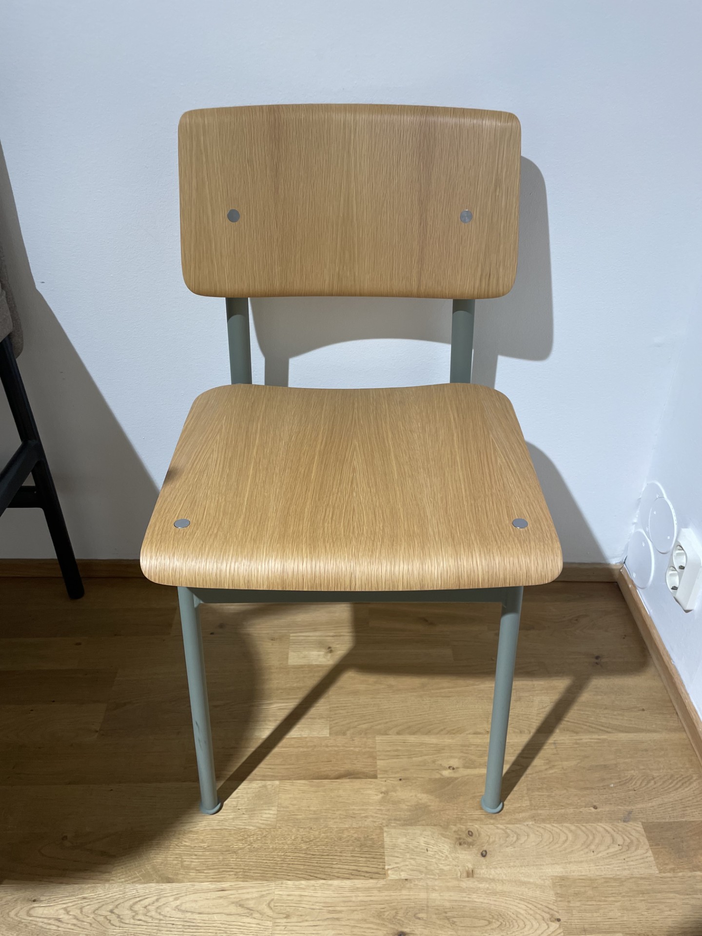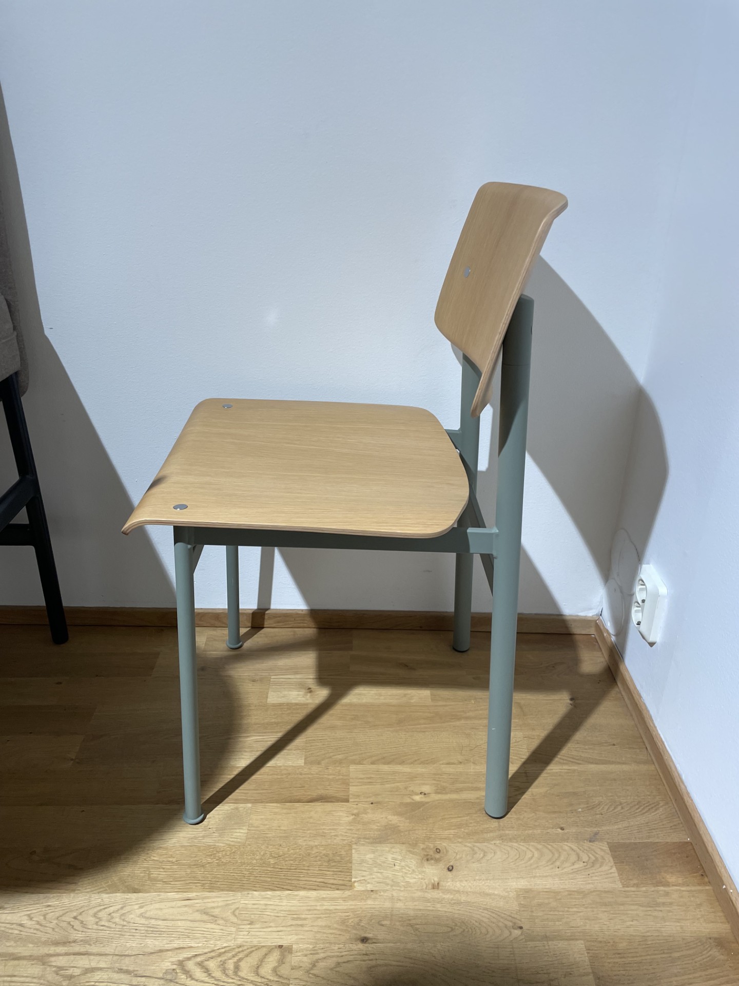 Sæde og ryg i træ (eg). 4-bensstel i metal (grøn).