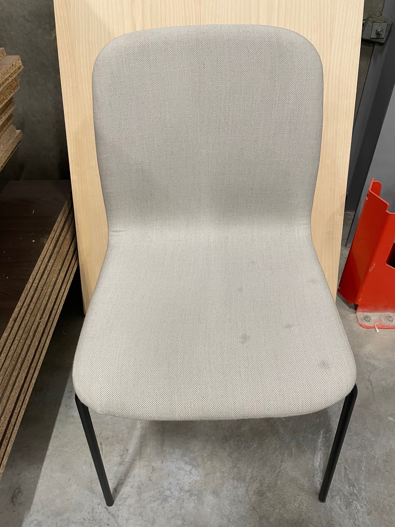 Sæde og ryg i stof (beige). 4-bensstel i metal (sort).