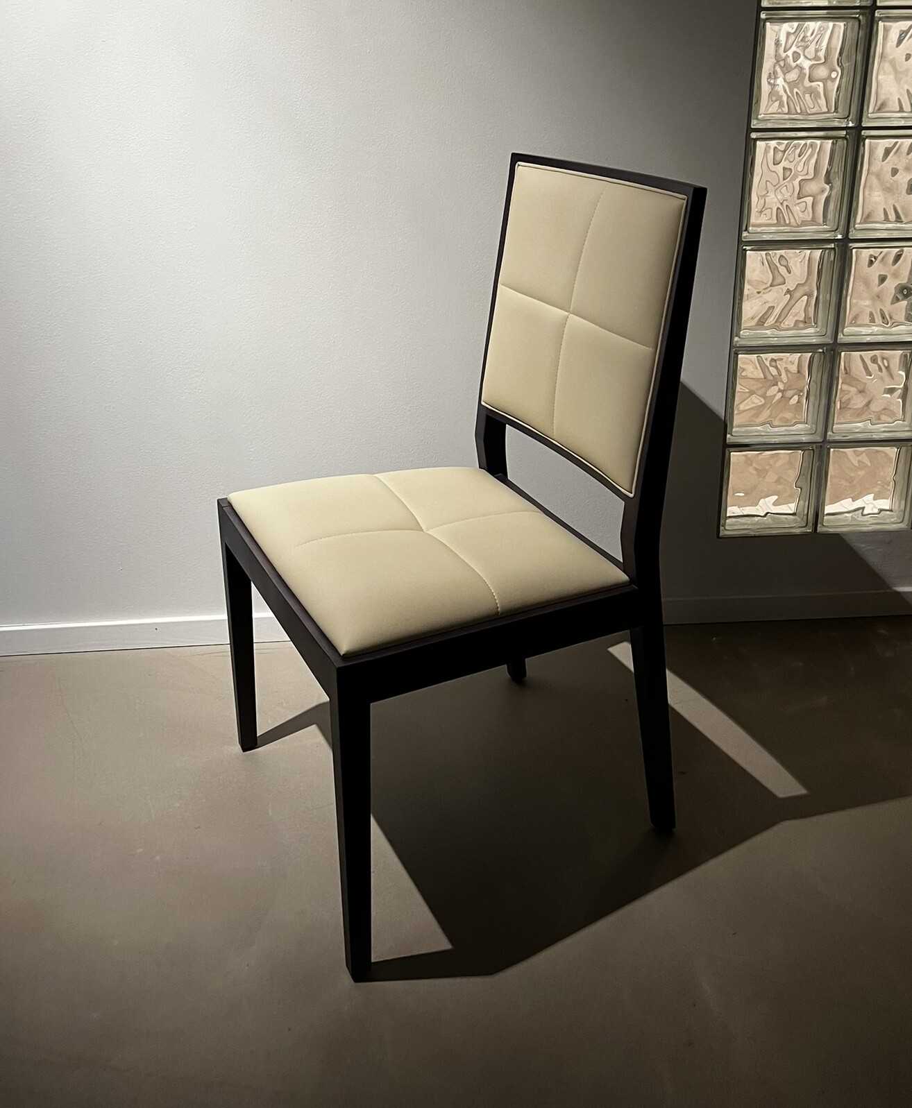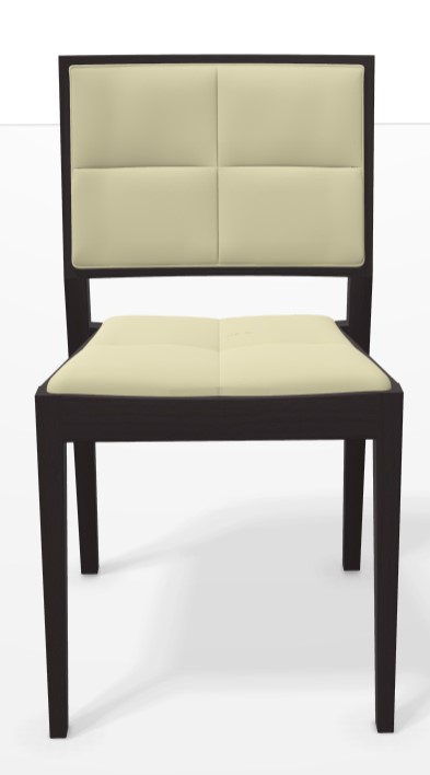 Sæde og ryg i læder (hvid). 4-bensstel i træ (birk).