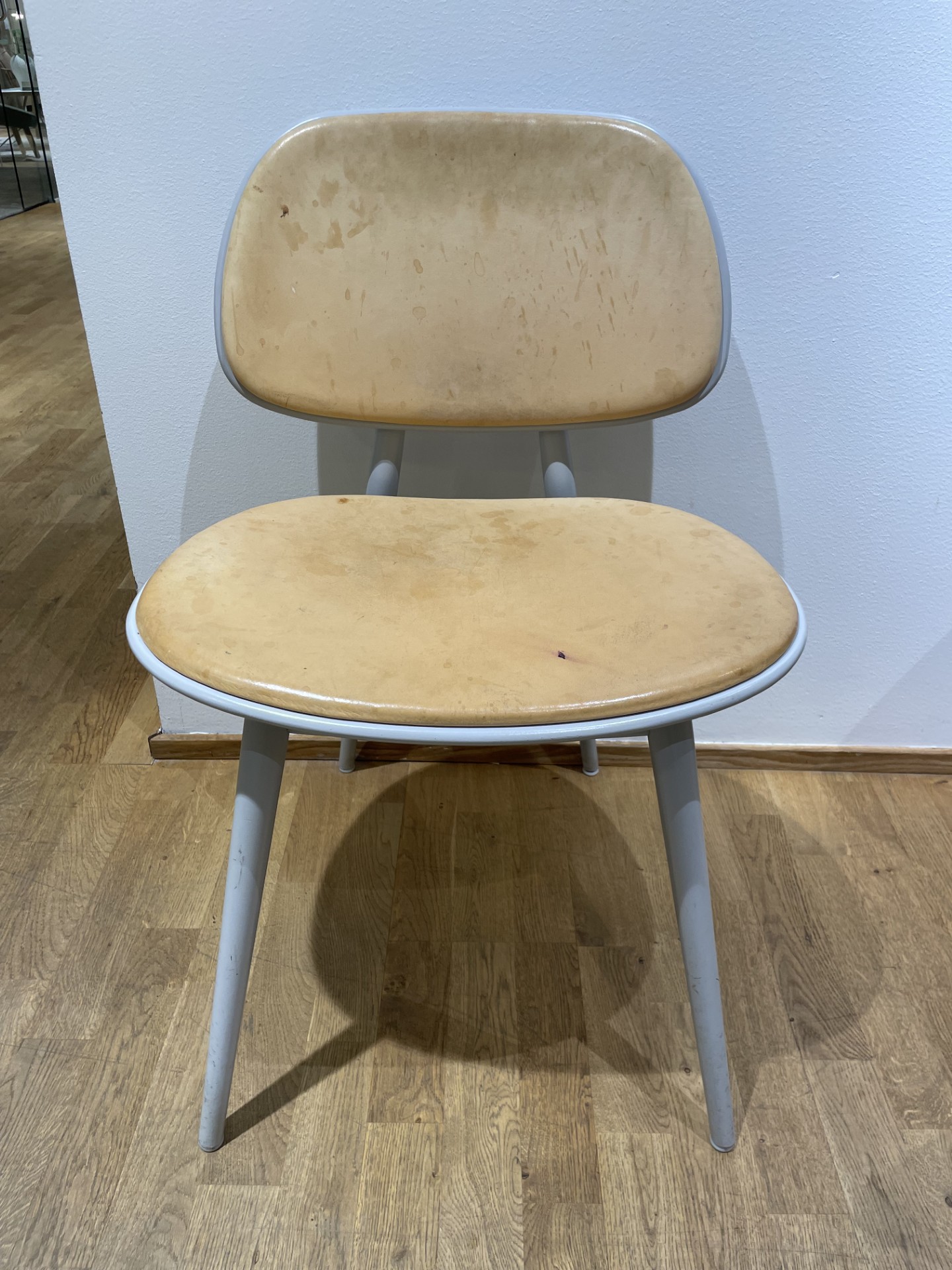 Sæde og ryg i læder. 4-bensstel i træ (grå).