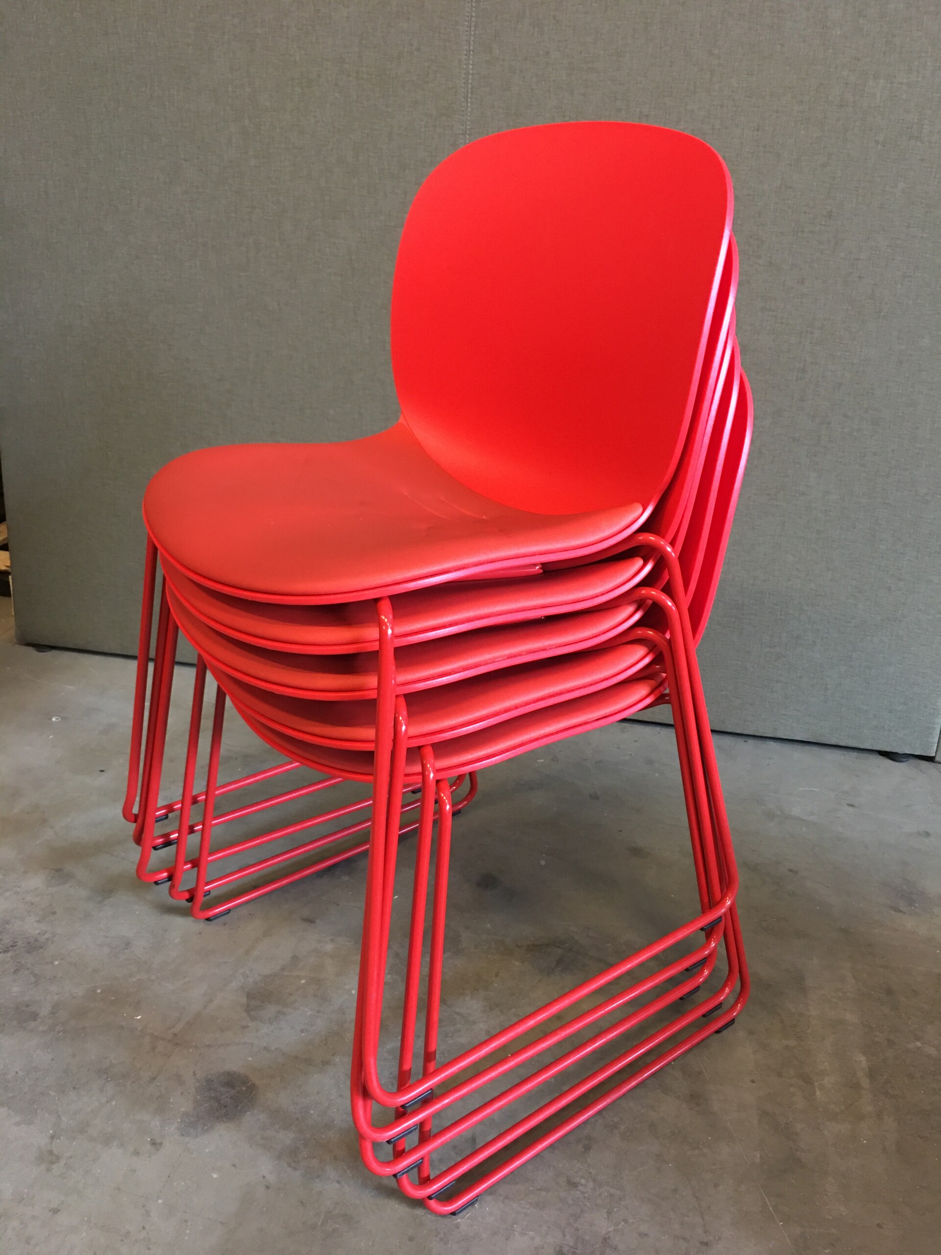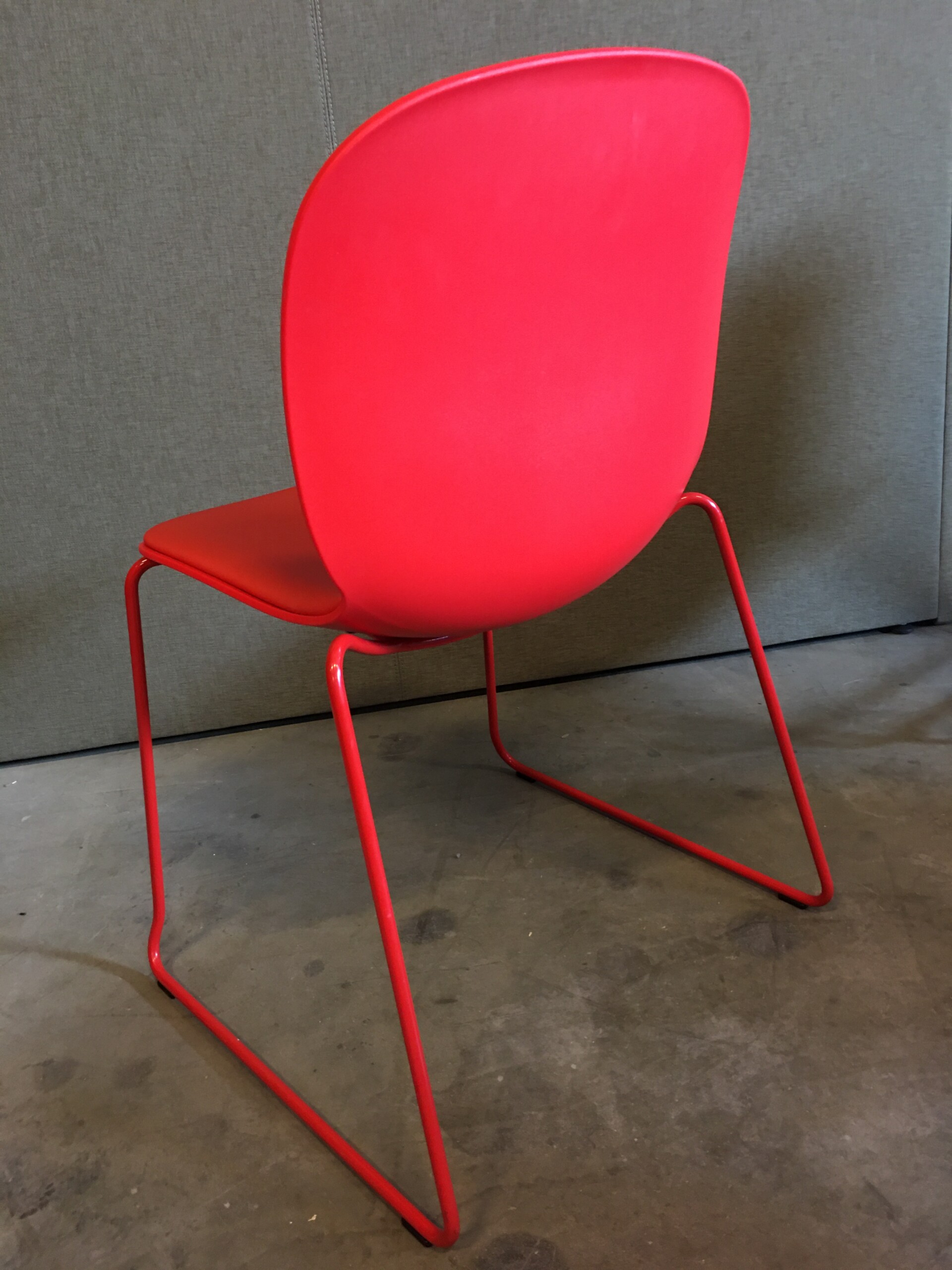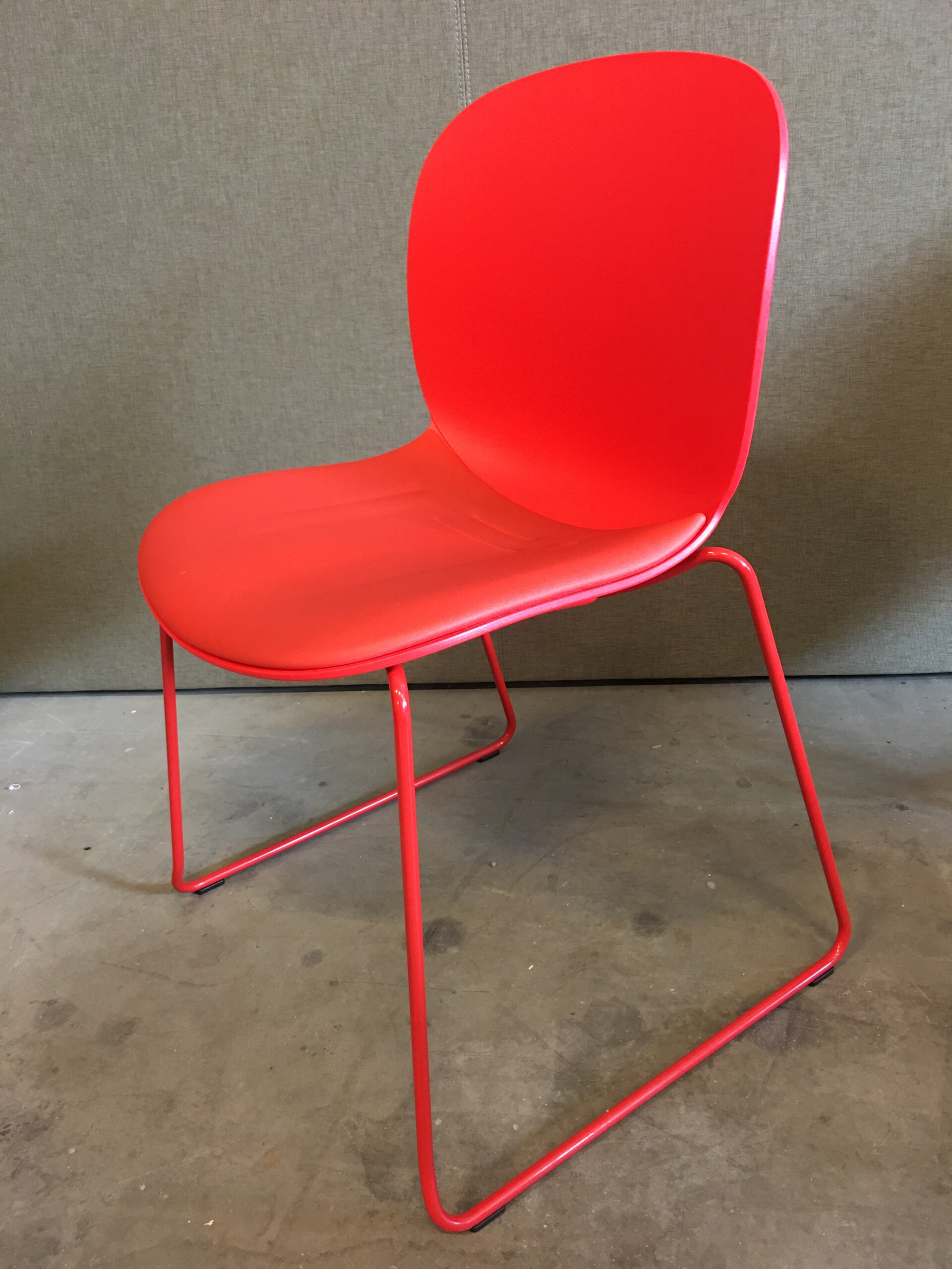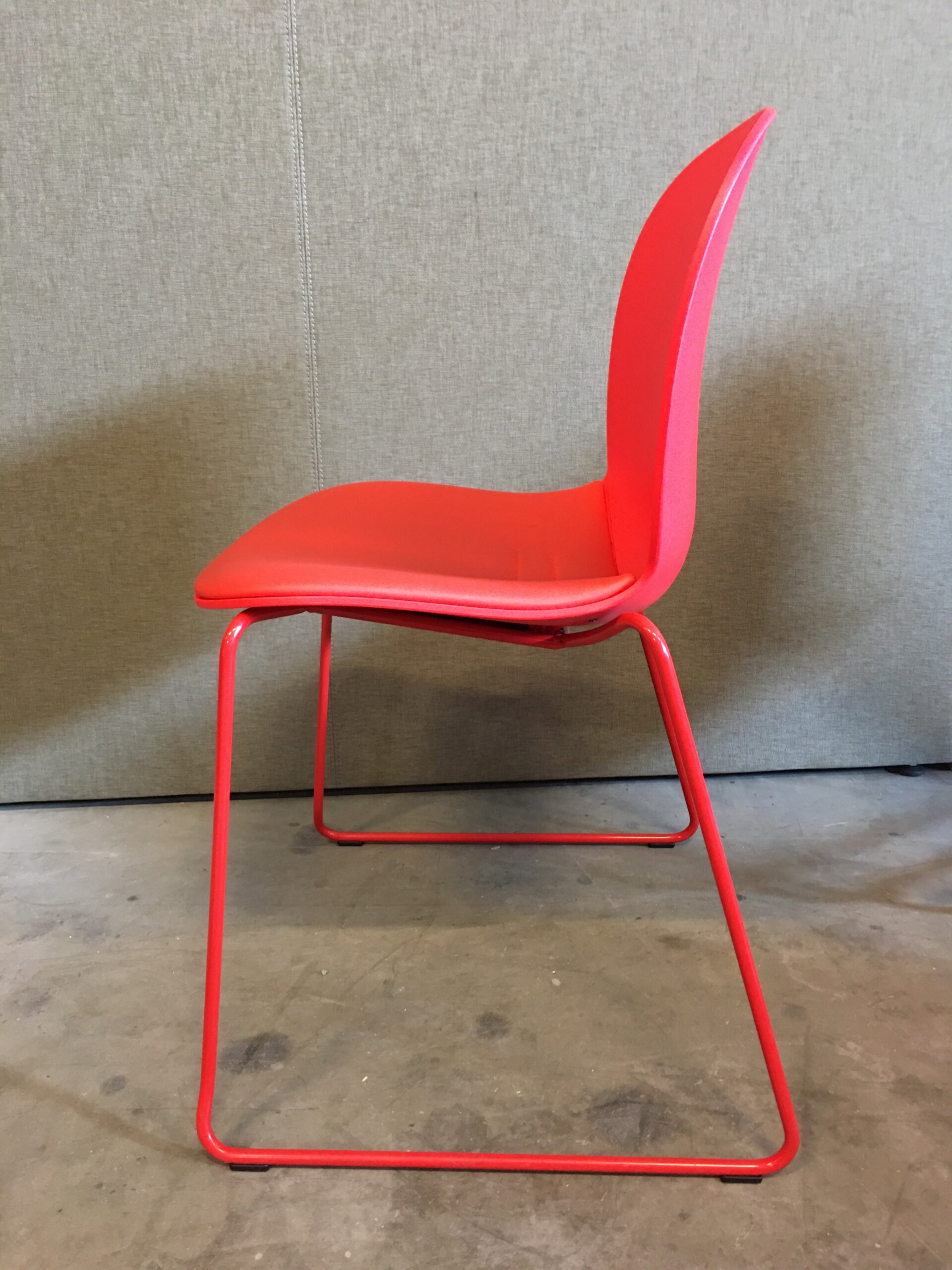 Sæde i stof (rød). Ryg i plast (rød). Medestel i metal (rød).