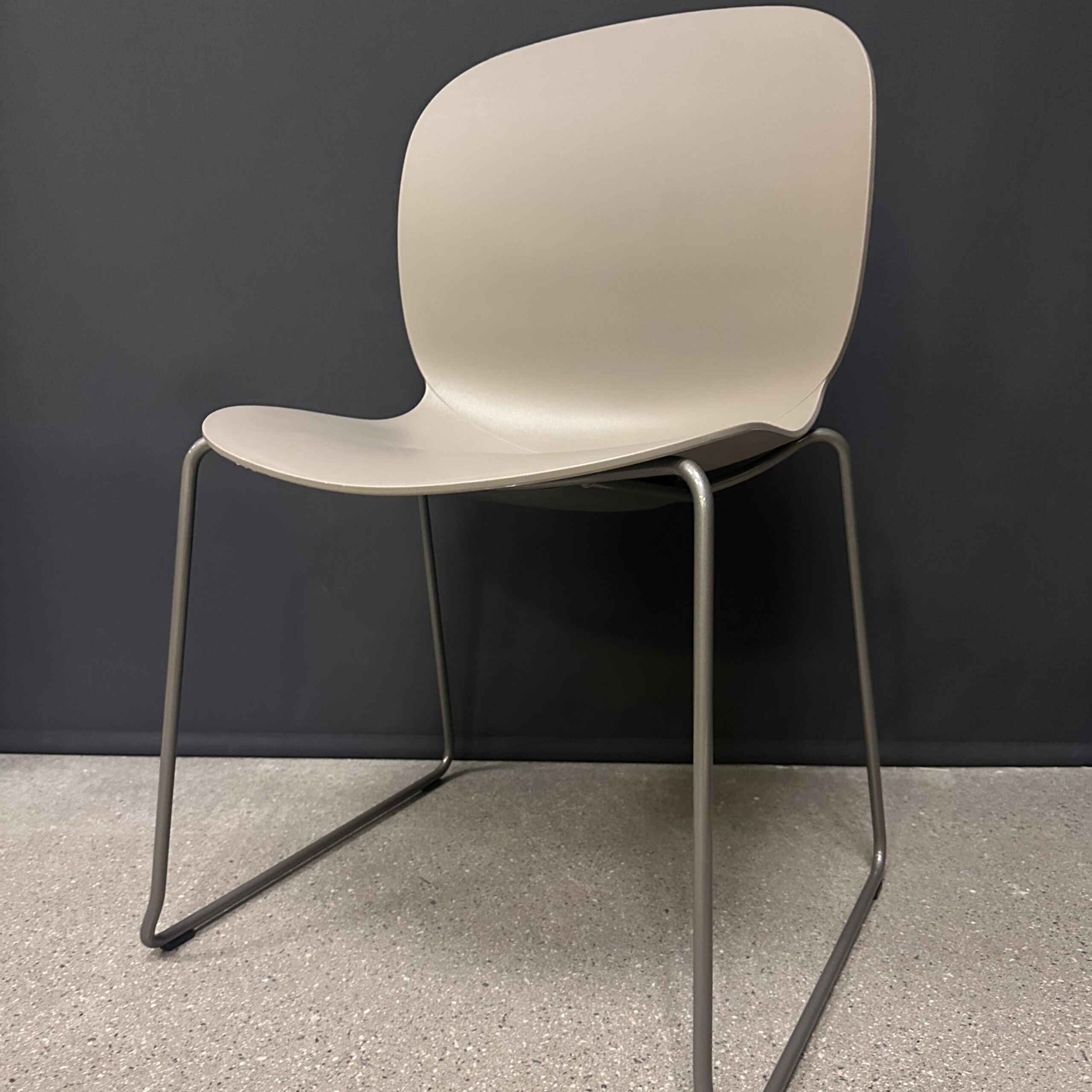Sæde og ryg i plast (grå). Medestel i metal (sølv).