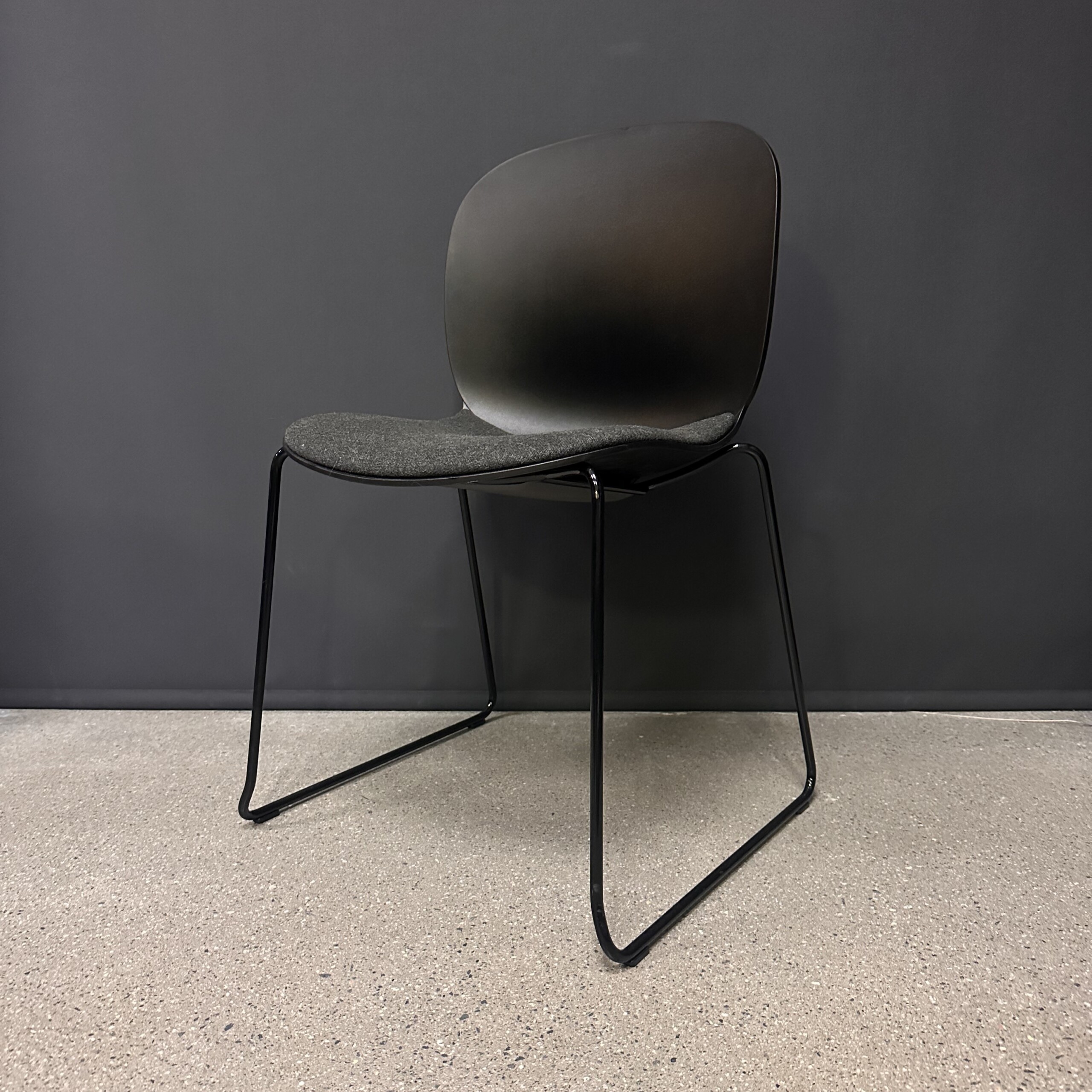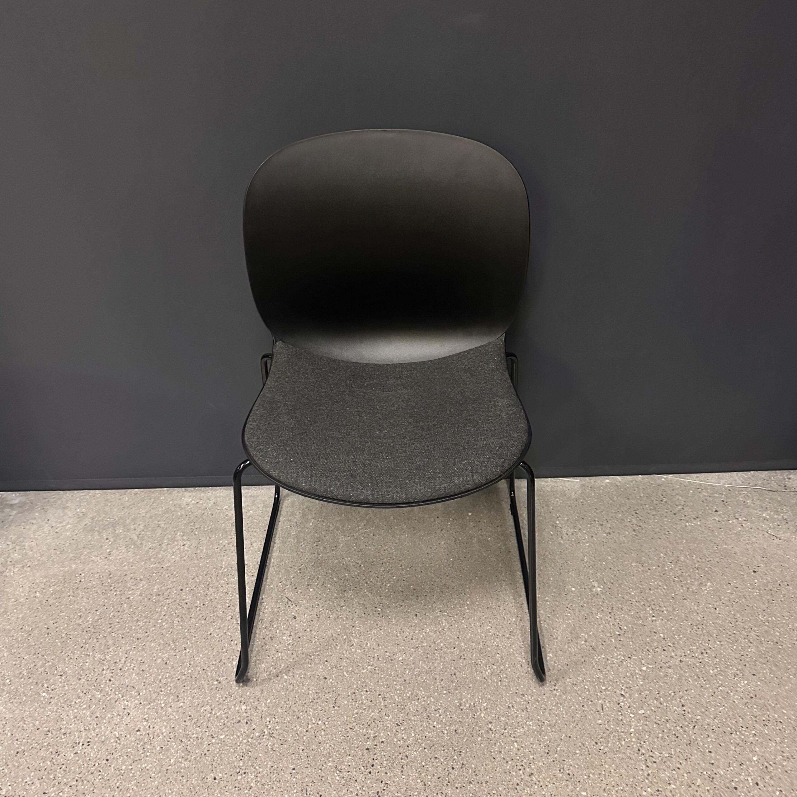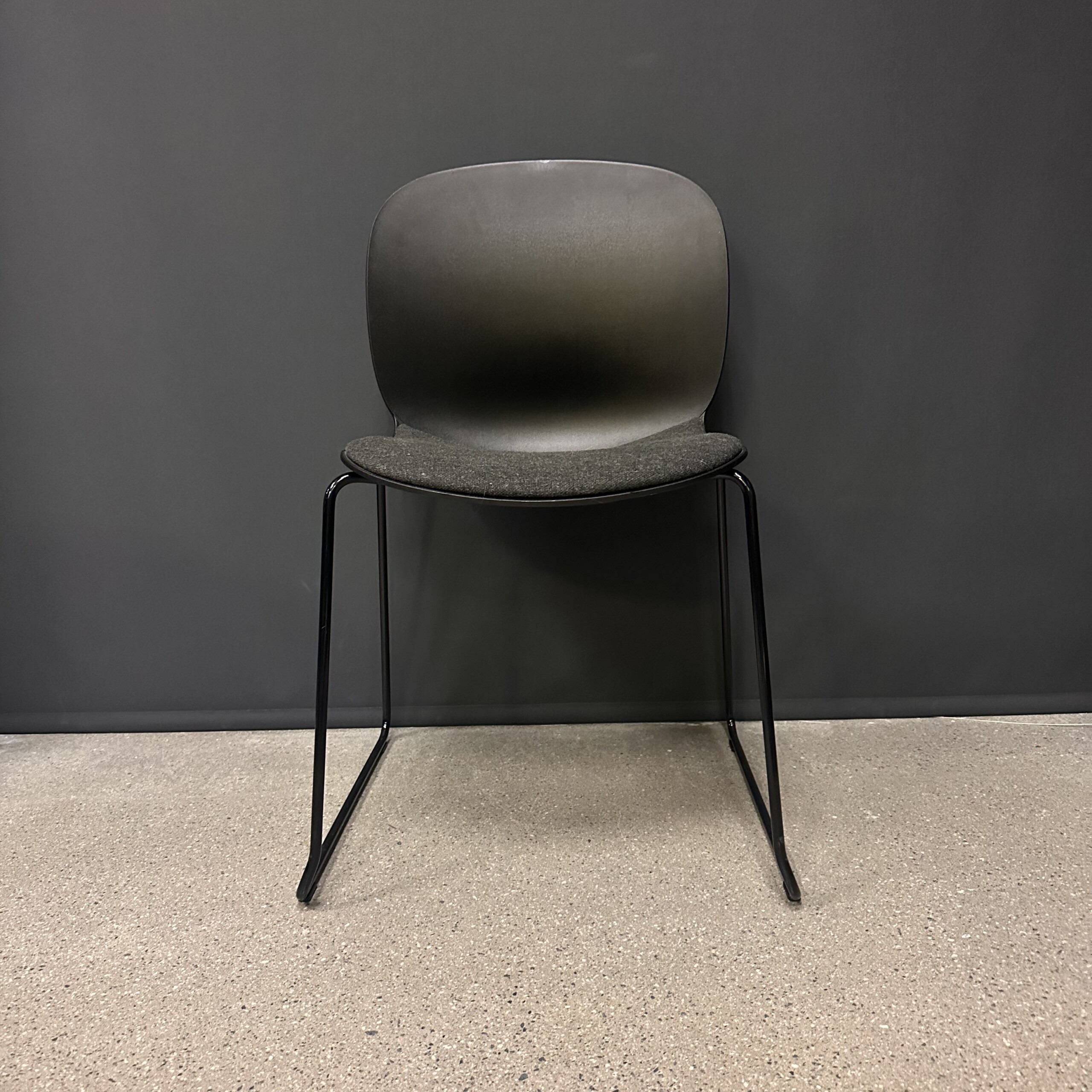 Sæde i stof (grå). Ryg i plast (sort). Medestel i metal (sort).