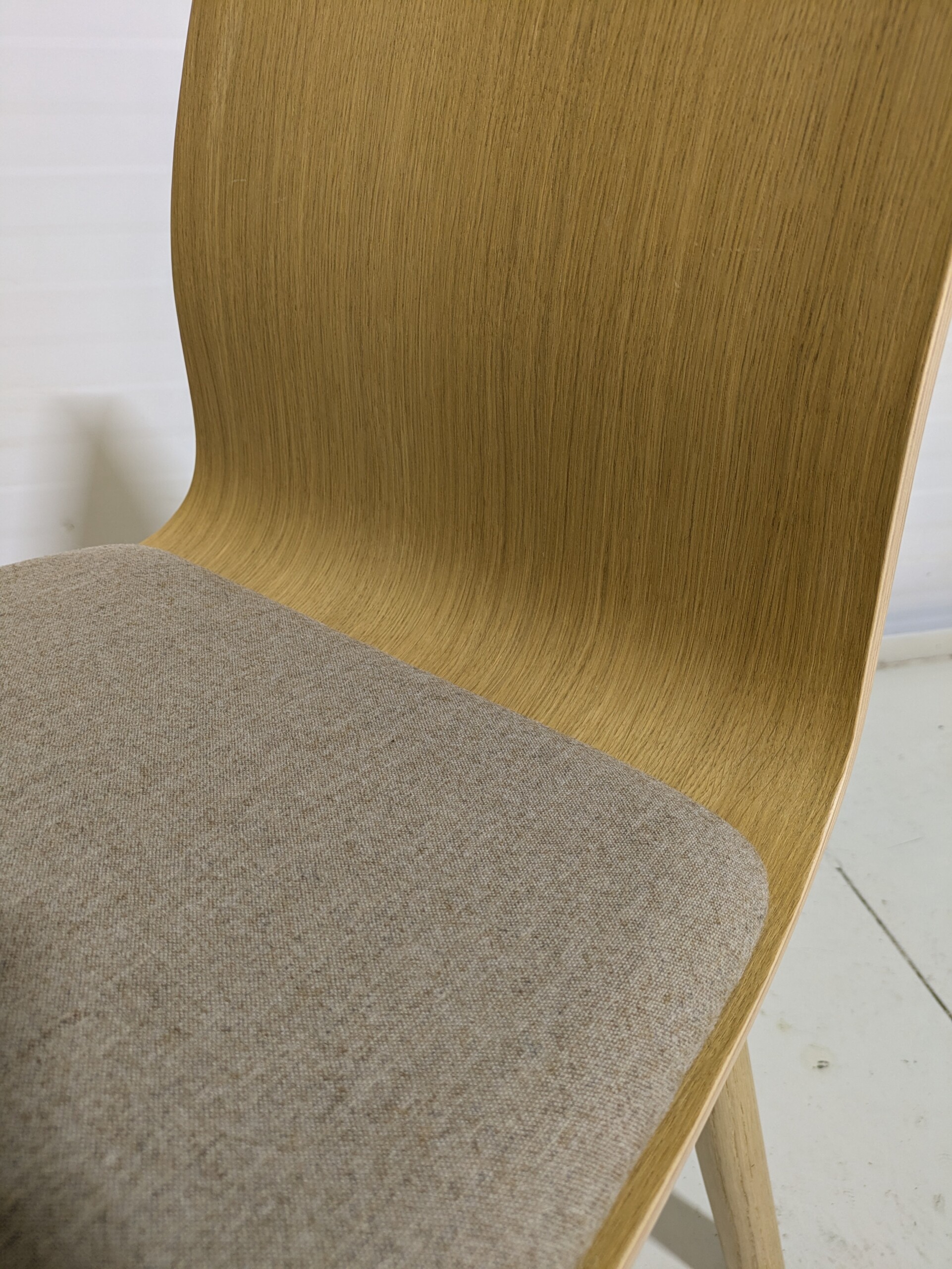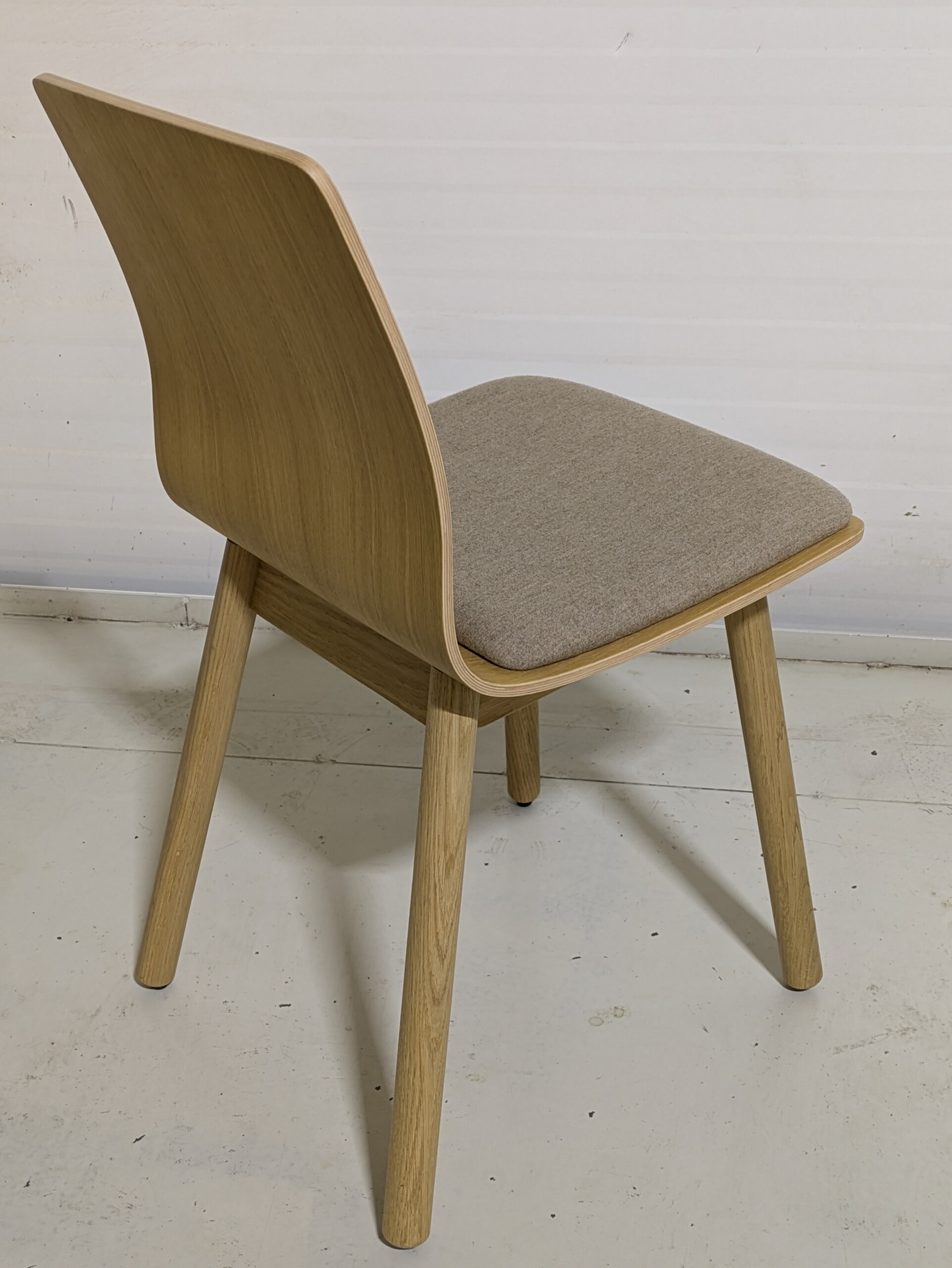 Sæde i stof (beige). Ryg i træ (eg). 4-bensstel i træ (eg).