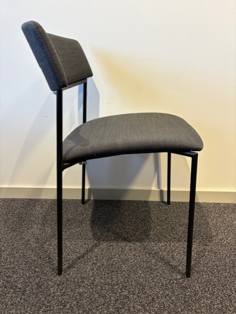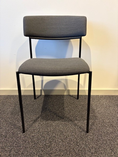 Sæde og ryg i stof (grå). 4-bensstel i metal (sort).