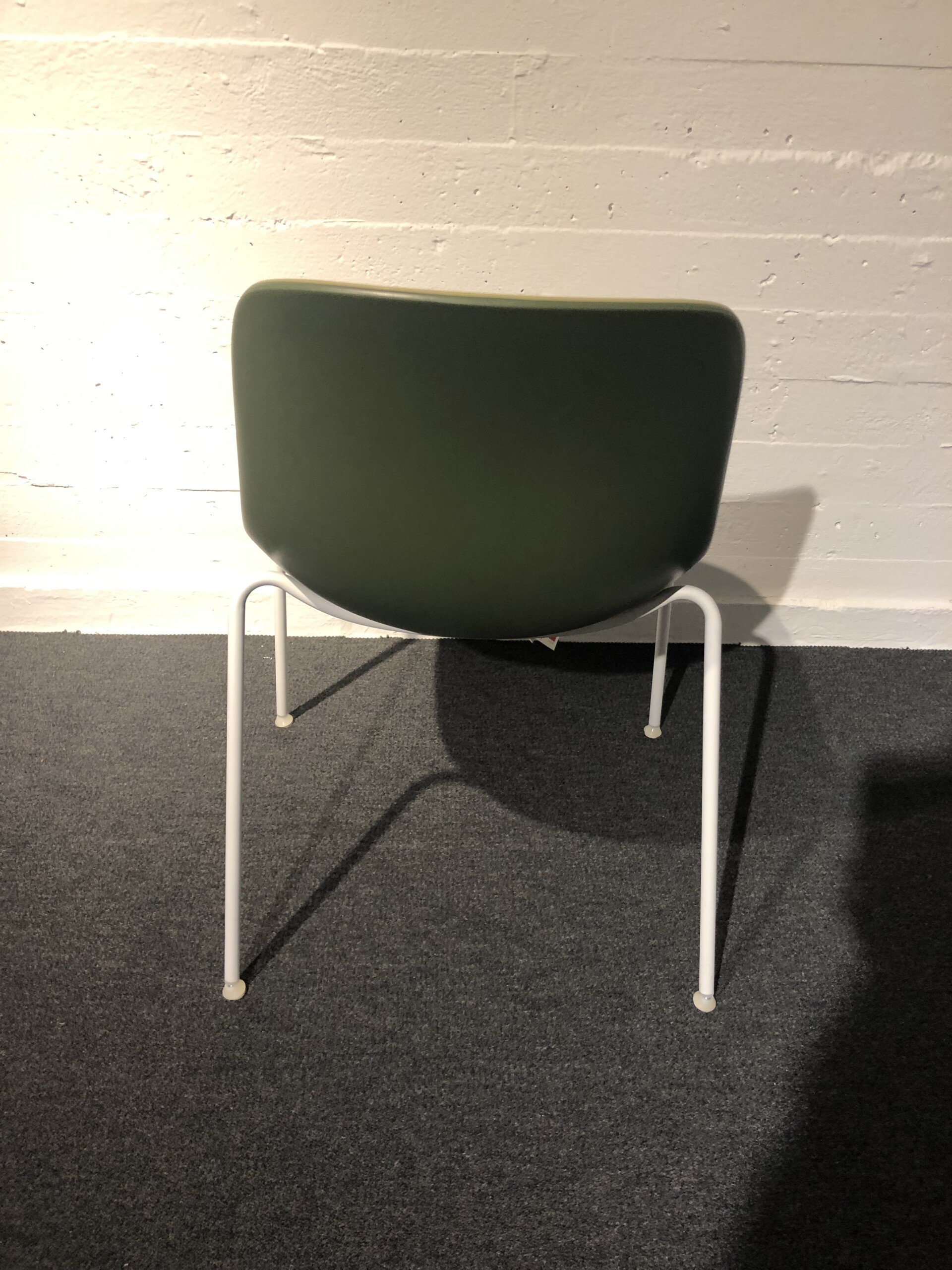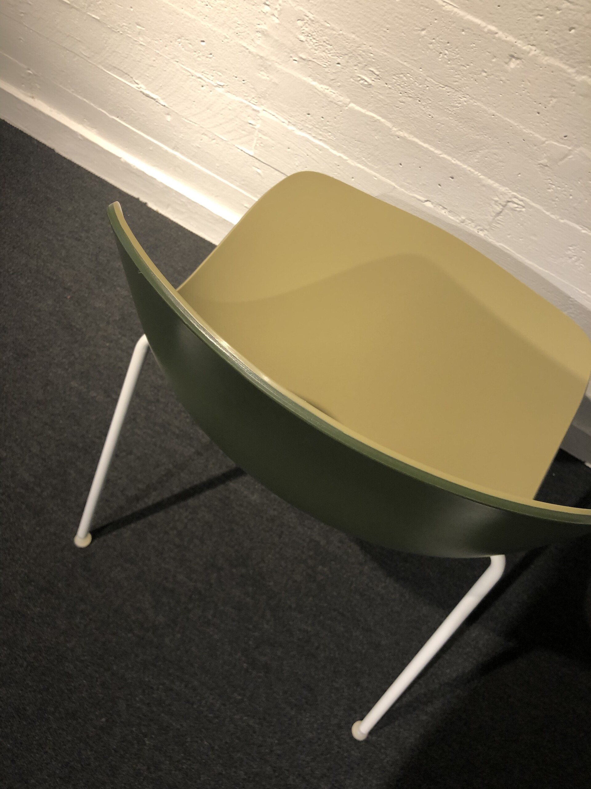 Sæde i plast (gul). Ryg i plast (grøn). 4-bensstel i metal (hvid).