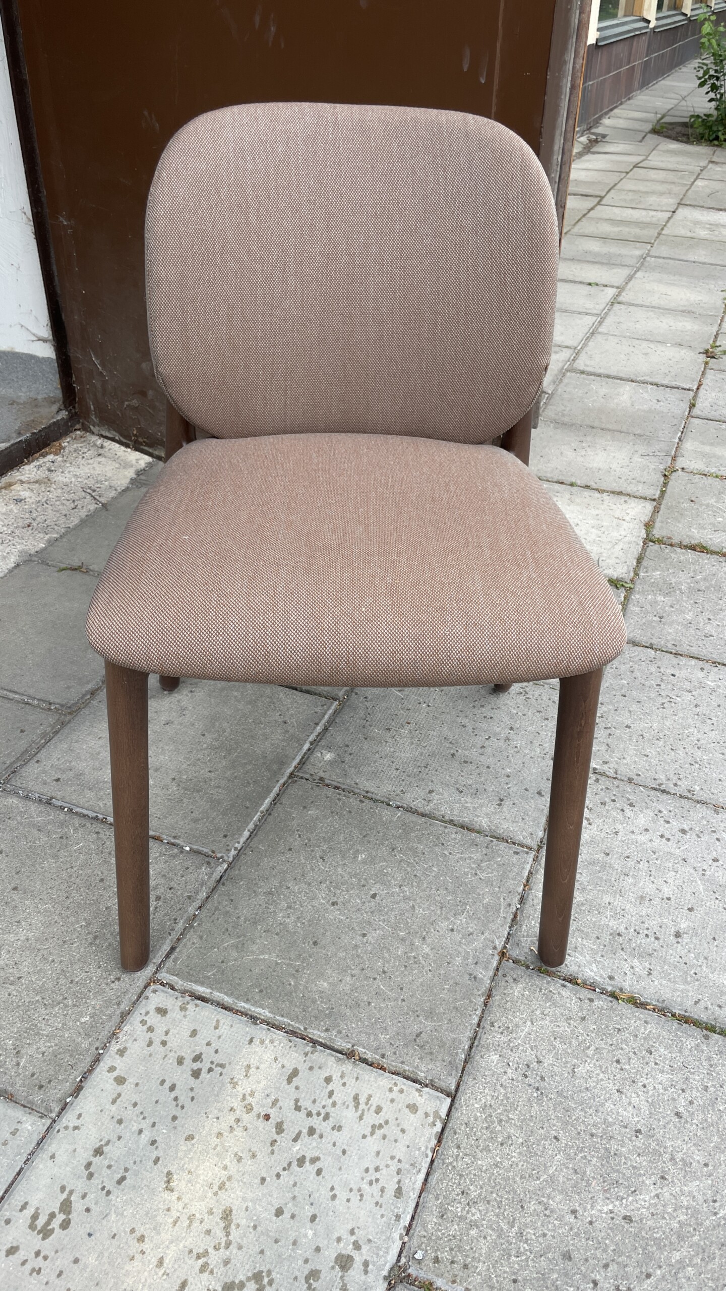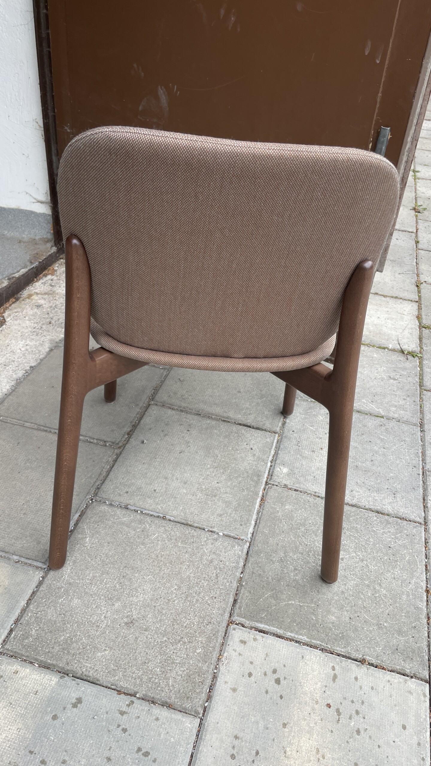 Sæde og ryg i stof (grå). Fodkryds i træ (eg).