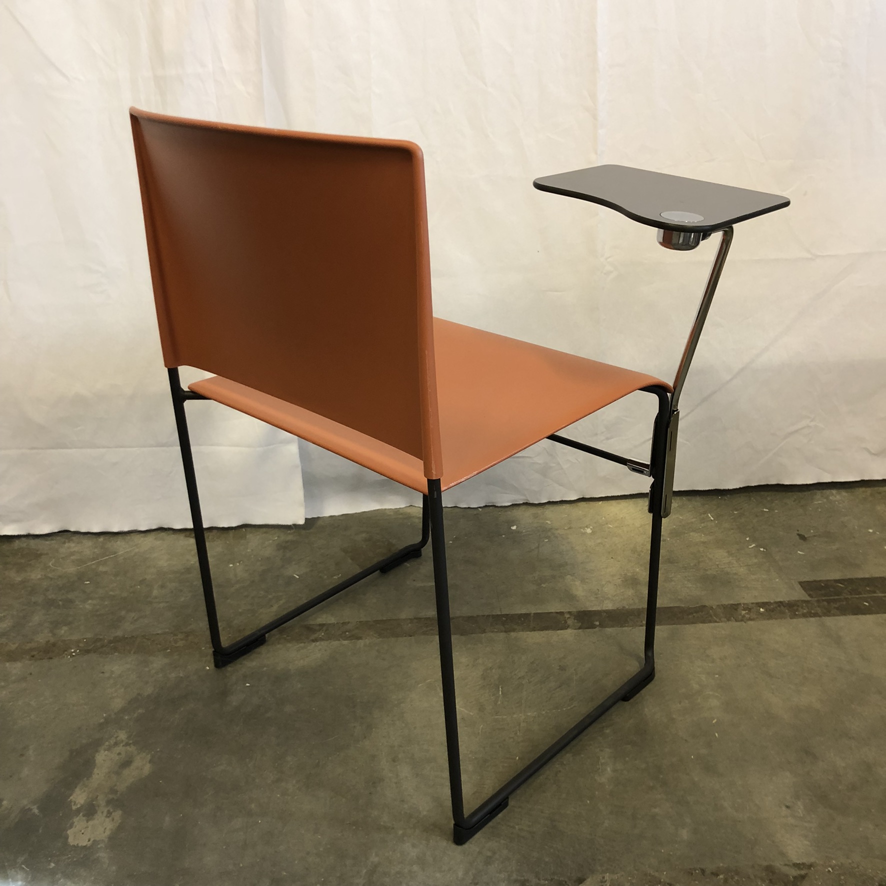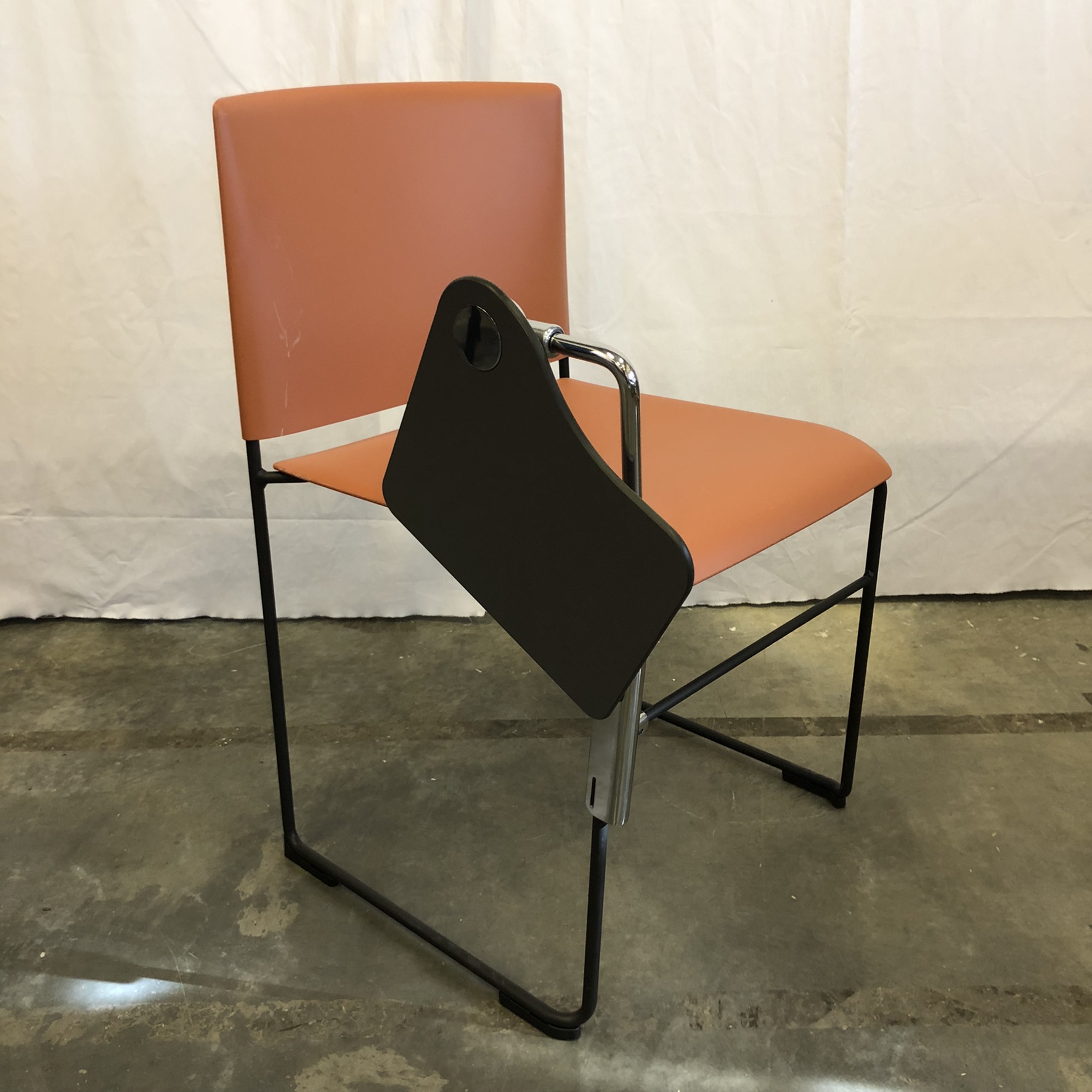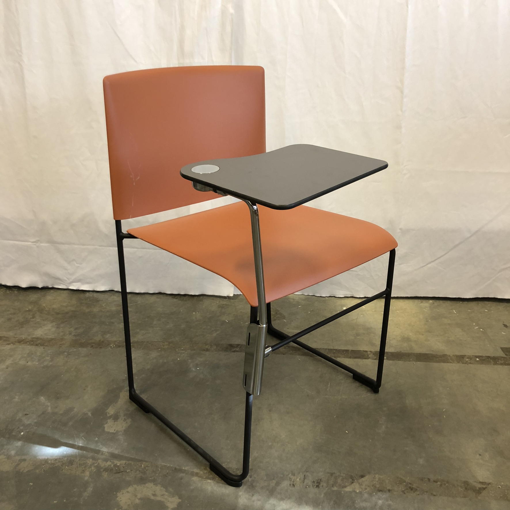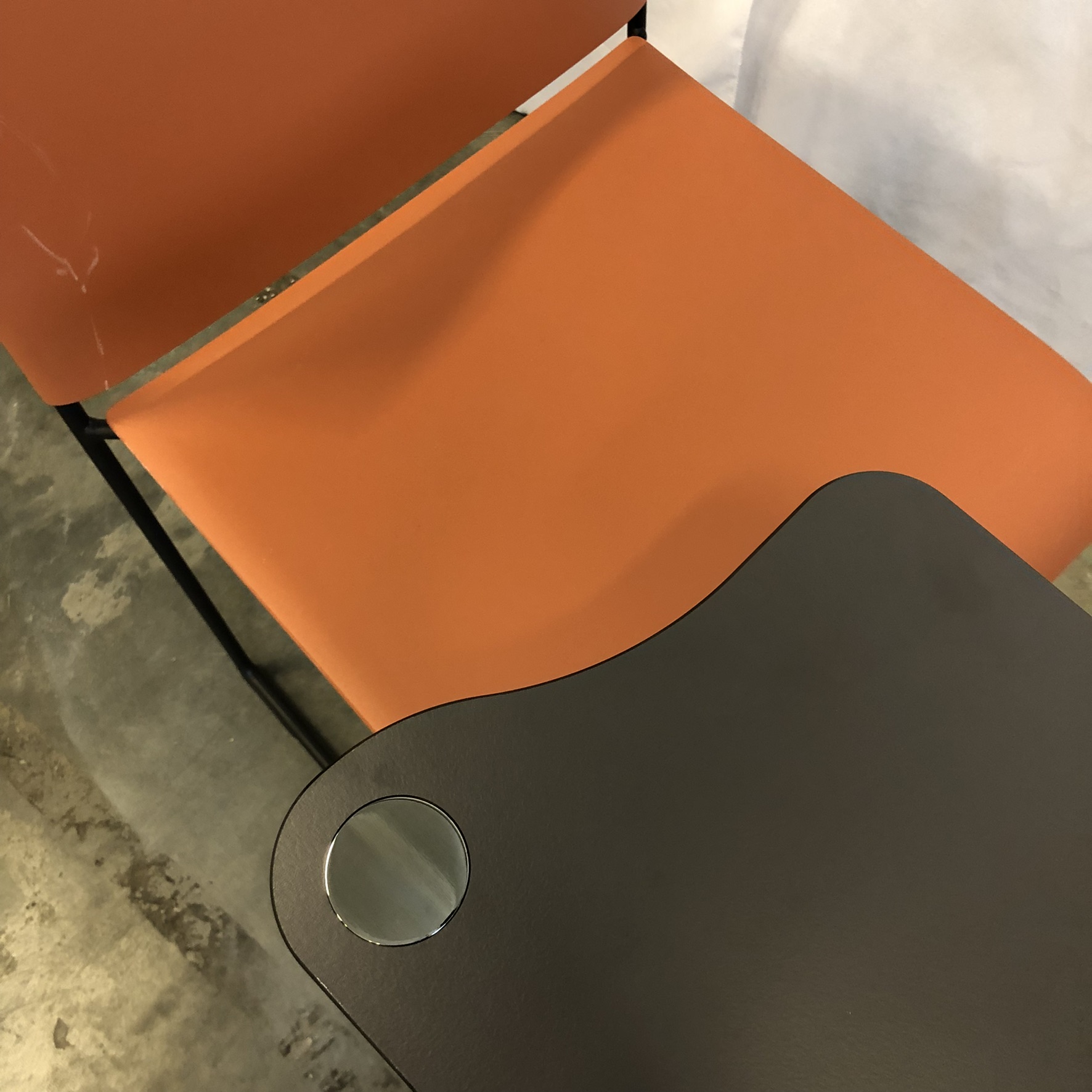 Sæde og ryg i plast (orange). Medestel i metal (sort).