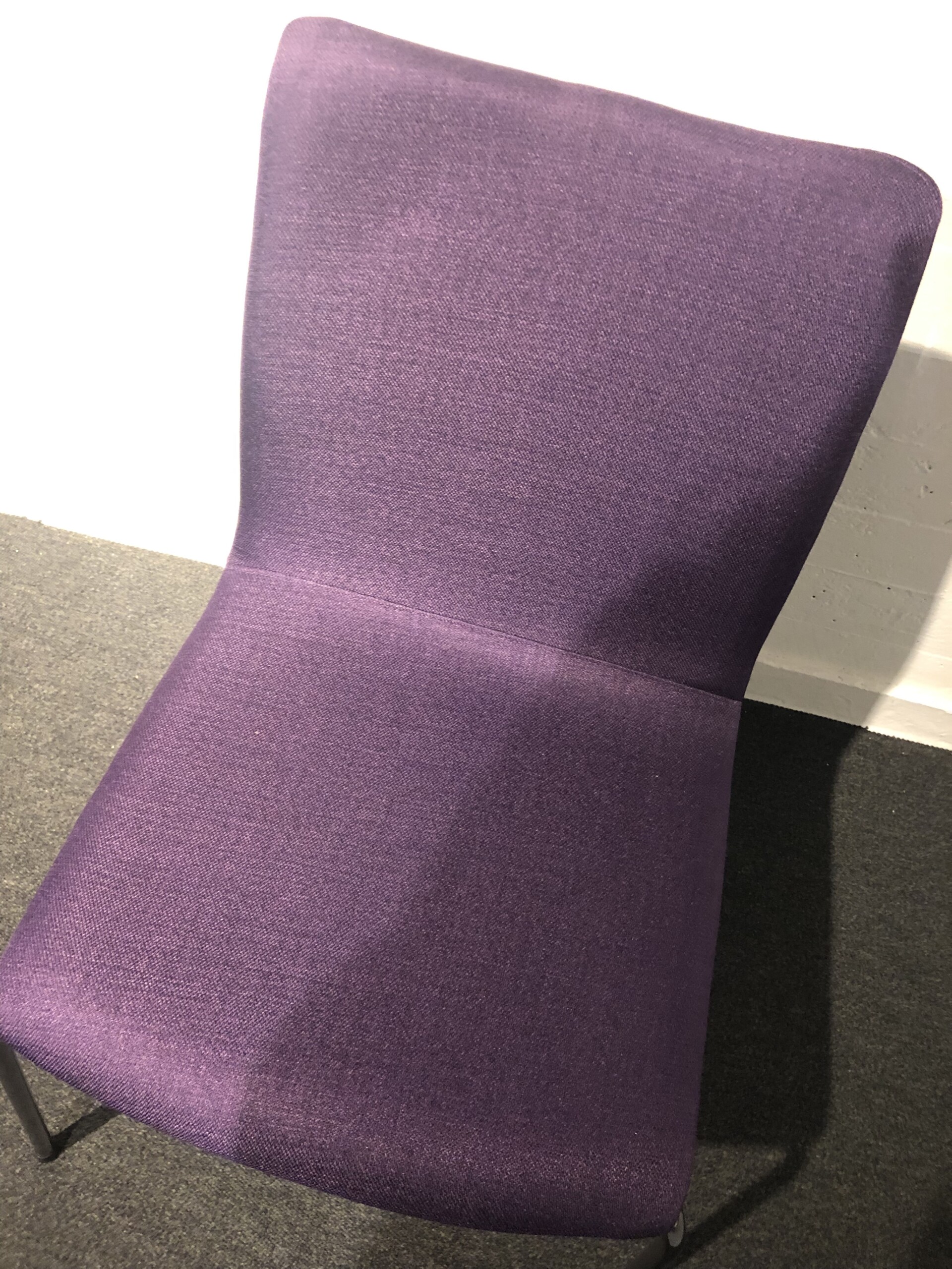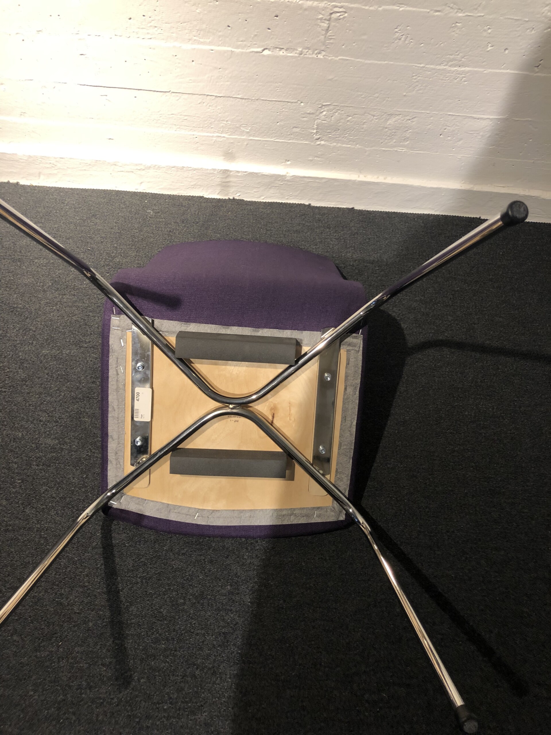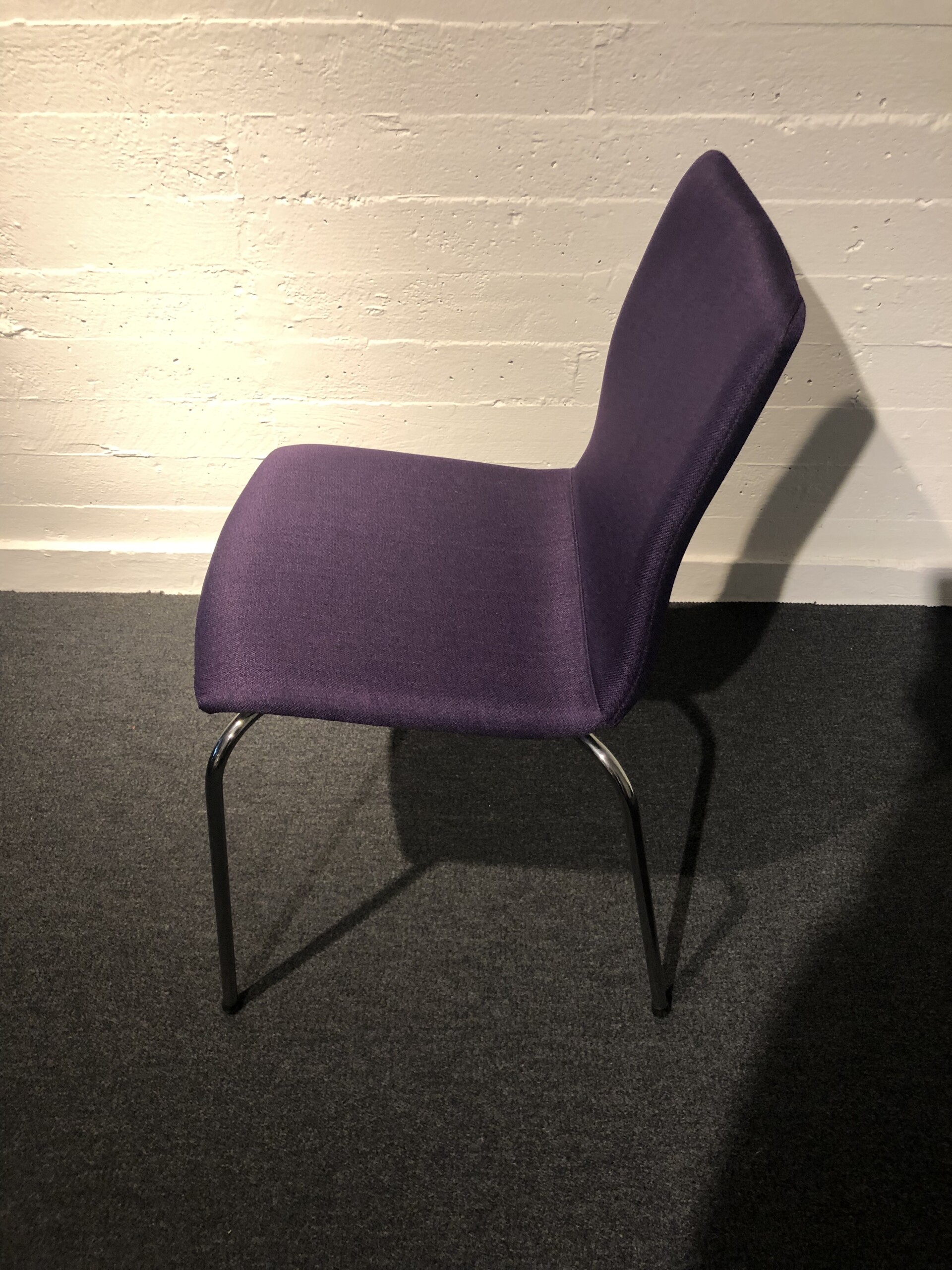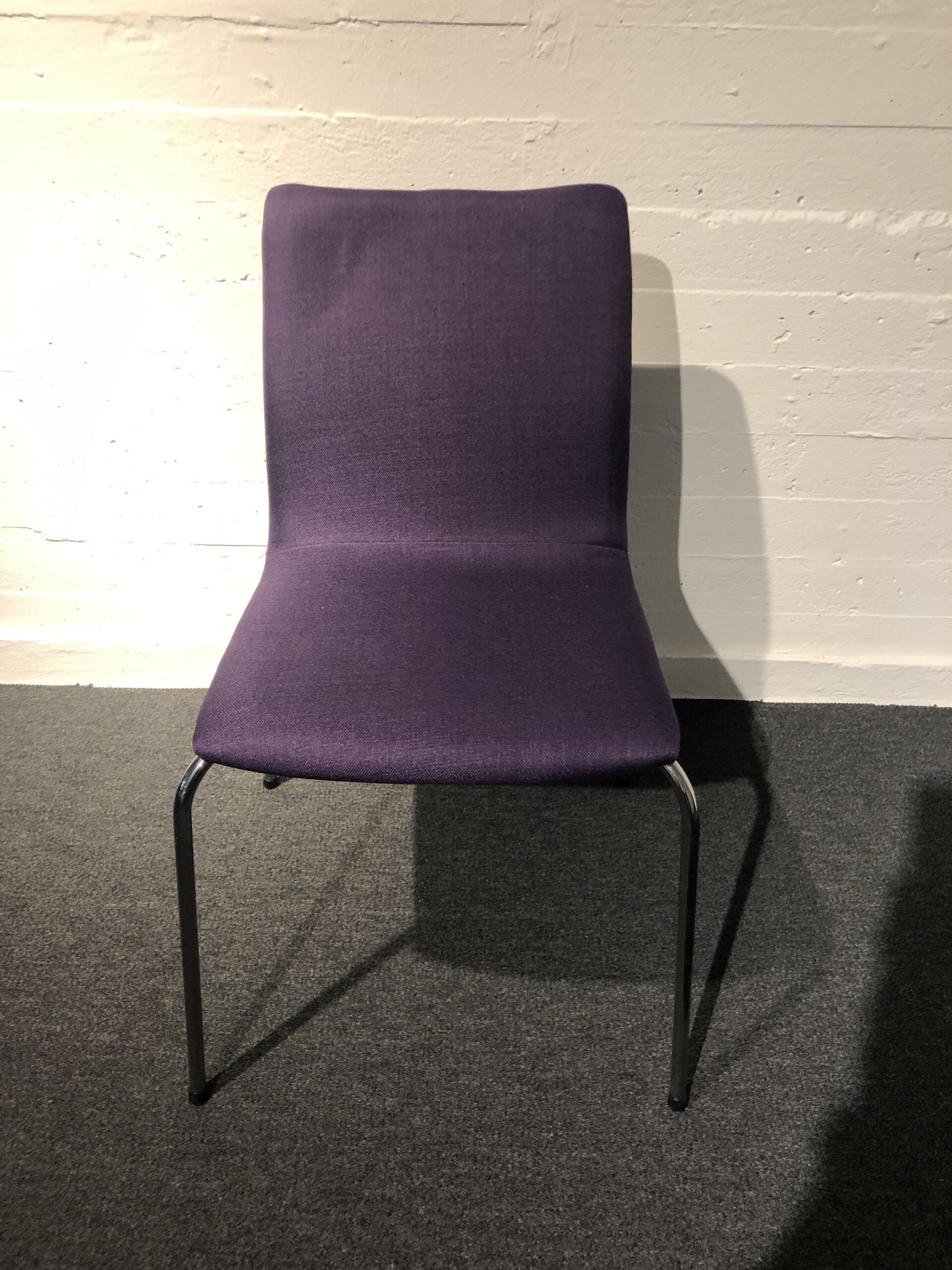 Sæde og ryg i stof (lilla). 4-bensstel i metal (krom).