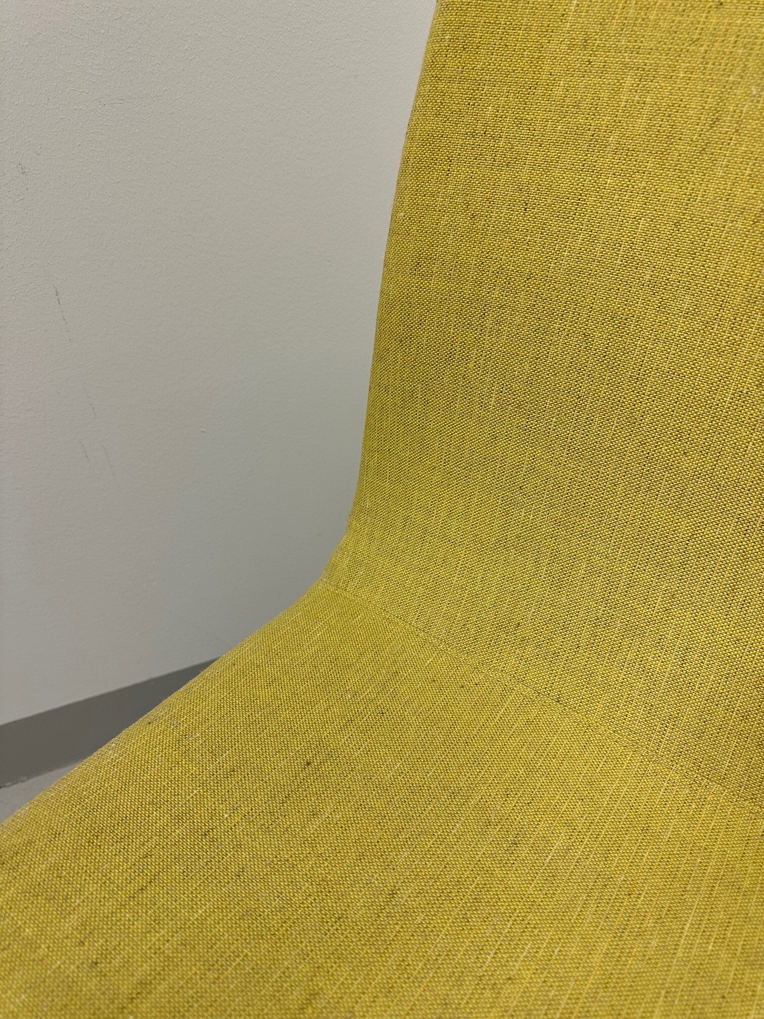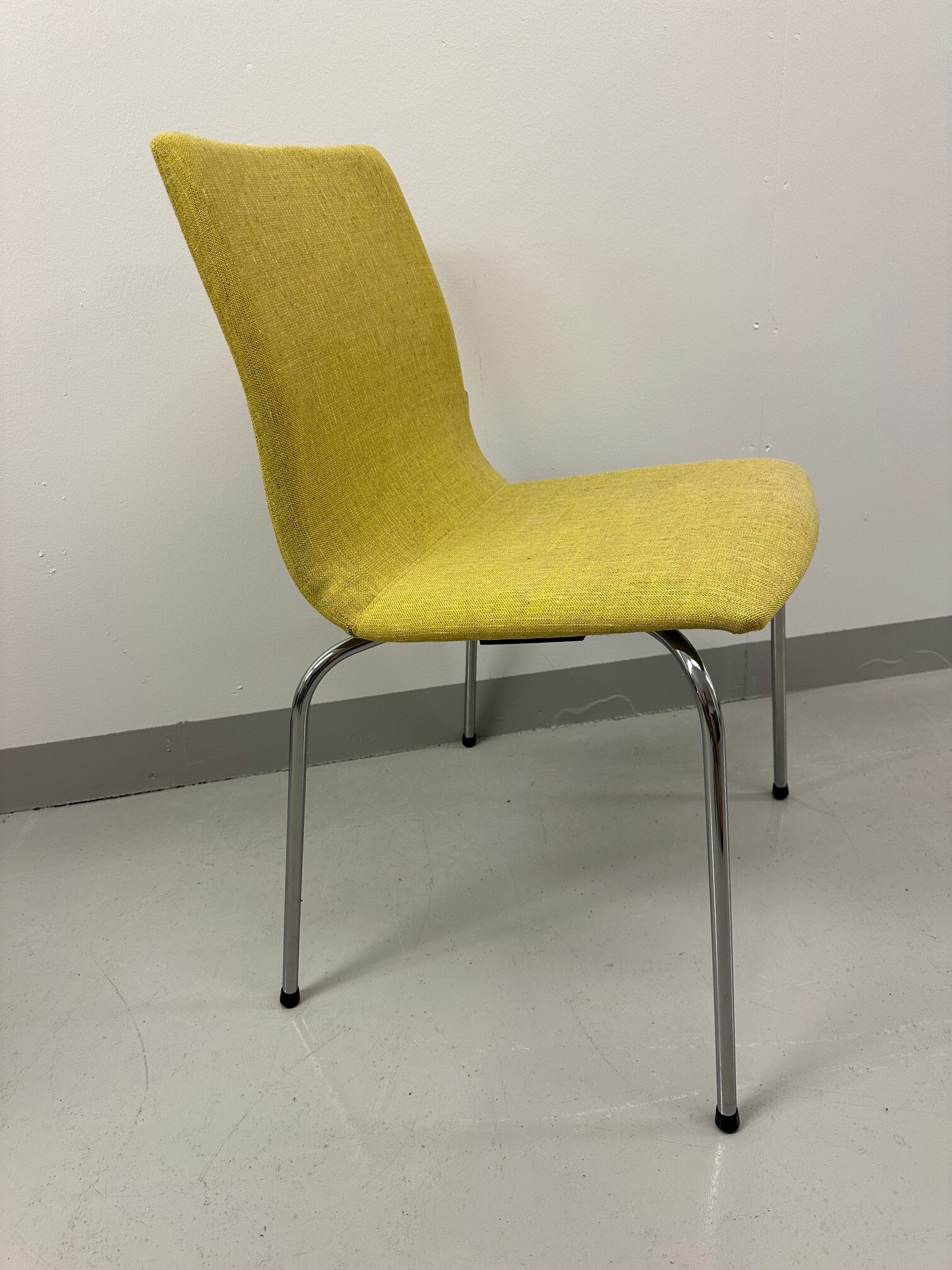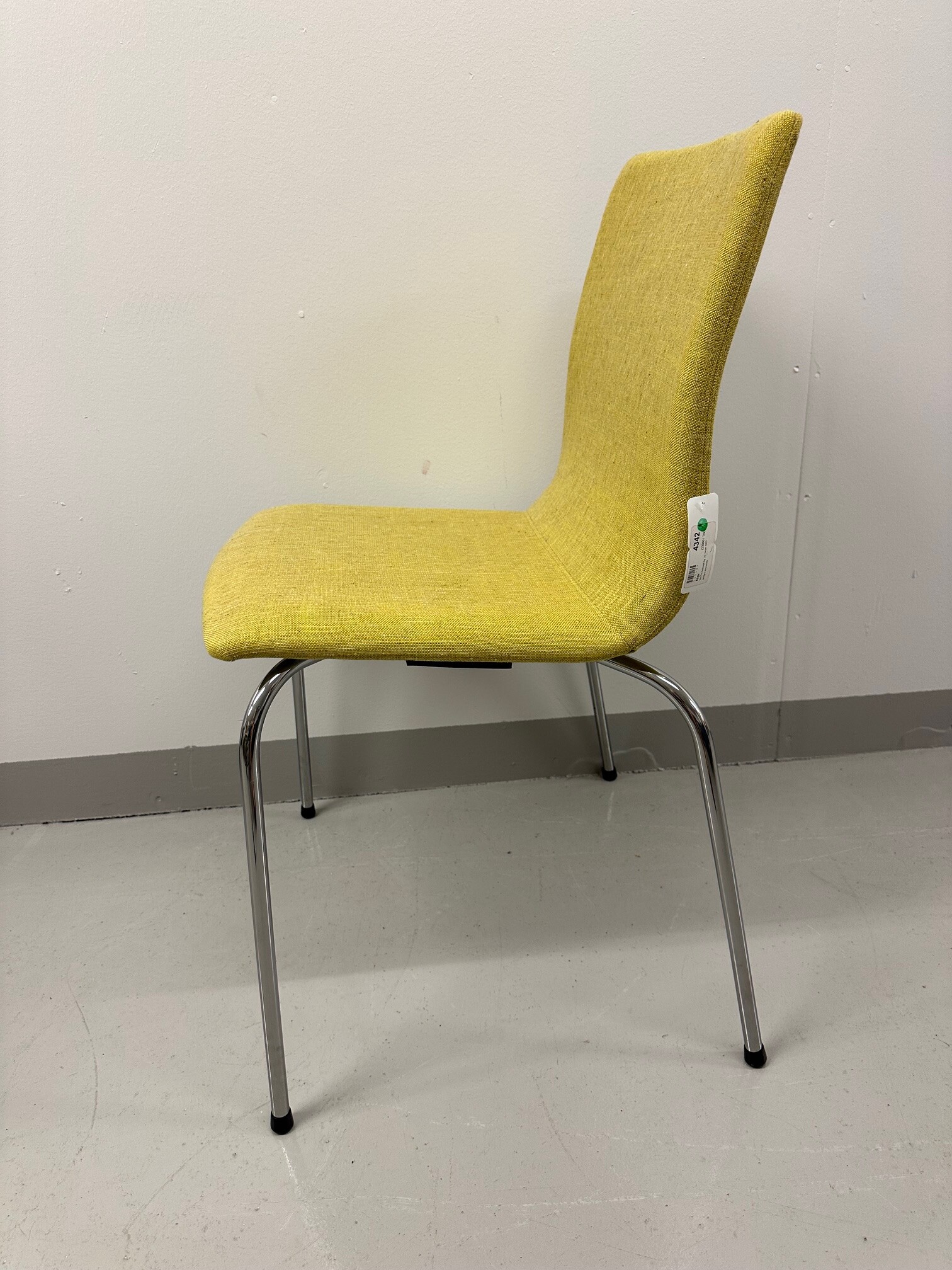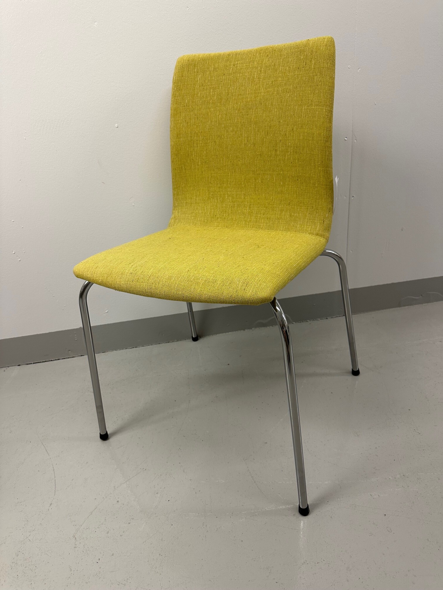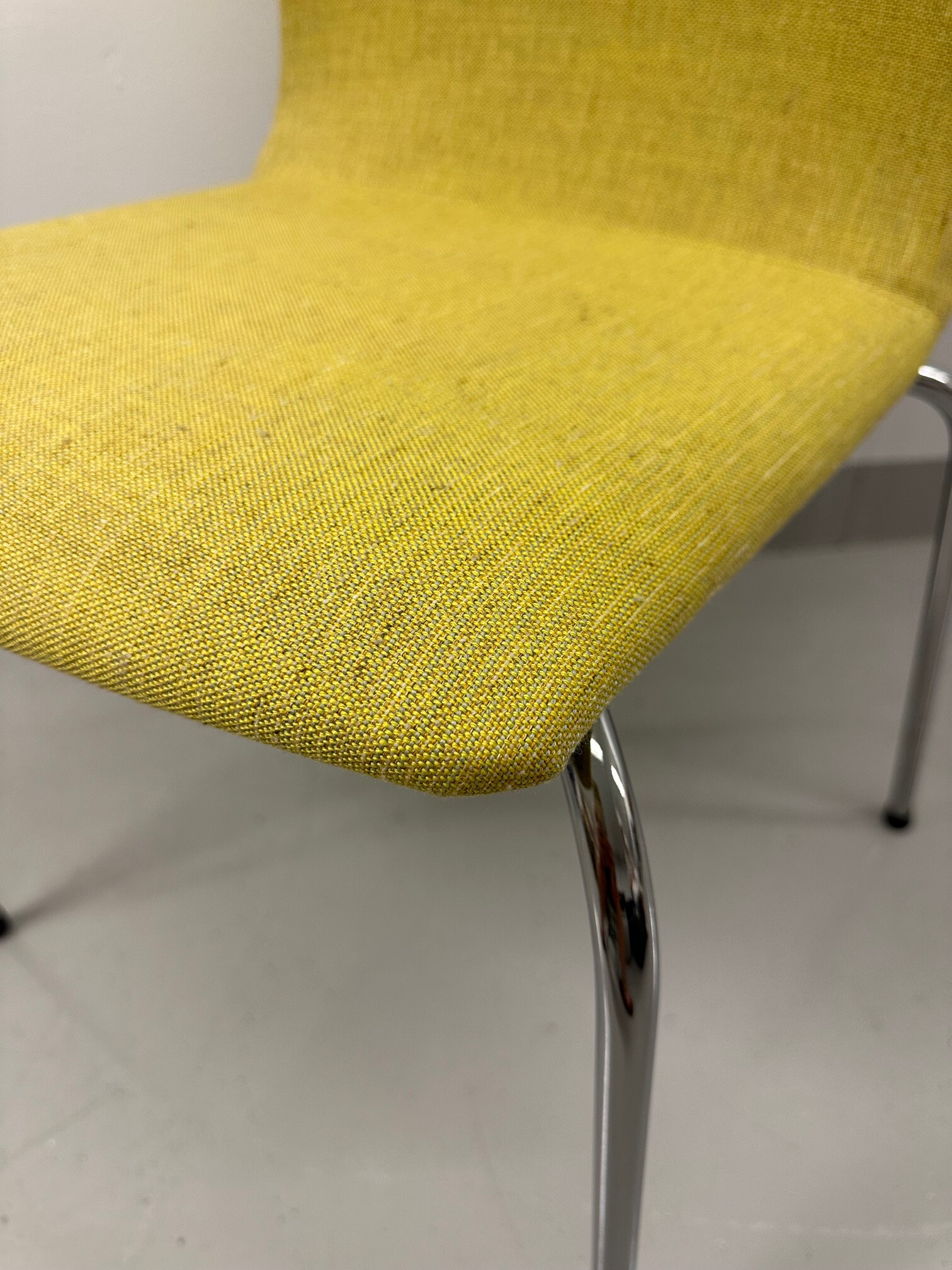Sæde og ryg i stof (gul). 4-bensstel i metal (krom).