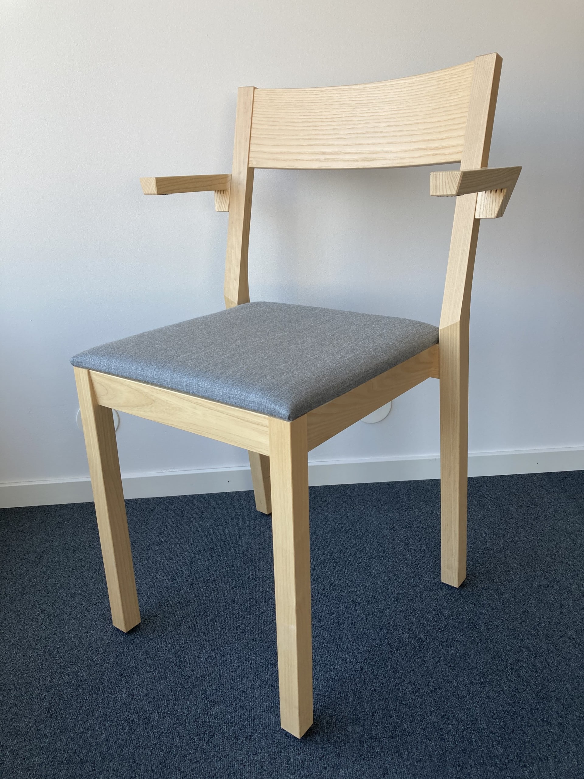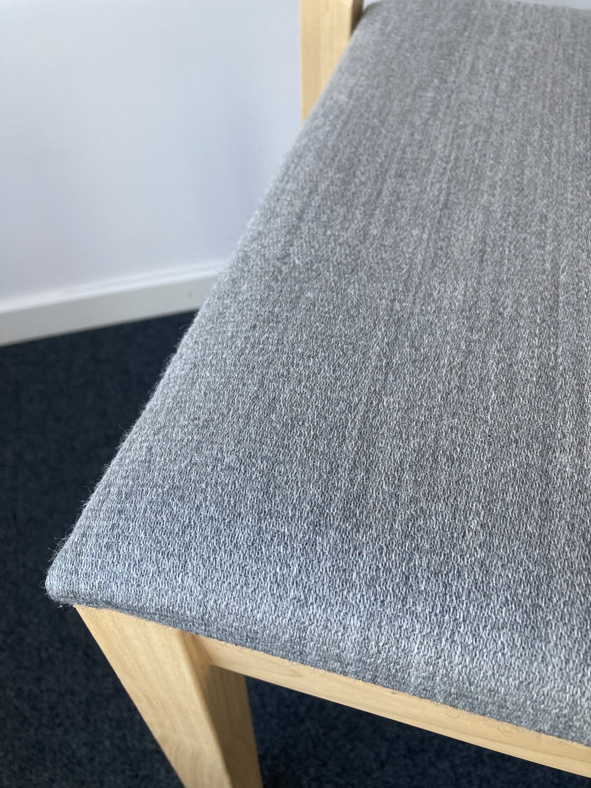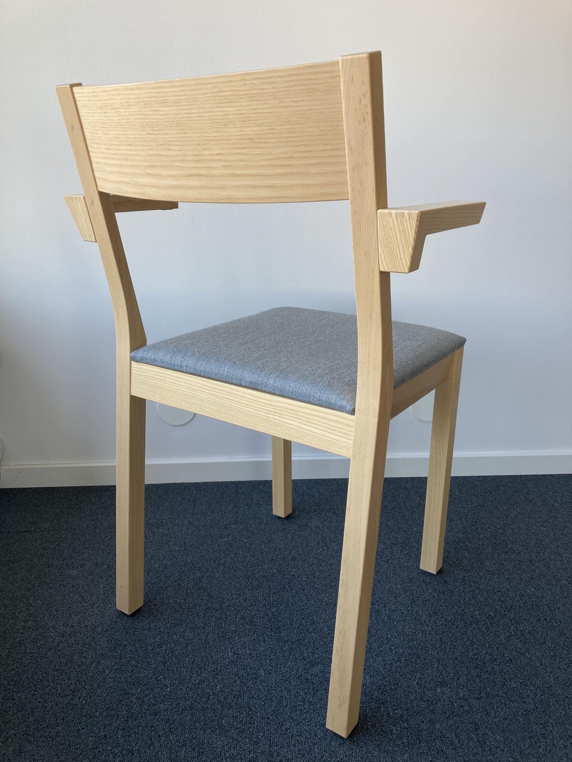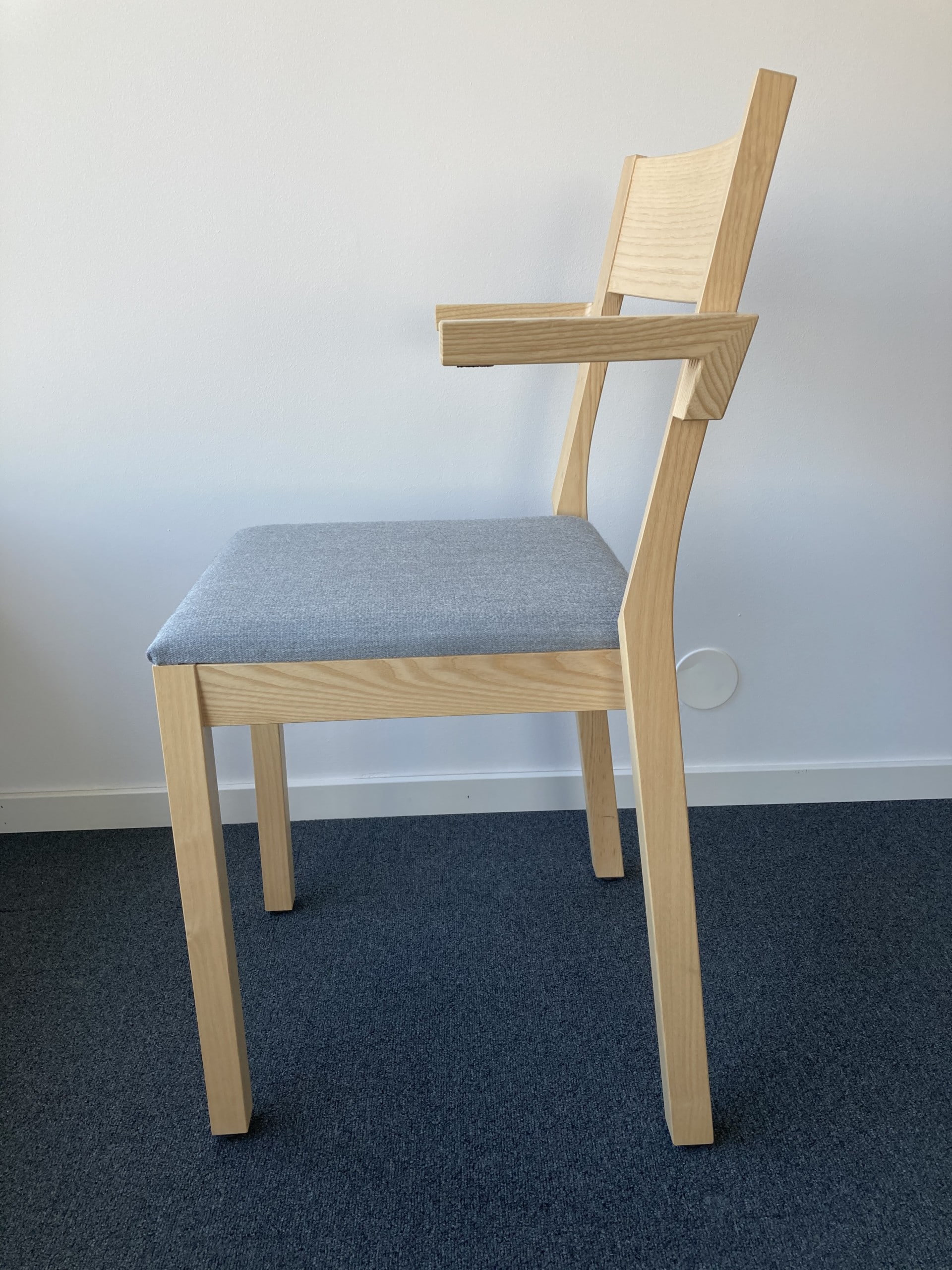 Sæde i stof (grå). Ryg i træ (ask). 4-bensstel i træ (ask).
